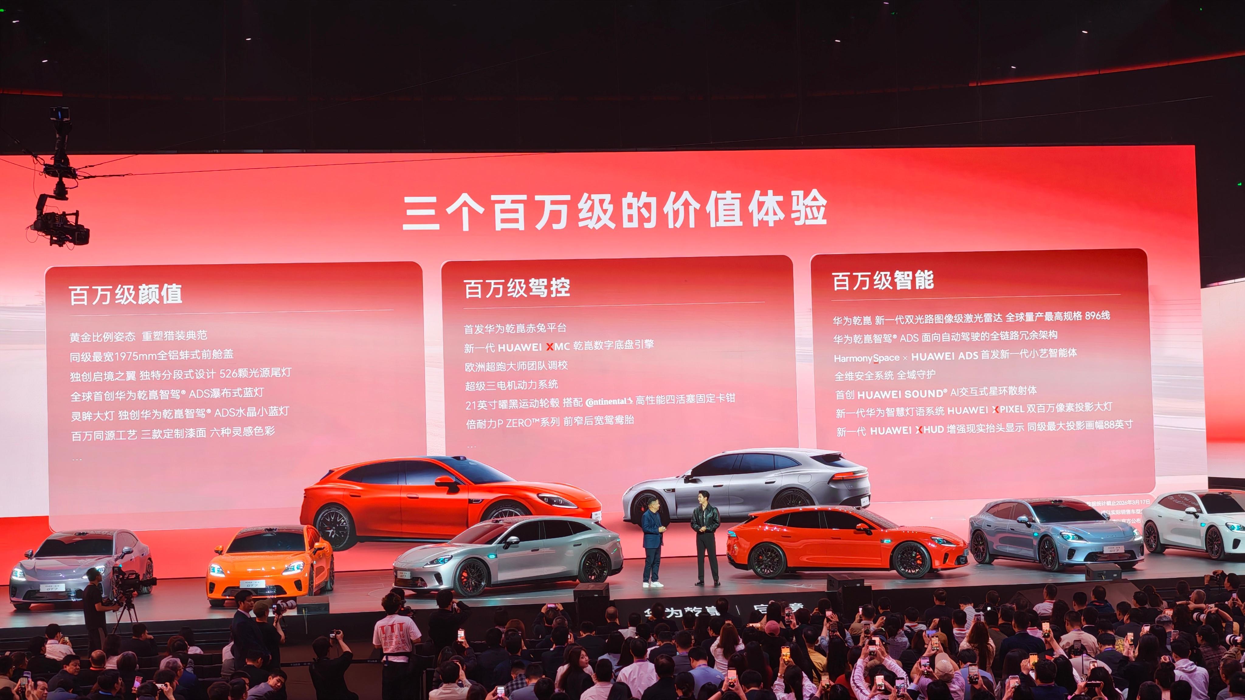 - 车身尺寸 5050x1980x1470 mm,轴距 3 米,前255 / 后275- 首发新一代小艺智能体- 首发华为乾崑赤兔平台- 首创 HUAWEI SOUND AI 交互式星环散射体- 搭载三电机动力系统、 全球量产最高 896 线激光雷达,全系标配华为乾崑智驾 ADS- 华为新一代 HUAWEI XHUD 增强现实抬头显示,是同级最大投影的 88 英寸画幅- 华为乾崑x启境x宁德时代打造的新一代麒麟电池…十大黑科技,华为乾崑全家桶All in,六大配色,酷吗同时也开启盲订喽~