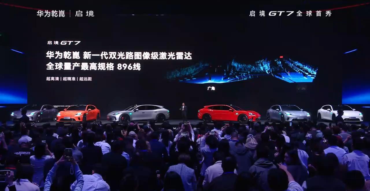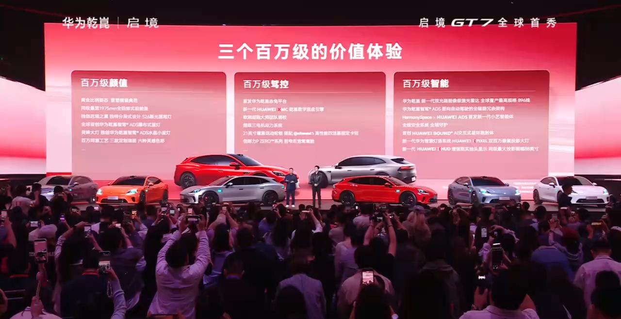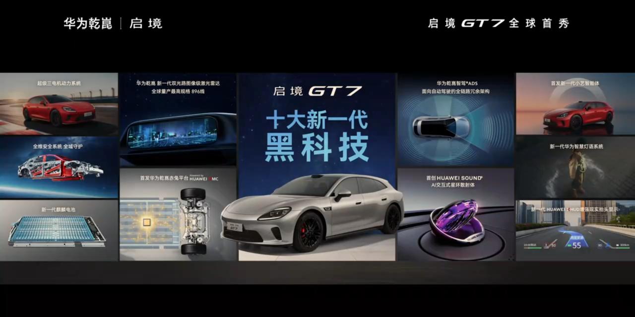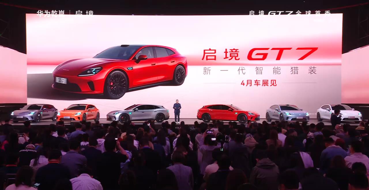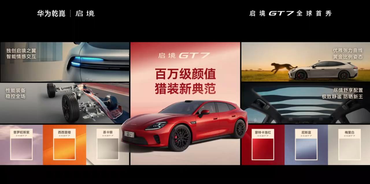 能叫GT的都有点东西!启境首款猎装车启境GT7迎来首秀,并开启999元限时新品预定权益,享4重重磅权益,4月北京车展还会跟大家见面。启境计划5月底在76座城市,建成300家门店,主要聚焦在一二线城市的商圈。 新车的颜值还是很在线的,一登场大家都在拍照,标志性的大屁股,无边框车门,这次特意提到了车身比例,现场PK超跑,作为新能源还是四门版,姿态拿捏的挺对味了。个性化上也给足了选择,三种定制车漆,六种车身颜色,个人觉得还是红色更有味道。 配置方面,瀑布式小蓝灯、双百万智慧投影大灯、2.2平米全景调光天幕都会上车,首发新一代小艺智能体,华为提供智能化方案,包括896线激光雷达、鸿蒙座舱和数字底盘等,广汽则负责制造和品控。 性能层面很下功夫,14处低风阻设计,21英寸熏黑轮圈,四活塞红色卡钳,倍耐力的鸳鸯胎,后轮宽度来到了275,三电机布局,运动化的底盘调校,现场靳总透露,弯道、跑山、麋鹿测试成绩都很好,具体参数和成绩下次公布。最后再来个新车预告,第二款车型定位中大型SUV,年内发布,评价为:空间气场拉满。以三年为周期,启境会带来更多新品,小小期待一下。 特邀嘉宾黄景瑜还空降现场,官宣成为启境全球品牌代言人,给大家预定了共创版本。燃油车时代的GT代表性能,旅行时开着舒服就行,我觉得新车则是通过智能化,赋予GT了更多场景和内涵,此GT非彼GT,不变的是性能没有妥协,颜值依旧是年轻用户喜欢的,启境,很起劲儿!【来自懂车帝车友圈】