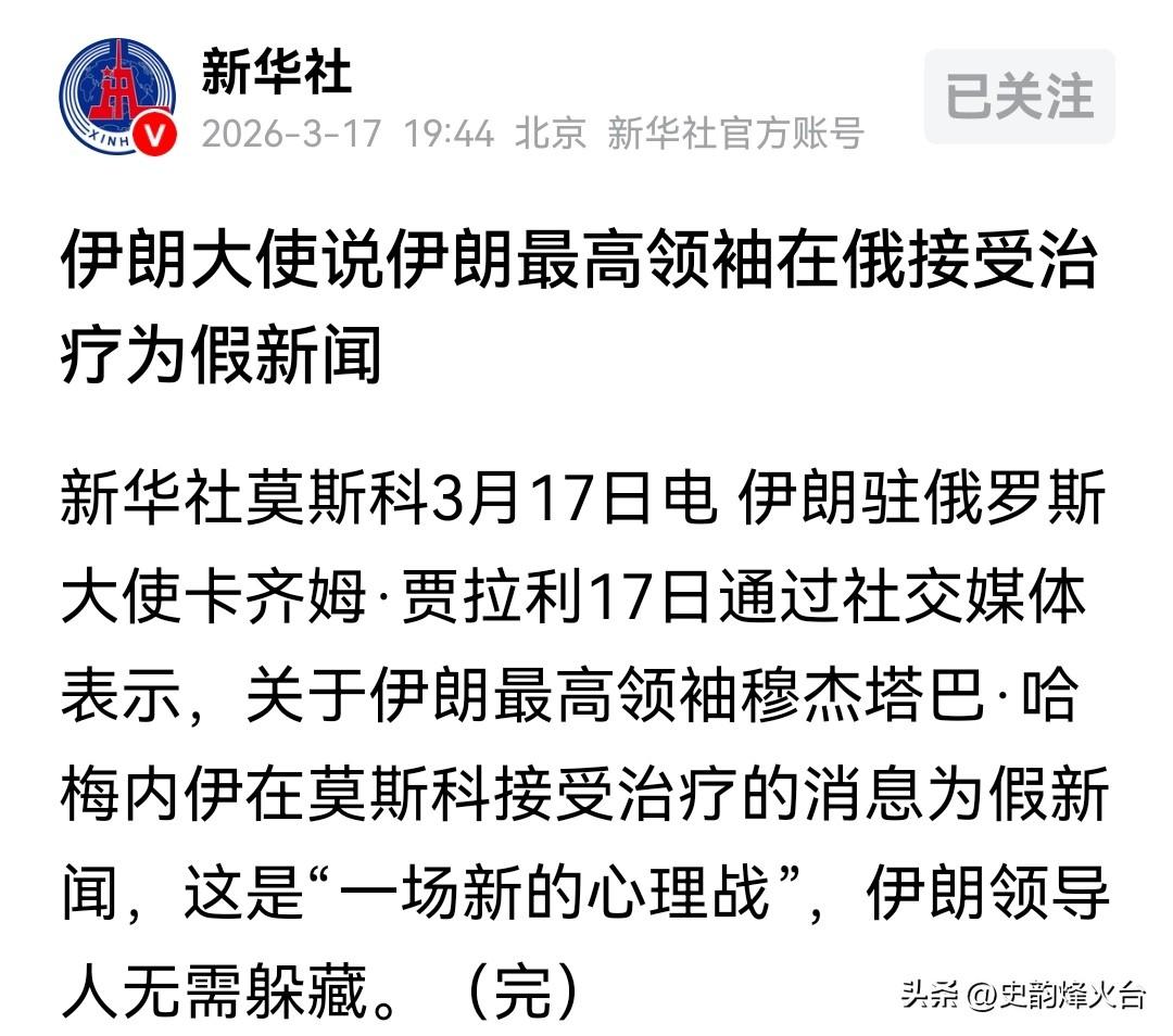 就在刚刚,莫斯科传出一条备受关注的消息。 3月17日,伊朗驻俄罗斯大使卡齐姆·贾拉利通过社交媒体直接发声,驳斥了关于伊朗最高领袖在莫斯科接受治疗的说法,直言这是假消息,是一场新的心理战,还特意强调,伊朗领导人不需要躲躲藏藏。 这番话说得干脆利落,没有半点拐弯抹角。大使虽然没明说谁在背后散布谣言,但话里的意思已经很清楚:有人想拿这件事做文章,他就索性把话挑明了说。 其实在大使发声之前,这个谣言已经在莫斯科的外交圈子里传开了。本来这几天当地没什么特别的动静,可这个谣言突然冒出来,还说得有鼻子有眼的。有人说亲眼看到穆杰塔巴·哈梅内伊的专机降落在莫斯科机场,传着传着,就变成了最高领袖已经住进莫斯科的某家医院接受治疗,连病房、安保都安排妥当了,就差把病历细节公之于众。 眼看着谣言越传越离谱,伊朗驻俄大使立刻站出来澄清,话说得也格外硬气。那句“伊朗领导人不需要躲藏”,说白了就是在表态:我们行事光明正大,谁也别想往我们身上泼脏水。 不少了解局势的人私下里都在说,这个谣言选在这个时候冒出来,根本不是巧合。眼下中东局势正紧,伊朗和西方国家的关系一直绷着,核问题的谈判卡在原地进退两难,国内的经济压力也不小。 这时候传出最高领袖跑到莫斯科治病的说法,明里暗里就是在暗示伊朗的领导层撑不住了,要躲到俄罗斯去。要是这个谣言真的传开,不管是军心还是民心,都会受不小的影响。 明眼人都看得出来,这就是一场冲着伊朗来的信息战,有人就是想用这种上不了台面的手段,扰乱伊朗国内的稳定。至于反对的声音,本来就没多少,毕竟这件事本身就离谱得很。 穆杰塔巴·哈梅内伊要是真的来莫斯科治病,得是多大的阵仗,怎么可能瞒得住所有人。两边其实都心里有数,这就是场心理战,谁先信了,谁就先输了。 这件事一出,那些一直关注伊朗局势的分析人士、记者,都忙着回头核对自己的消息源。关于谣言的源头,说法五花八门:有人说最先是从中东某国的社交媒体账号传出来的,有人说源头在西方,还有人说,这就是某些势力故意放出来的风声,就想看看各方的反应。各种说法都有,可谁也不敢打包票,说自己手里的消息就是真的。 和这些五花八门的猜测比起来,伊朗这边的态度格外干脆,直接出面辟谣,没给谣言留半点发酵的空间。大使的这番话,等于把话说死了:别再传了,全是假的,伊朗的领导人就在国内,哪儿也没去。 就在这片真假难辨的信息迷雾里,这条干脆利落的辟谣消息,反倒比谣言本身更让人印象深刻。这场关于“穆杰塔巴·哈梅内伊在莫斯科治病”的谣言,看着荒诞不经,却刚好踩中了信息战的要害。 在这个真假难辨的时代,谣言不需要编得多周密,只要够离奇,就会有人跟着传。伊朗大使这次快速站出来辟谣,不只是为了澄清事实,更是要抢在谣言前面,把事情的真相定下来。谁的说法先被大家记住,谁就占了上风。 这种心理战,拼的就是时间差和大家对事情的认知,你反应慢一步,谣言说不定就被当成了真事。说到底,信息时代的较量,比的从来不是谁的说法更像真的,而是谁能更快、更硬气地把真相说出来,让大家愿意相信。