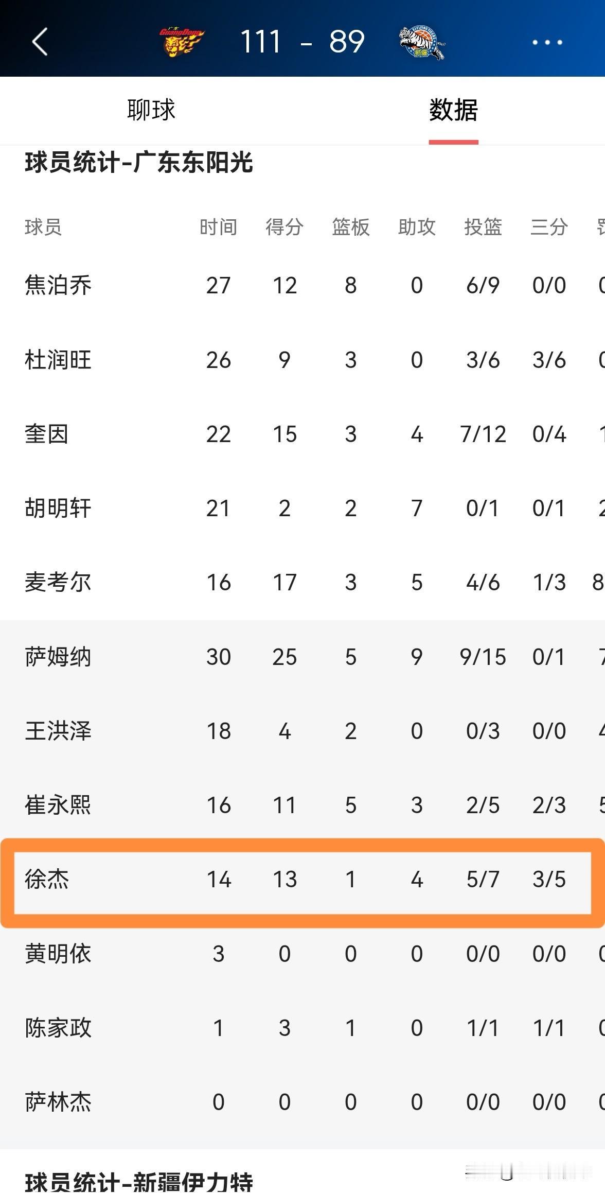广东东阳光巨星徐杰终于恢复正常了!在今天广东东阳光主场以111:89大胜新疆伊犁特的比赛中,最近一段时期一直表现低迷的徐杰终于恢复正常了,真是让人感到由衷的兴奋。 全场比赛下来,徐杰替补出战14分钟,投篮7中5,其中三分球5中3非常高效的砍下13分,还有1篮板4助攻,他的场上正负值为+20。 实事求是的说,随着徐杰状态的好转,以及麦考尔和崔永熙的伤愈复出,广东东阳光正式迎来了本赛季开赛以来的最强阵容。