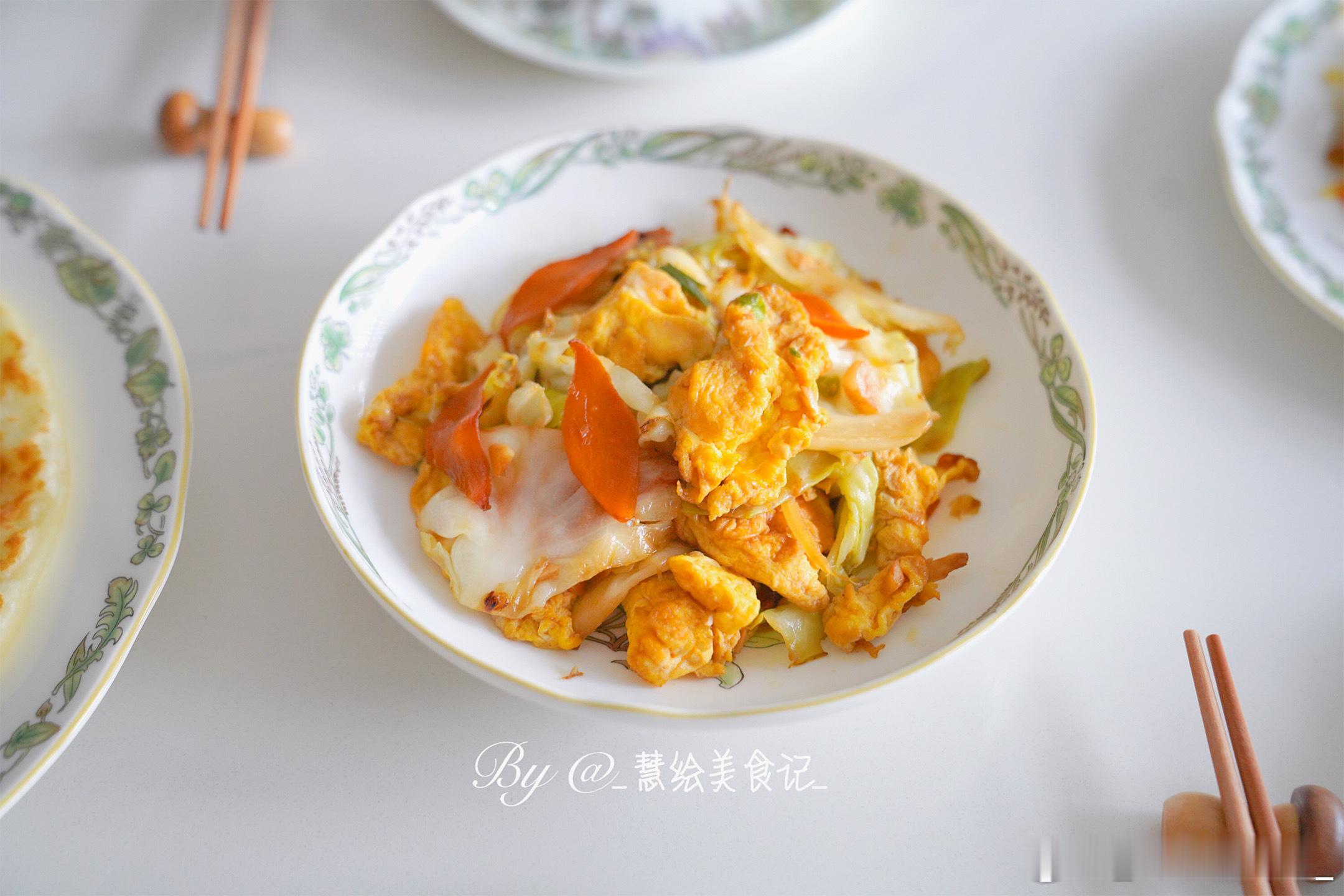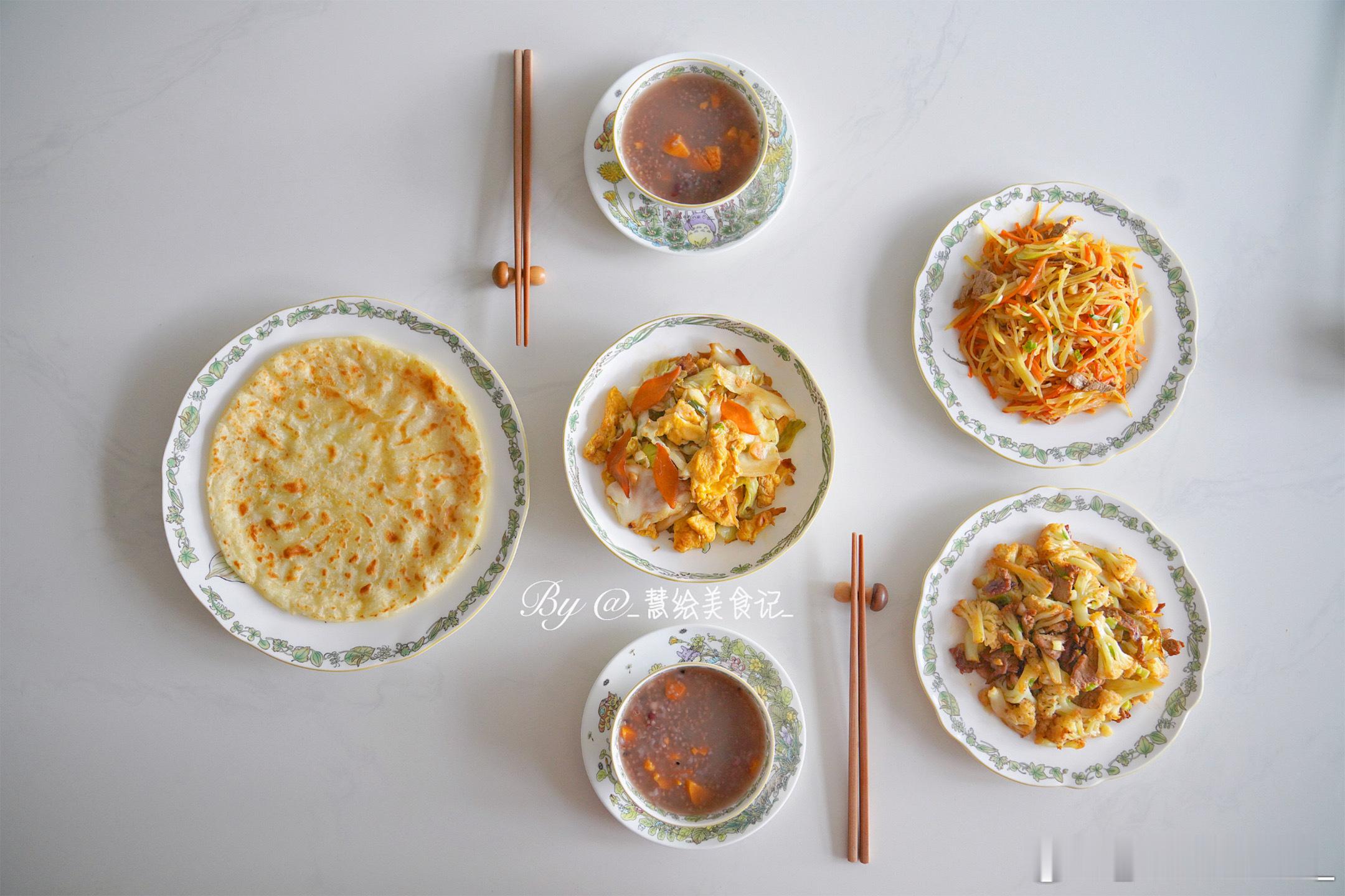 吃晚饭卷心菜炒鸡蛋、炒三丝、干锅花菜、家常饼、红薯小米粥~我的美食日记