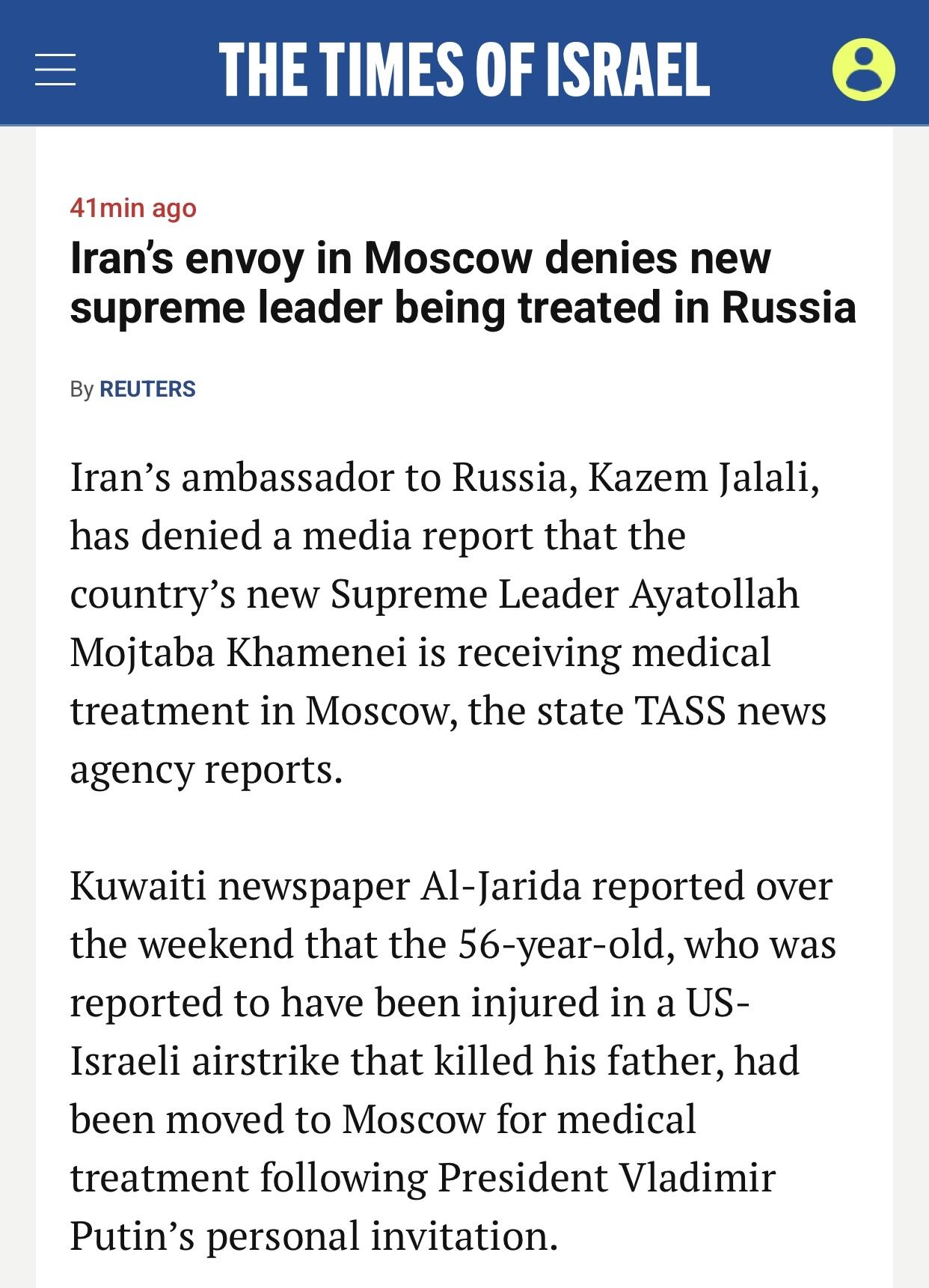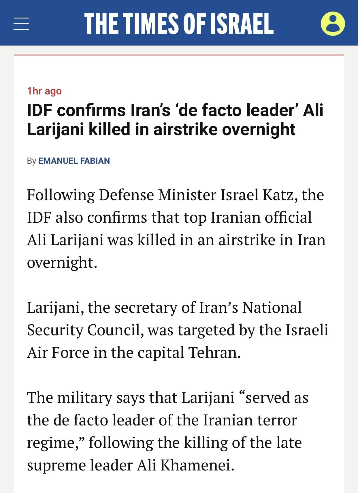 以媒:以色列国防军证实,伊朗“实际领导人”拉里贾尼在夜间空袭中丧生 以色列《以色列时报》官网3月17日报道:继以色列国防部长伊斯雷尔·卡茨之后,以色列国防军也证实,伊朗高级官员阿里·拉里贾尼在伊朗的一次空袭中丧生。拉里贾尼是伊朗国家安全委员会的秘书,他在首都德黑兰成为以色列空军的袭击目标。 报道说,以色列军方表示,在已故最高领袖阿里·哈梅内伊遇刺后,拉里贾尼“一直担任伊朗恐怖政权的实际领导人”,”多年来,拉里贾尼一直被视为伊朗恐怖政权领导层中最资深、最有经验的人物之一,且与该政权的领袖阿里·哈梅内伊关系密切”(The military says that Larijani “served as the de facto leader of the Iranian terror regime,” following the killing of the late supreme leader Ali Khamenei. “For years, Larijani was considered one of the most senior and veteran figures in the leadership of the Iranian terror regime and was close to the regime’s leader, Ali Khamenei”)。 报道的原标题是《IDF confirms Iran’s ‘de facto leader’ Ali Larijani killed in airstrike overnight》(以色列国防军证实,伊朗“实际领导人”阿里·拉里贾尼在夜间空袭中丧生)。 另据《以色列时报》报道:据俄罗斯国家通讯社塔斯社报道,伊朗驻俄罗斯大使卡齐姆·贾拉利否认了有关伊朗新任最高领袖阿亚图拉·穆吉塔巴·哈梅内伊正在莫斯科接受治疗的媒体报道(Iran’s ambassador to Russia, Kazem Jalali, has denied a media report that the country’s new Supreme Leader Ayatollah Mojtaba Khamenei is receiving medical treatment in Moscow, the state TASS news agency reports)。 报道说,据科威特报纸《Al-Jarida》周末报道称,穆吉塔巴据称在美以空袭中受伤,其父也在那次空袭中丧生。在俄罗斯总统弗拉基米尔·普京的亲自邀请下,穆吉塔巴已被送往莫斯科接受治疗。 报道的原标题是《Iran’s envoy in Moscow denies new supreme leader being treated in Russia》(伊朗驻莫斯科大使否认新任最高领袖正在俄罗斯接受治疗)。