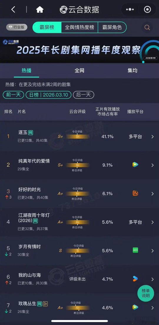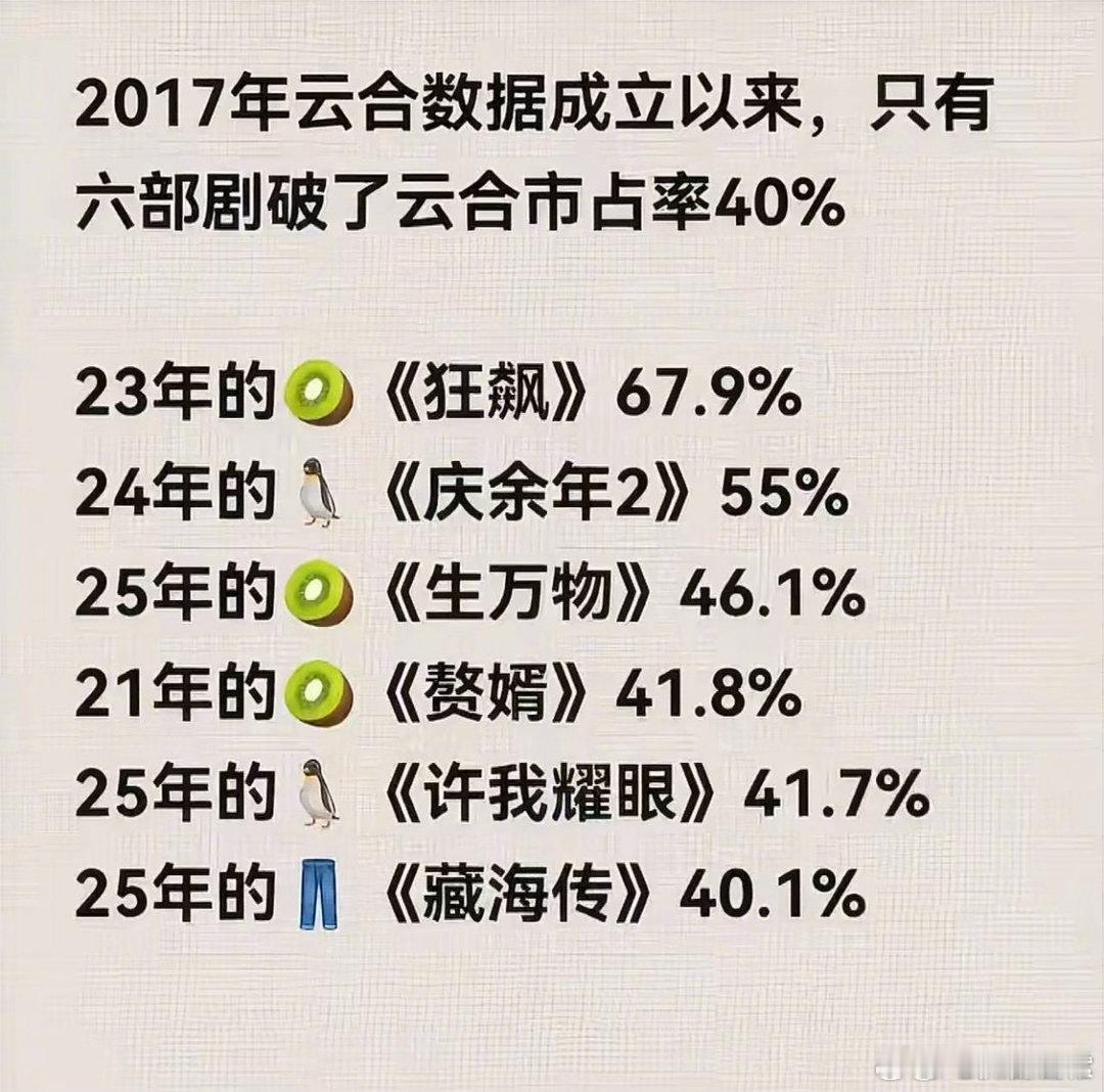 历史上七部云合破40%的剧,你看过哪部?《狂飙》张译、张颂文《庆余年2》张若昀《生万物》杨幂、欧豪《赘婿》郭麒麟、宋轶《许我耀眼》赵露思、陈伟霆《藏海传》肖战《逐玉》张凌赫、田曦薇