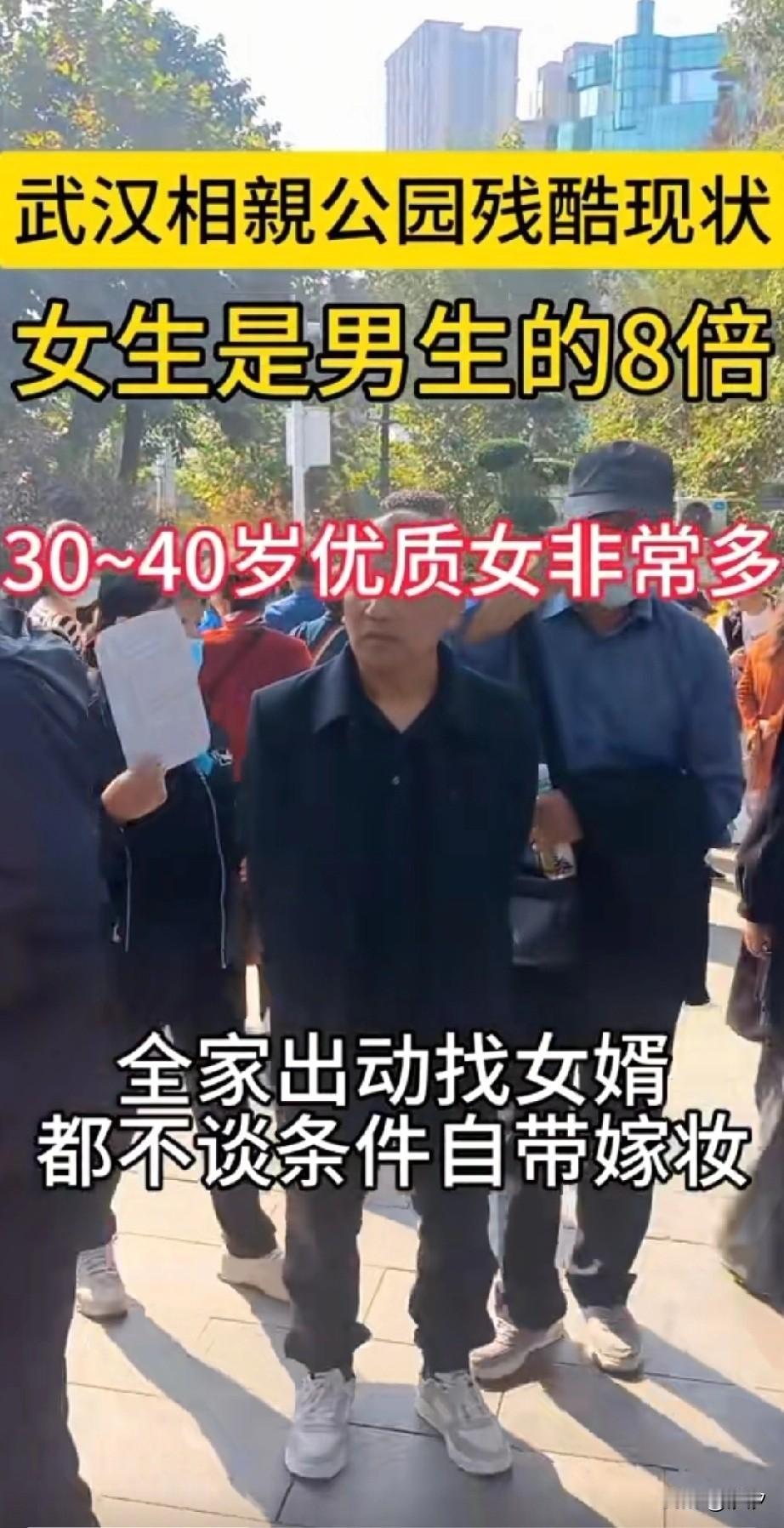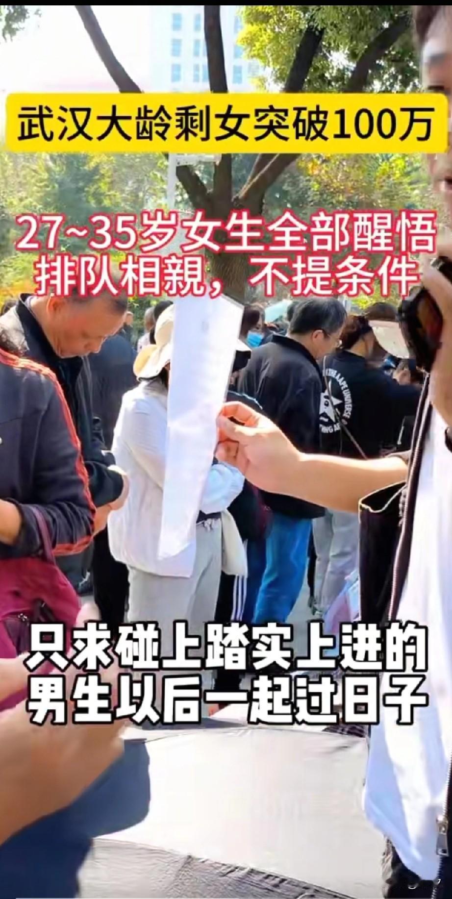 南宁相亲现场, 上千大龄剩女聚集, 但是现场来相亲的男生寥寥无几, 武汉相亲现场更加残酷, 全家老小都跑来找优质女婿, 30~40岁的优质女也很多, 她们都找不到对象, 因为市面上优秀的男生, 早就结婚生子了, 剩下的那一批, 要么条件不符合, 要么看不上她们, 这就像大家找不到工作一样, 自身条件是一方面, 企业的用人标准更是严格, 这就导致了很多人找不到工作, 很多企业找不到工人, 当这种不对等出现的时候, 就应该反思一下了, 大家觉得大龄剩女相亲难吗?