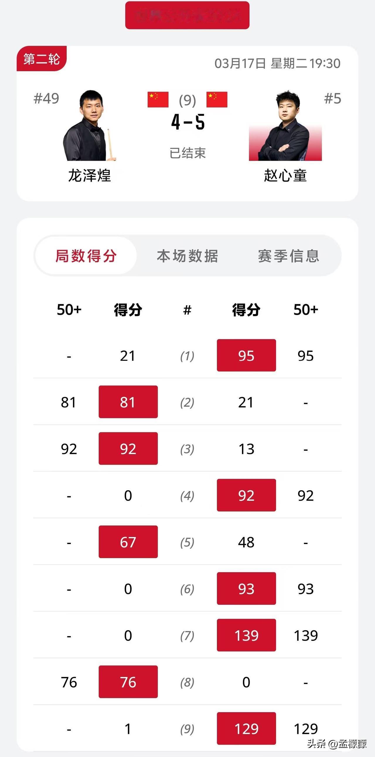 2026斯诺克世界公开赛|世界第五位的赵心童打出豪华数据,5-4决胜局战胜龙泽煌,晋级32强 北京时间3月17日19:30,2026中国江西•玉山斯诺克世界公开赛正赛第2天晚间场次比赛开始进行。 一号桌是世界第五位的赵心童 对阵第49位的龙泽煌。 比赛结果,64进32轮次,赵心童打出豪华数据,5-4决胜局战胜龙泽煌。赵心童打出两杆过百(139、129),3杆90+。 第一局赵心童表演悬空架杆;最后一局清粉球时,赵心童单手低杆击球,竟然打进了,还叫到了黑球,全场观众鼓掌喝彩。 2026斯诺克世界公开赛斯诺克 一起聊聊斯诺克 探讨斯诺克 吐槽个球 斯诺克世界公开赛斯洛克赵心童 斯诺克热评