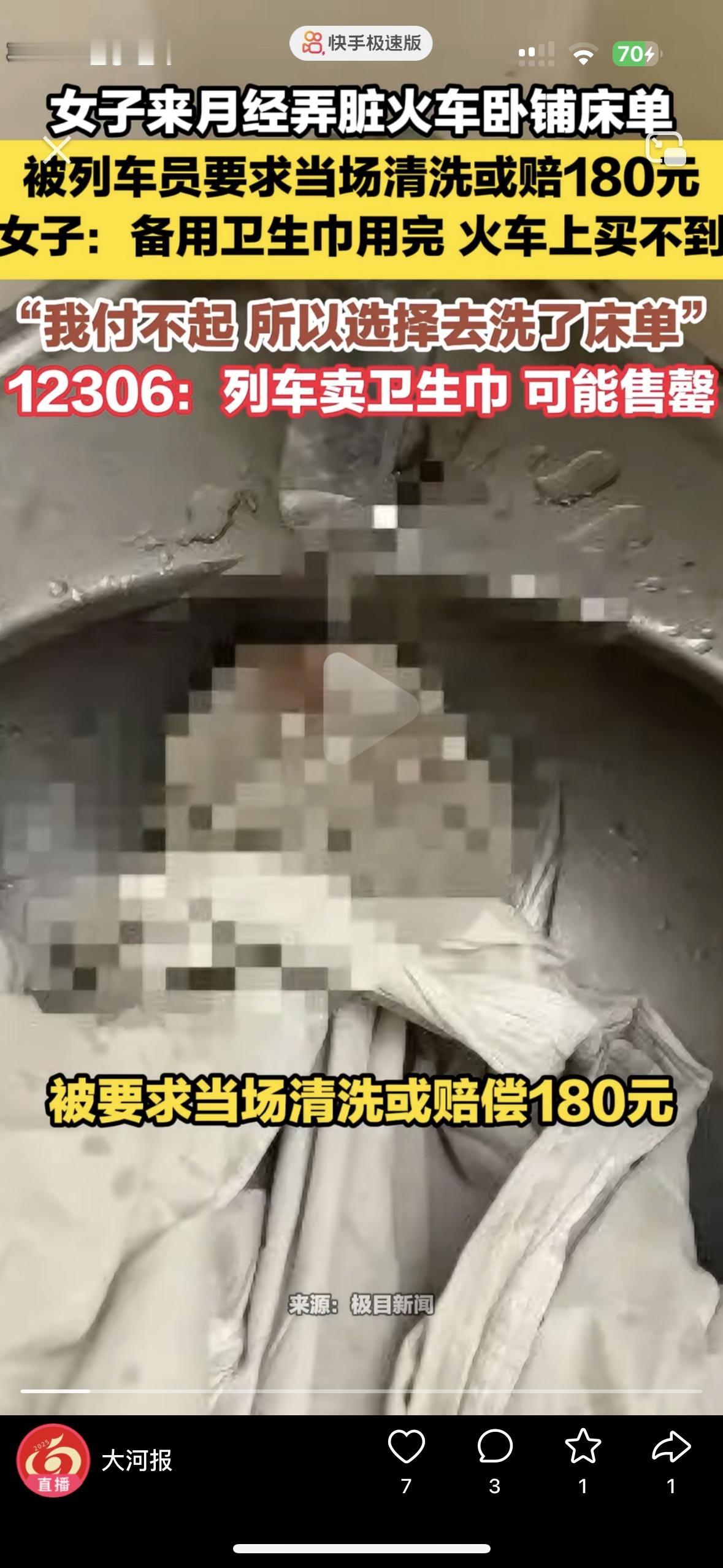 火车站这个事太没人情味了,这不就是赤裸裸的霸王条款吗? 谁能想到自己什么时候来月经,睡个觉都要为不可控的月经买单吗?女子在火车卧铺来了月经,弄脏了床单,列车员给了2个选择,要么当场手洗,要么赔钱180元,她说掏不出这么多钱,只能来着月经在冰冷的水里搓洗床单,洗完了又怕弄脏,一路站到下车。 车上有卖卫生巾的,恰好卖完了!月经什么时候来又不是可控制的,凭什么都让女子来赔偿呢?想想在水池里用冰水洗床单的女子,都觉得火车站这事太没人性了