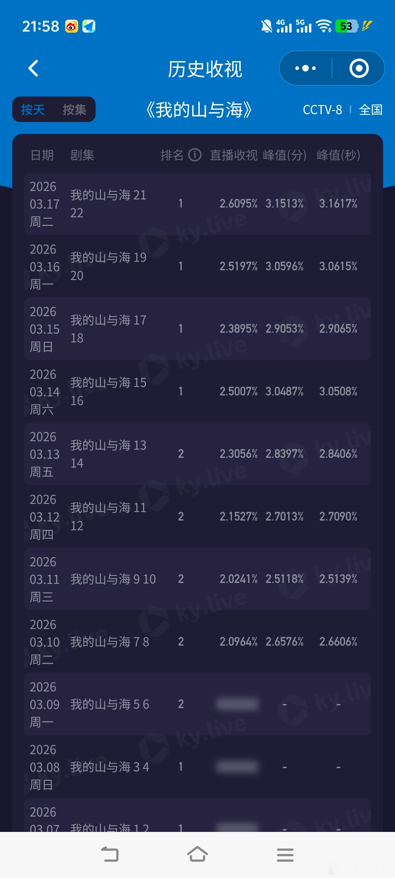 年代剧离不开的狗血三要素《我的山与海》今晚收视再创新高,酷云峰值3.1617,平均2.6095,可以预定今年前五了!