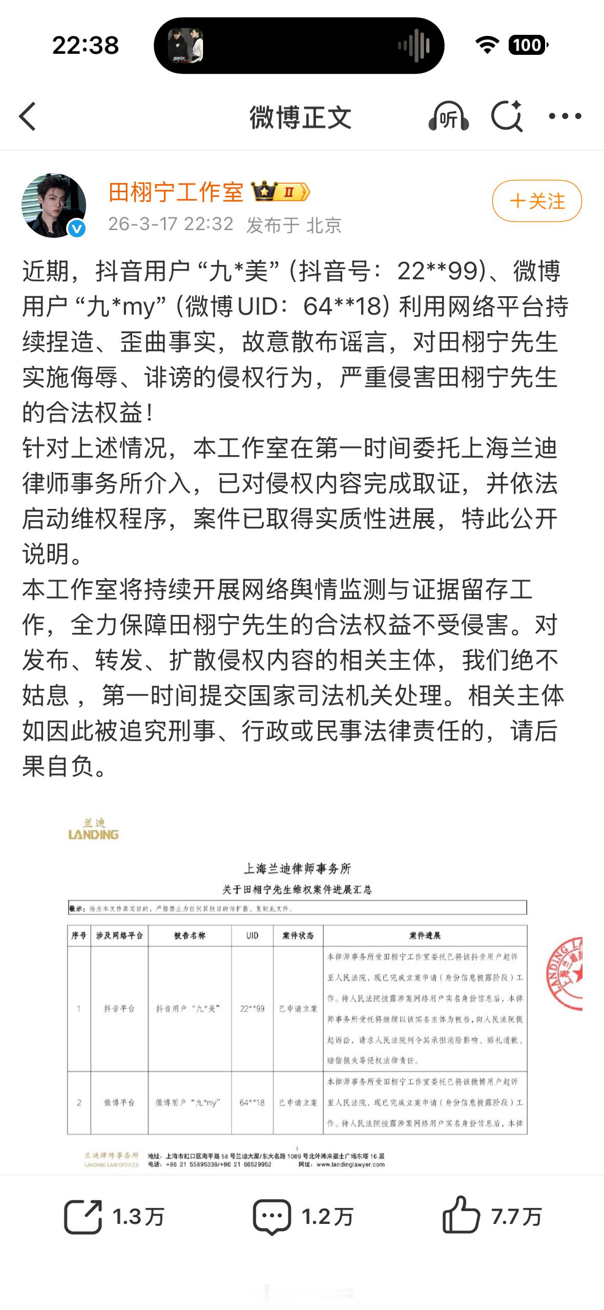 田栩宁工作室再次发文说要起诉你了