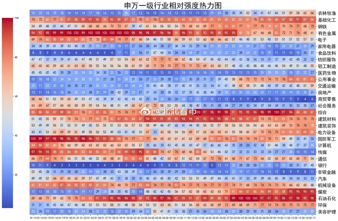 每个小格子代表某个行业在当天的强度,数值介于0-100之间,强度大于50者说明强于市场基准。