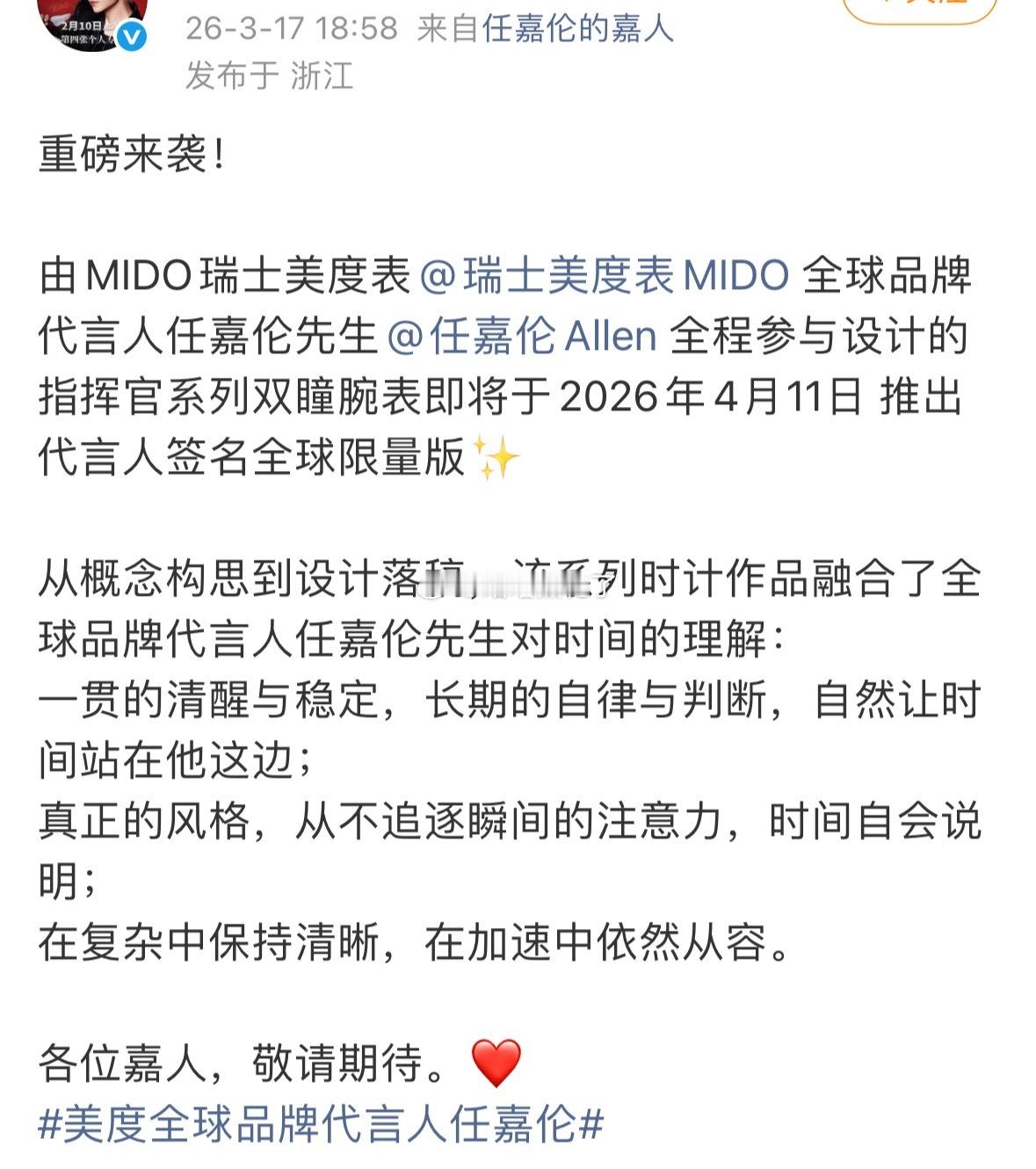嘛耶,任嘉伦参与设计了 MIDO 指挥官系列双瞳腕表诶,还是全球限量款
