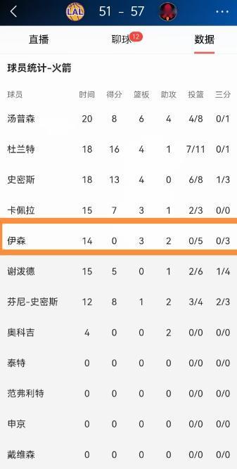 我强烈建议火箭立刻裁掉累赘伊森!在今天火箭主场迎战湖人的强强对话中,目前双方半场战罢,火箭以57:51处于领先,让人感到非常失望的是,伊森在前两节比赛中的比赛真是惨不忍睹。 这场西部前四的卡位战,火箭半场能领先,靠的是杜兰特、贾巴里·史密斯、阿门·汤普森等人的稳定发挥,还有芬尼·史密斯、谢泼德等替补的及时贡献,但伊森在场上的作用,完全和球队的节奏脱节。 上半场他获得了不少出场时间,可进攻端完全找不到准星,几次空位出手都没能命中,三分线外的尝试也全部偏出,没能给球队的进攻拉开空间。 对手防守时,甚至可以适当放掉他,把更多精力放在协防杜兰特和卡佩拉这些强点上,这让火箭的进攻空间变得很拥挤。 防守端,伊森也没展现出应有的活力,他原本以防守拼劲见长,但这场比赛里,协防时经常出现沟通失误,要么漏掉湖人的外线球员,要么在卡位抢篮板时被对手轻松推开,没能给球队的防守体系提供有效支撑。 上半场他的篮板和助攻数据也很有限,既没在篮板拼抢上帮球队稳住优势,也没能通过传球串联起队友。 更让人难以接受的是,伊森近期的低迷不是偶然,最近多场比赛,他的外线手感一直冰凉,三分命中率持续走低,已经连续多场没能投进三分球。 在这种关键的卡位战里,他依旧没能调整过来,延续了糟糕的状态,作为一名锋线球员,进攻端无法提供火力,防守端又频频出错,在场上几乎成了球队的负资产。 火箭现在正处在冲击西部前三的关键阶段,每一场比赛的胜负都至关重要,球队需要的是能在攻防两端都做出贡献、状态稳定的球员,而不是像伊森这样,在重要比赛里持续低迷、拖慢球队节奏的球员。 他的表现已经严重影响到球队的整体运转,继续留用,只会让火箭在后续的比赛里面临更多隐患。 从球队的长远发展和当下的战绩需求来看,裁掉伊森,换上更有活力、更能融入球队体系的球员,才是更合理的选择。 以上都是个人观点,对此您有什么不同的看法,可以在评论区留言讨论!!!