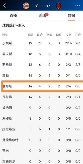 湖人巨星詹姆斯真是特别的暗淡无光!在今天湖人客场挑战火箭的焦点战中,目前双方半场战罢,湖人以51:57处于落后。让人感到极度失望的是,在这场群星璀璨的比赛中,詹姆斯显得特别的暗淡无光。 这场西部第三与第四的卡位战,赛前就备受关注,湖人带着五连胜的势头客场挑战火箭,火箭则坐拥主场优势,两队都想拿下比赛巩固排名。 比赛开始后,火箭率先进入状态,开局就打出攻势,湖人这边则依靠东契奇的发挥稳住局面,首节东契奇单节得分不少,帮助湖人以微弱优势领先结束首节。 进入第二节,火箭提升了防守强度,湖人的进攻开始出现问题,单节得分不多,火箭则抓住机会打出攻势,半场结束时以57比51反超湖人6分。 在这样一场关键比赛里,作为湖人核心的詹姆斯,半场的表现确实不够亮眼。 他在场上的出手次数很少,进攻端的参与度不高,大部分时间里,球权更多地集中在东契奇手中,詹姆斯更多是在场上跑动,没有主动去发起进攻、终结进攻。 首节里,詹姆斯有过一次快攻扣篮,这是他半场为数不多的亮眼表现,但这样的瞬间太少了,整个上半场,他在进攻端的存在感很低,没有像往常一样成为球队进攻的核心支点,既没有频繁地冲击篮筐,也没有在中远距离给出稳定的输出。 对比火箭这边的杜兰特,半场进攻状态火热,多次命中中距离,带领球队打出攻势,詹姆斯在进攻端的表现差距明显。 除了进攻,詹姆斯在半场的组织串联也没有太多亮点,他没有通过传球给队友创造出太多好的得分机会,场上的传球更多是简单的过渡,没有起到盘活球队进攻的作用。 湖人半场进攻不畅,除了东契奇之外,其他球员的得分都比较零散,詹姆斯作为球队老将和核心,没有在这个时候站出来带动队友,这也是他表现暗淡的一个方面。 这场比赛是两队争夺西部排名的关键战,双方阵容里球星云集,东契奇、杜兰特都是联盟顶级球星,比赛的关注度很高。 在这样的舞台上,詹姆斯作为湖人的招牌球星,半场没有打出应有的表现,没有在球队需要的时候扛起进攻重担,也没有在攻防两端给球队带来足够的支撑。 他在场上的状态显得比较平淡,没有展现出过往那种统治比赛的能力,和身边发挥出色的东契奇,以及对面状态火热的杜兰特相比,确实显得暗淡无光。 半场比赛结束,湖人落后,球队的进攻问题需要解决,而作为核心的詹姆斯,也需要在下半场调整状态,拿出更好的表现,帮助球队扭转局面。 毕竟在这样的关键卡位战里,球队需要他站出来,而不是继续保持这样平淡的发挥。 以上都是个人观点,对此您有什么不同的看法,可以在评论区留言讨论!!!