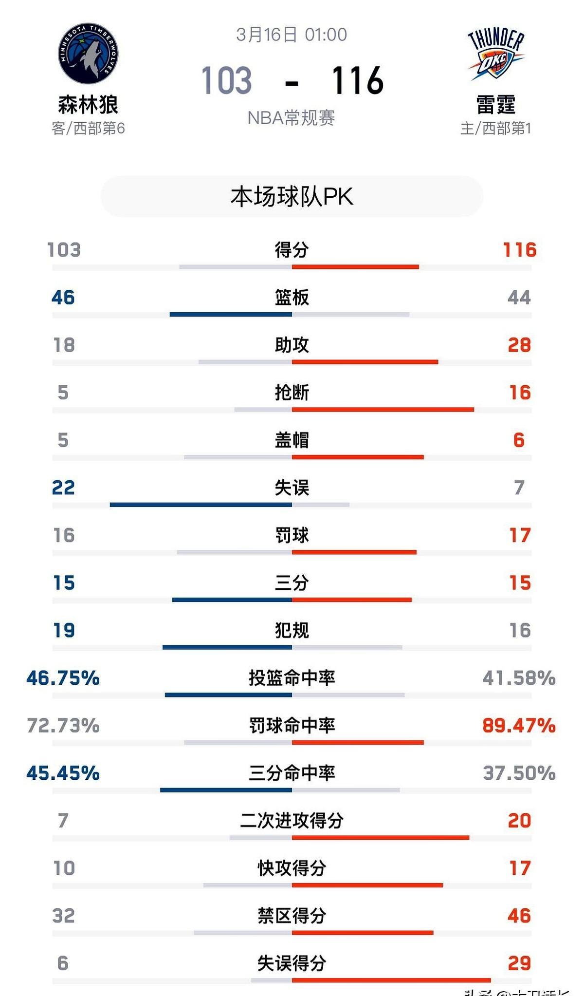 领先了近三节,最后还是崩了。 森林狼又一次在强强对话中掉了链子。面对联盟第一的雷霆,他们大部分时间都压着对方打,结果末节直接断电,被一波36-27的攻势彻底带走。 问题就出在核心爱德华兹身上。全场17投6中,还送出6次失误5个犯规,攻防两端都像梦游。兰德尔拼了老命砍下32分,也无力回天。 反观雷霆,核心亚历山大虽然手感也一般,但全队打得像一台机器。全场抢断16比5,失误7比22,这数据直接说明了一切。靠着霍姆格伦、乔和卡鲁索等人的集体发挥,轻松逆转。 这场失利直接让森林狼掉到西部第六,季后赛席位都开始紧张了。核心球员这种起伏不定的表现,到了季后赛只会被对手无限放大。