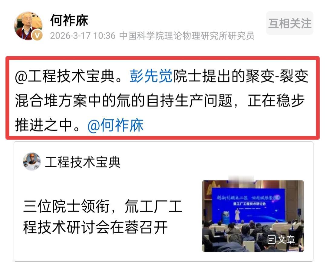 何祚庥老院士回应网友“工程技术宝典”说,彭院士提出的聚变、裂变混合堆方案的氚自持生产问题,正在稳步推进之中。 何老院士的一番话,揭示出了两个道理。 第一点,鸡蛋没有放在一个篮子里。我们都知道现在核聚变的路线有很多种,以彭院士为代表的惯性约束核聚变路线,现在也被重视起来了。由此看来,我们现在对于核聚变,实行的是多项路线并行的策略,这样成功的概率就会大大增加。 第二点,离不开国家的强力支持。核聚变研究的任何一条技术路线,都需要耗费巨大的人力、物力和财力,这是很多国家难以承担的。如今我国经济、科技等领域实力不断增强,完全有能力支撑这类重大科研项目。 此外,何老院士提出的“稳步推进”至关重要。核聚变研究必须脚踏实地、稳步推进,每前进一步,都可能带来重要的科技突破。何老所说的“稳”,一方面是科研工作者要保持平稳的心态,另一方面是要有计划、有步骤地推进核聚变研究的每一项工作。 在科技上稳步前进,这才是取胜之道。
