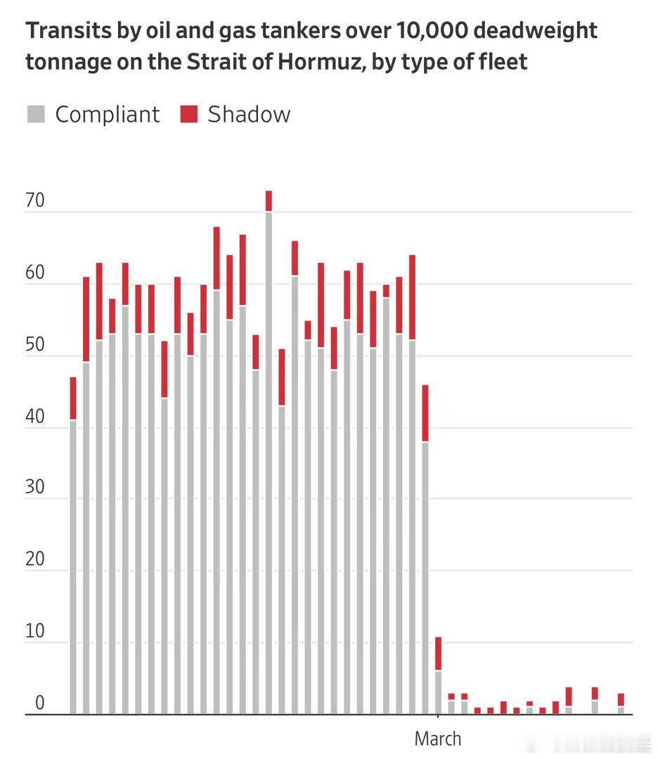 霍尔木兹一直没有完全关闭,但过往船只总数比战前暴跌90%以上(图三:灰色为符合规定的、红色为受制裁的)