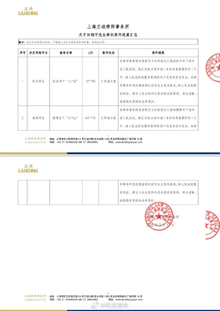 田栩宁工作室告了九成美 田栩宁工作室告了九成美,原来之前没回应是默默在走起诉流程,现在已完成立案申请(身份信息披露阶段)工作
