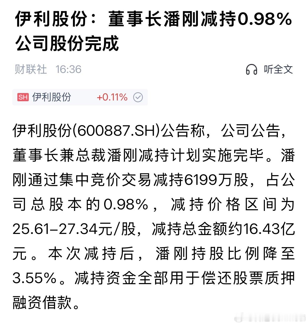 「潘刚伊利股份融资增持→减持还款」整体分析,只按公开数据 + 约6%质押利率算,逻辑清晰。