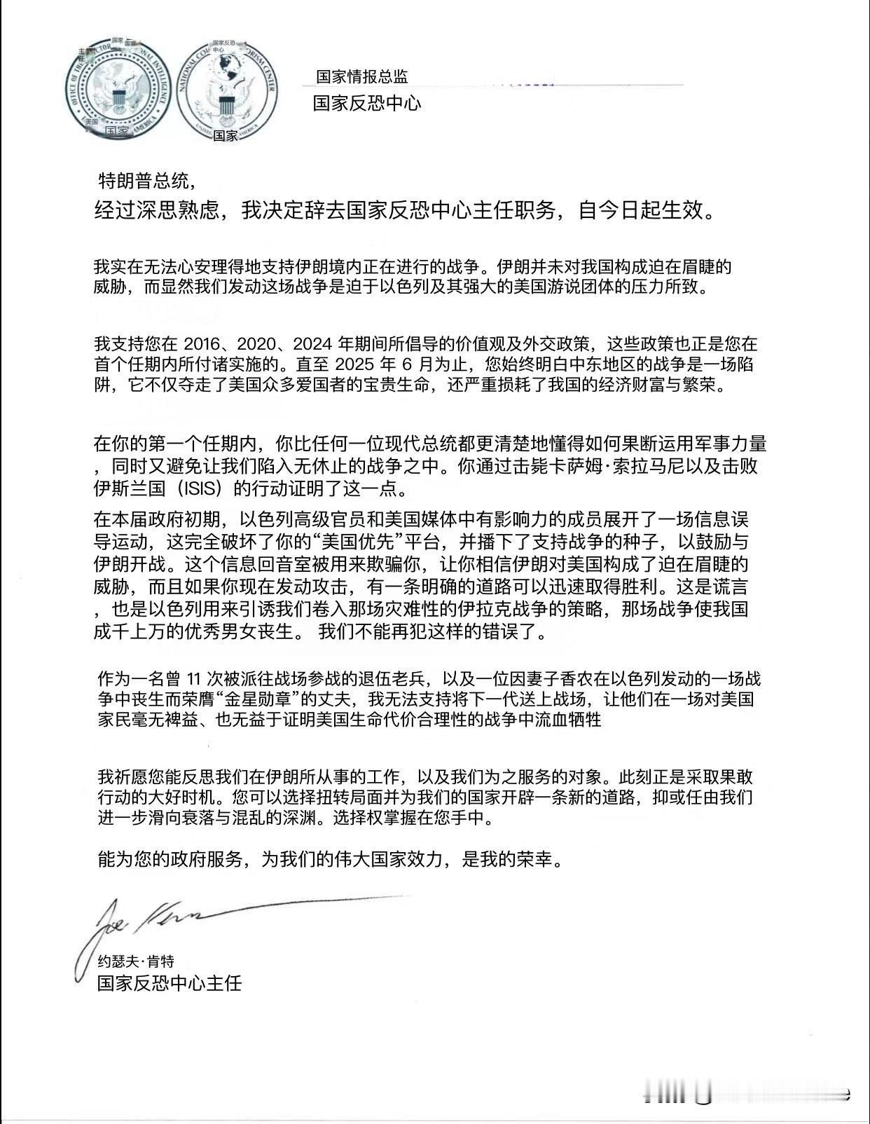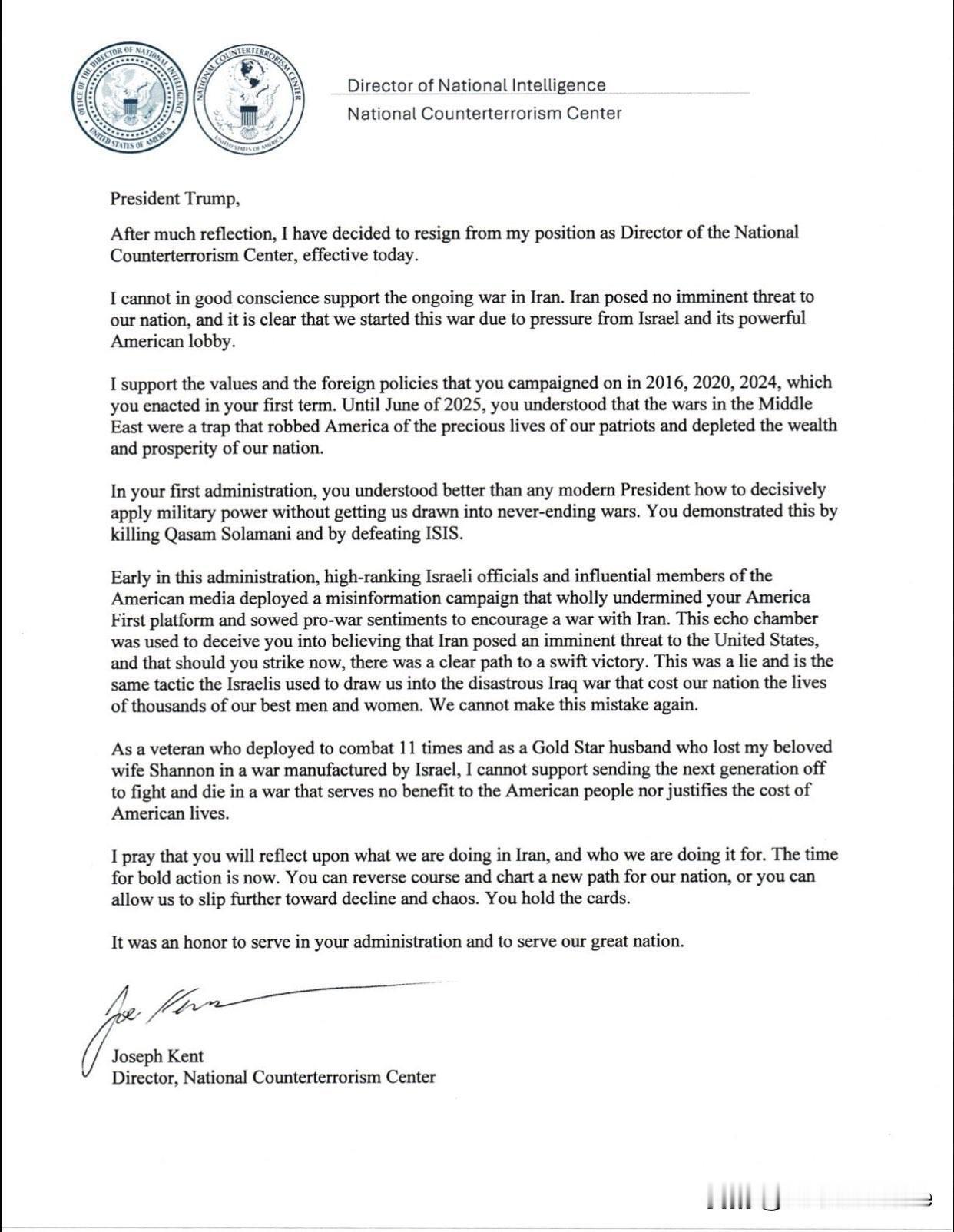 刚刚辞职的美国反恐中心主任乔·肯特的妻子死于恐怖组织伊斯兰国ISIS之手 在乔·肯特公开的辞职信中他提起了妻子的死亡: “作为一名曾11次被派往战场参战的退伍老兵,以及一位因妻子香农在以色列发动的一场战争中丧生而荣膺“金星勋章”的丈夫,我无法支持将下一代送上战场,让他们在一场对美国家民毫无裨益、也无益于证明美国生命代价合理性的战争中流血牺牲。” 总统特朗普和众议院议长约翰逊已经对乔·肯特的辞职进行了回应。 有媒体分析,MAGA的班底已经在动摇了。