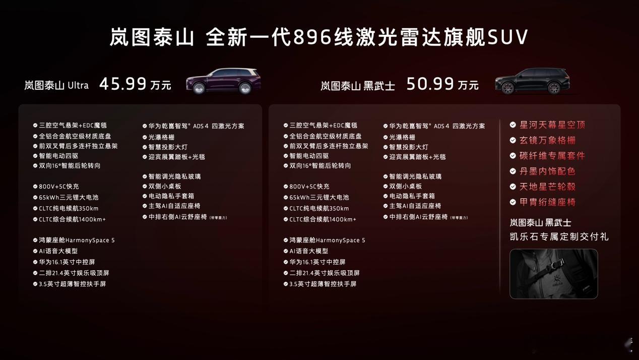 岚图泰山Ultra量产交付及泰山黑武士终于上市啦~Ultra版45.99万、黑武士版50.99万!!!配备896线激光雷达和华为乾崑ADS 4.1,还带有三腔空悬+EDC魔毯、双向16度后轮转向~~这价格直接把50万级旗舰SUV的桌子掀了!!!黑武士版纯黑外观+丹墨内饰非常霸气,还有碳纤维套件和星空顶,你们爱了吗?