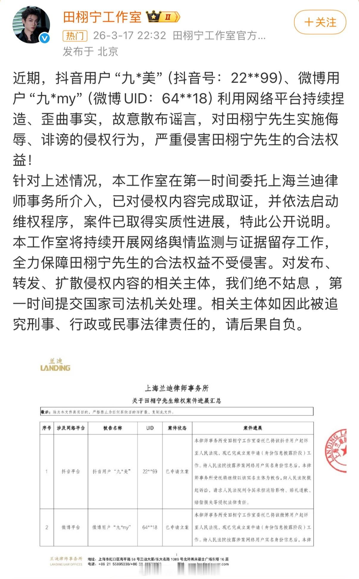 田栩宁工作室告了九成美声明已经出来了,支持田栩宁维权