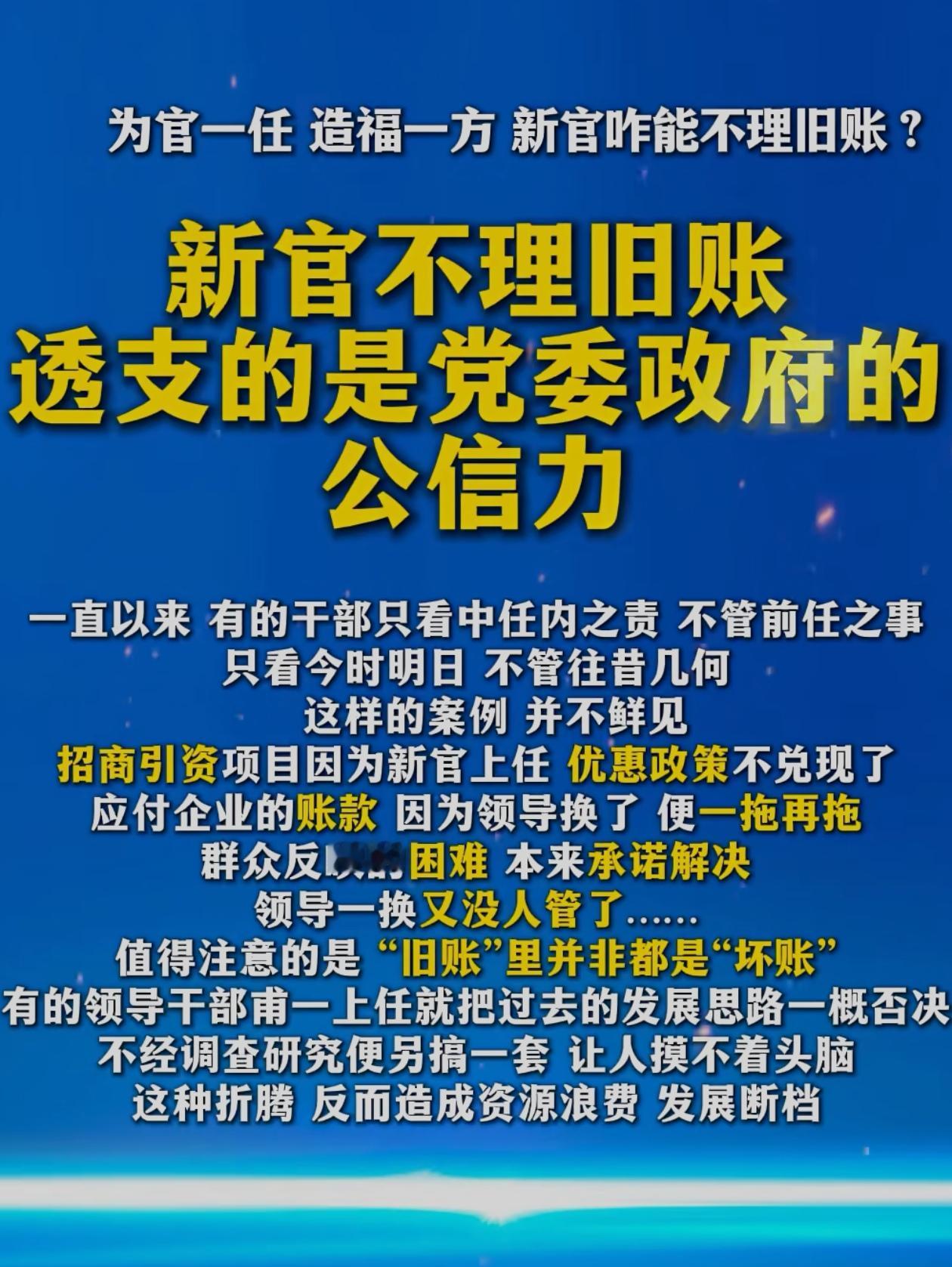 治政之要:不甩旧账,方显担当 “为官一任,造福一方”,这是从政者最朴素的初心,也是最厚重的责任。现实中,少数人抱着“新官不理旧账”的心态,对前任留下的矛盾问题避之不及,对历史遗留的民生事项敷衍塞责,看似守住了“不出事”的底线,实则丢掉了为政的初心、担当的底气和群众的信任。 新官不理旧账,根子在政绩观偏差。有的重显绩轻潜绩,只想干“短平快”的出彩事,不愿啃“硬骨头”、接“烫手山芋”;有的怕担责任、怕惹麻烦,把历史问题当成“包袱”,把民生承诺当成“负担”。殊不知,一任接着一任干,一棒接着一棒跑,才是治理之道;敢接旧账、能理旧账、还清旧账,才是真担当、真作为、真政绩。 政贵有恒,治须有常。前任的决策,只要符合发展大局、顺应民心所向,就该一以贯之;历史的欠账,只要关乎群众利益、关乎公平正义,就必须坚决补上。理旧账,不是简单“翻旧账”,而是对事业负责、对人民负责、对历史负责。把遗留的难题解决好,把许下的承诺兑现好,把断裂的工作接续好,民心才能凝聚、发展才能稳定、公信力才能树立。 担当不在口号,而在行动。真正有格局、有作为的干部,从不计较“功成在谁”,只在乎“功成必定有我”。不甩旧账、不推责任、不避矛盾,以“时时放心不下”的责任感,把每一件事办扎实、办到位,方能不负组织重托、不负人民期盼,方能行稳致远、造福一方。