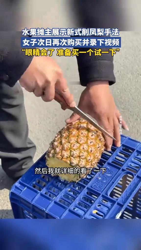 水果摊主展示新式削凤梨手法,女子次日再次购买并录下视频。 拍摄者石女士:他切的时