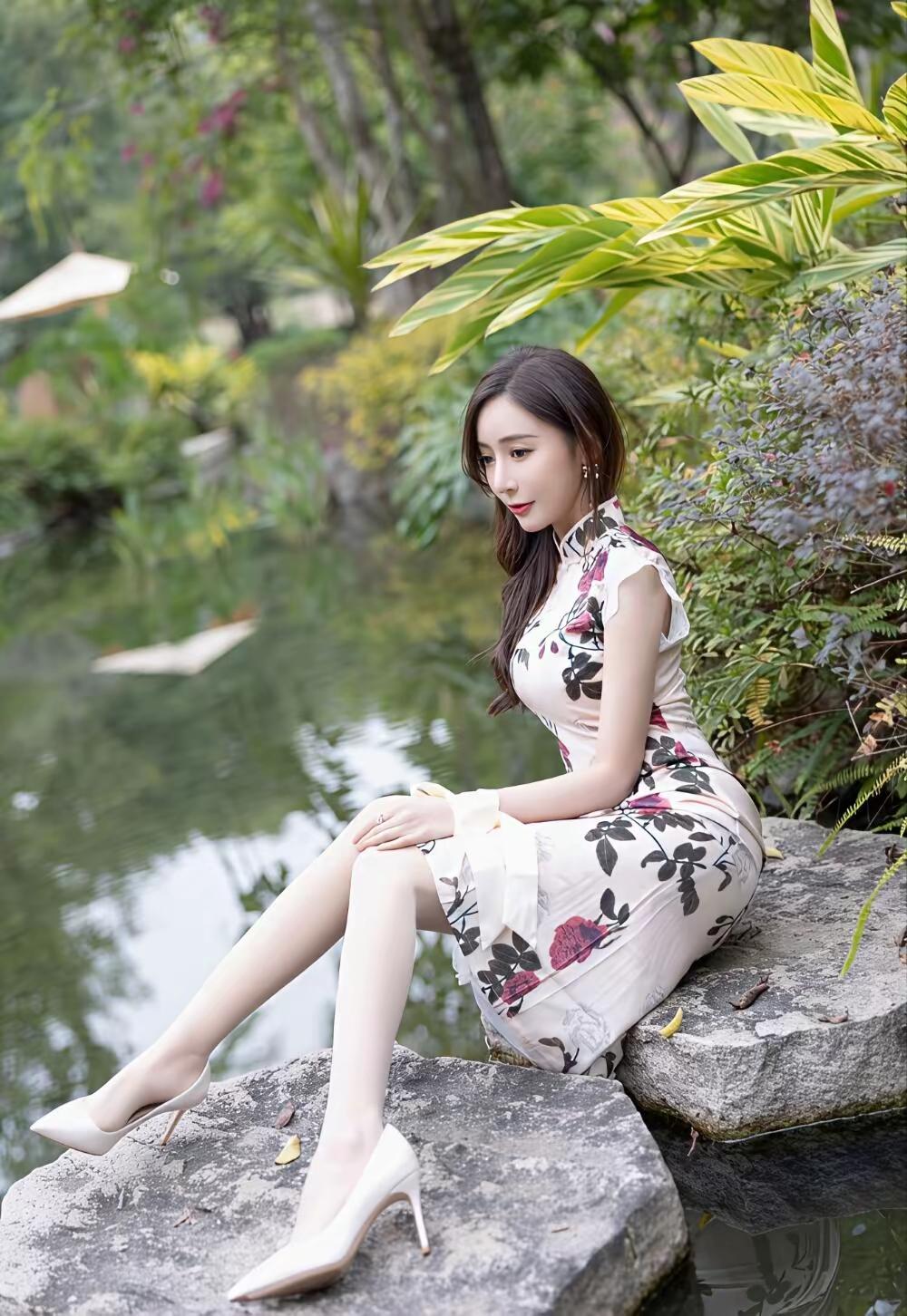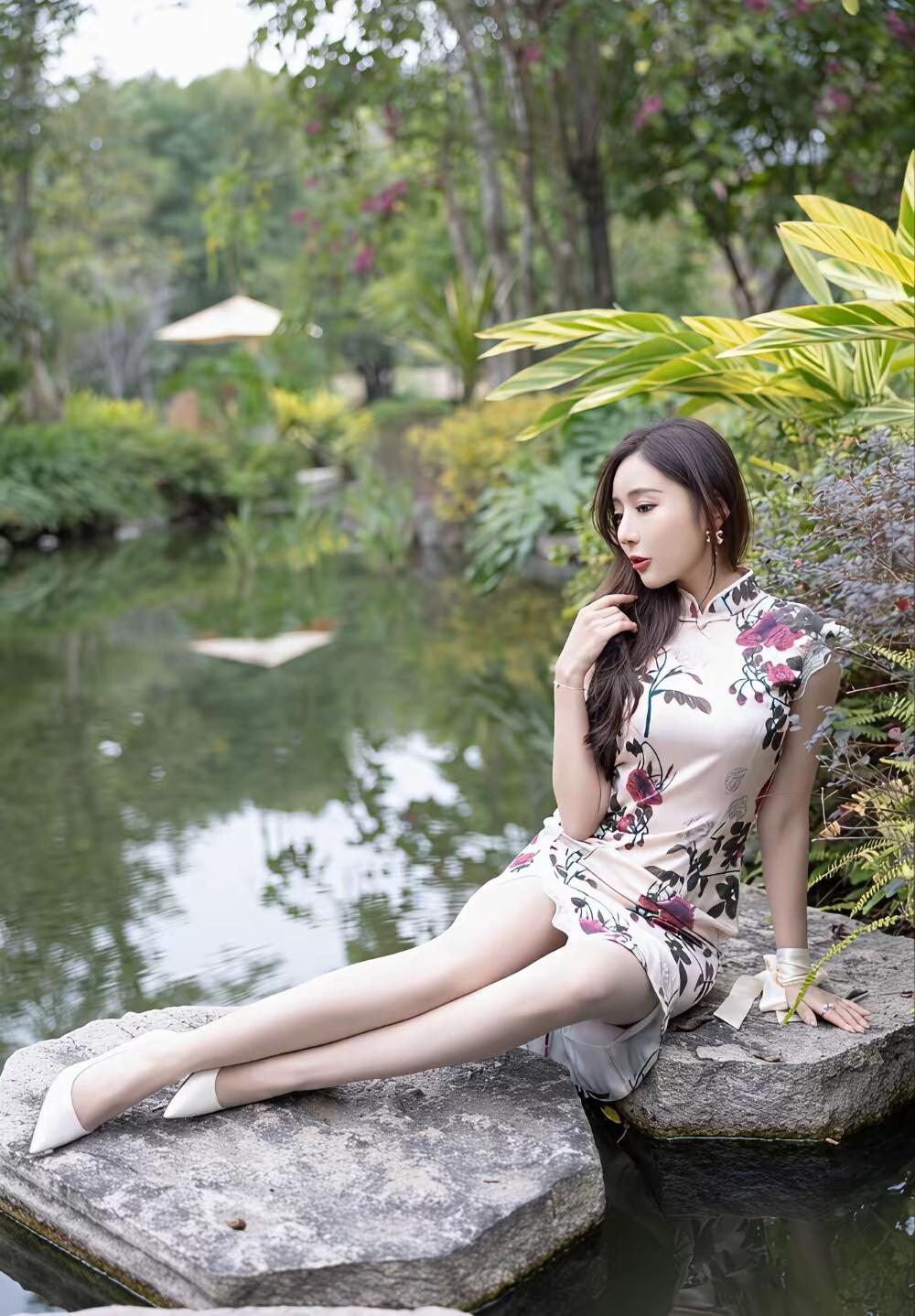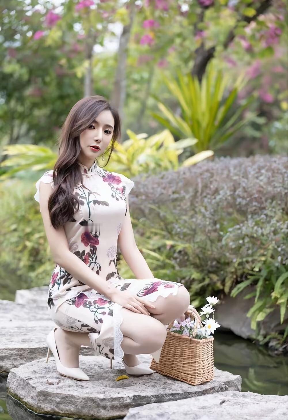 🌿 画面整体氛围 这组照片以江南园林水景为背景,绿意盎然的草木与澄澈池水相映成趣,营造出温婉雅致的中式意境。画面色调清新柔和,充满了春日的生机与古典韵味。 👗 人物与穿搭 服饰:女子身着一件米底带粉紫玫瑰印花的改良旗袍,立领与小飞袖设计尽显东方温婉,开叉裙摆则勾勒出柔美曲线,搭配白色尖头高跟鞋,优雅又不失灵动。 造型:深棕长卷发自然垂落,精致耳饰与腕间白色丝带点缀其间,妆容清透温婉,唇色点缀得恰到好处,尽显东方女性的柔美韵味。 姿态:她时而斜倚池边石上,肢体舒展慵懒;时而蹲身提篮,眉眼温柔;时而漫步草坪与汀步,身姿轻盈,每一个角度都传递出娴静优雅的气质。 🍃 场景与细节 背景:池水波光粼粼,倒映着周围的绿树与亭檐,芭蕉、蕨类与粉花灌木层层环绕,充满了自然野趣。 道具:藤编小花篮与白色小雏菊的加入,更添几分田园诗意,与旗袍的古典美相得益彰。 整体而言,这组照片将东方旗袍之美与园林自然之景完美融合,人物温婉动人,景致清新雅致,宛如一幅流动的江南春景图,尽显东方女性的温婉与韵味。