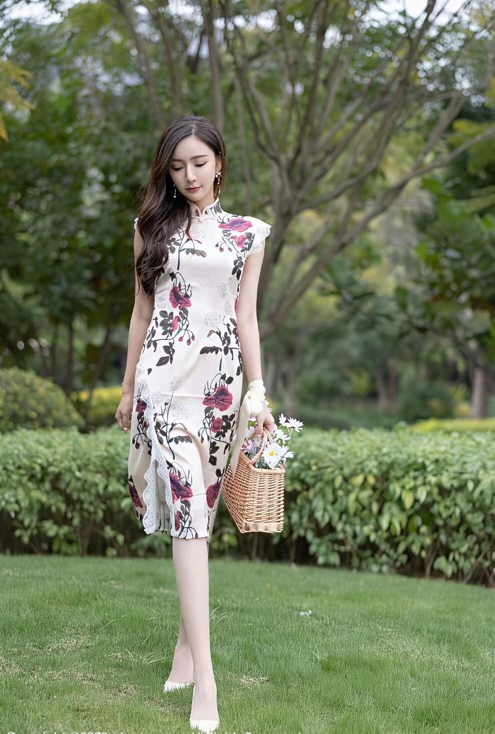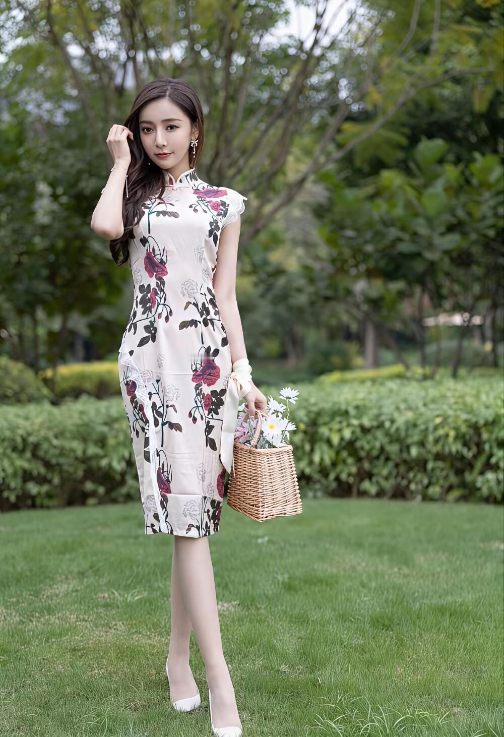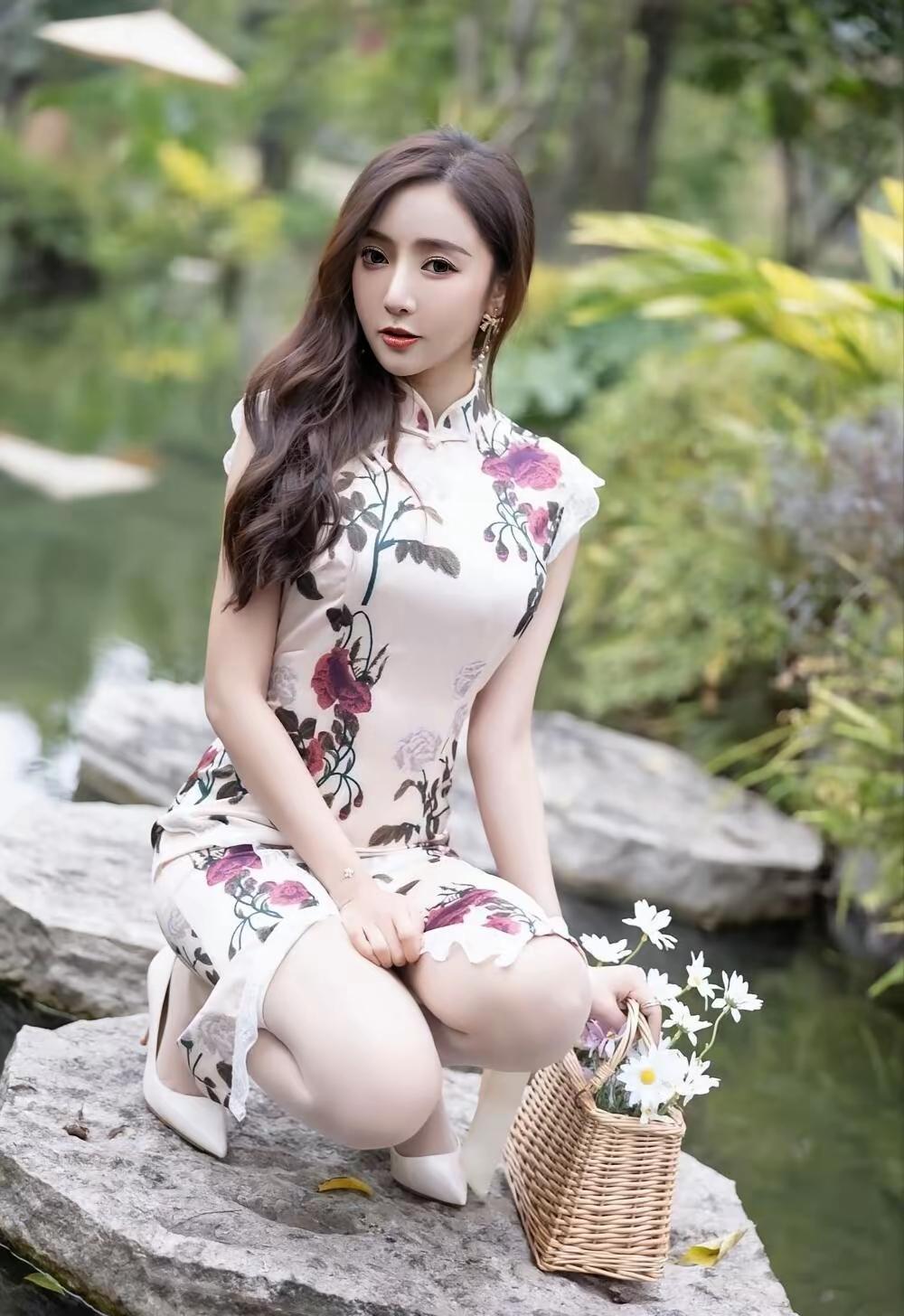🌿 画面整体氛围 这组照片以江南园林水景为背景,绿意盎然的草木与澄澈池水相映成趣,营造出温婉雅致的中式意境。画面色调清新柔和,充满了春日的生机与古典韵味。 👗 人物与穿搭 服饰:女子身着一件米底带粉紫玫瑰印花的改良旗袍,立领与小飞袖设计尽显东方温婉,开叉裙摆则勾勒出柔美曲线,搭配白色尖头高跟鞋,优雅又不失灵动。 造型:深棕长卷发自然垂落,精致耳饰与腕间白色丝带点缀其间,妆容清透温婉,唇色点缀得恰到好处,尽显东方女性的柔美韵味。 姿态:她时而斜倚池边石上,肢体舒展慵懒;时而蹲身提篮,眉眼温柔;时而漫步草坪与汀步,身姿轻盈,每一个角度都传递出娴静优雅的气质。 🍃 场景与细节 背景:池水波光粼粼,倒映着周围的绿树与亭檐,芭蕉、蕨类与粉花灌木层层环绕,充满了自然野趣。 道具:藤编小花篮与白色小雏菊的加入,更添几分田园诗意,与旗袍的古典美相得益彰。 整体而言,这组照片将东方旗袍之美与园林自然之景完美融合,人物温婉动人,景致清新雅致,宛如一幅流动的江南春景图,尽显东方女性的温婉与韵味。