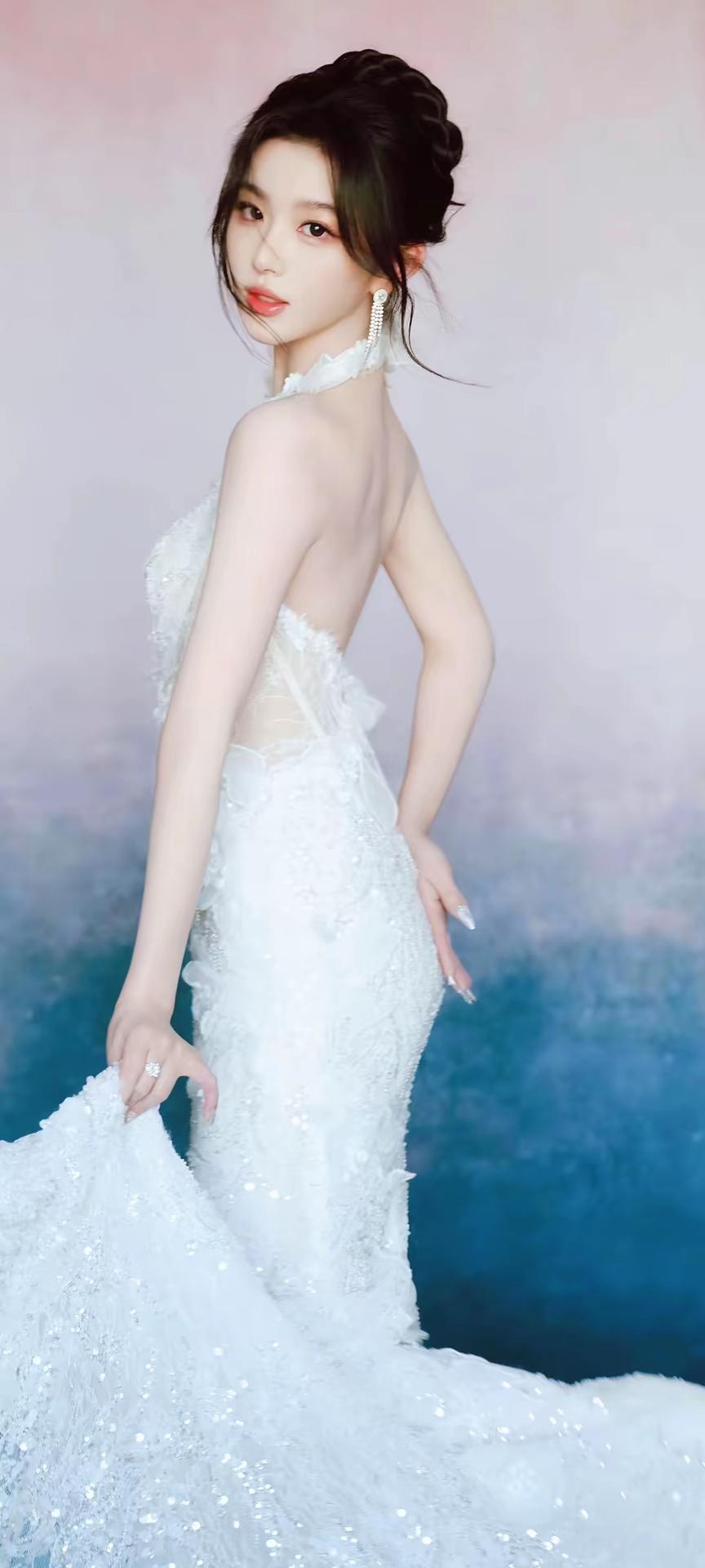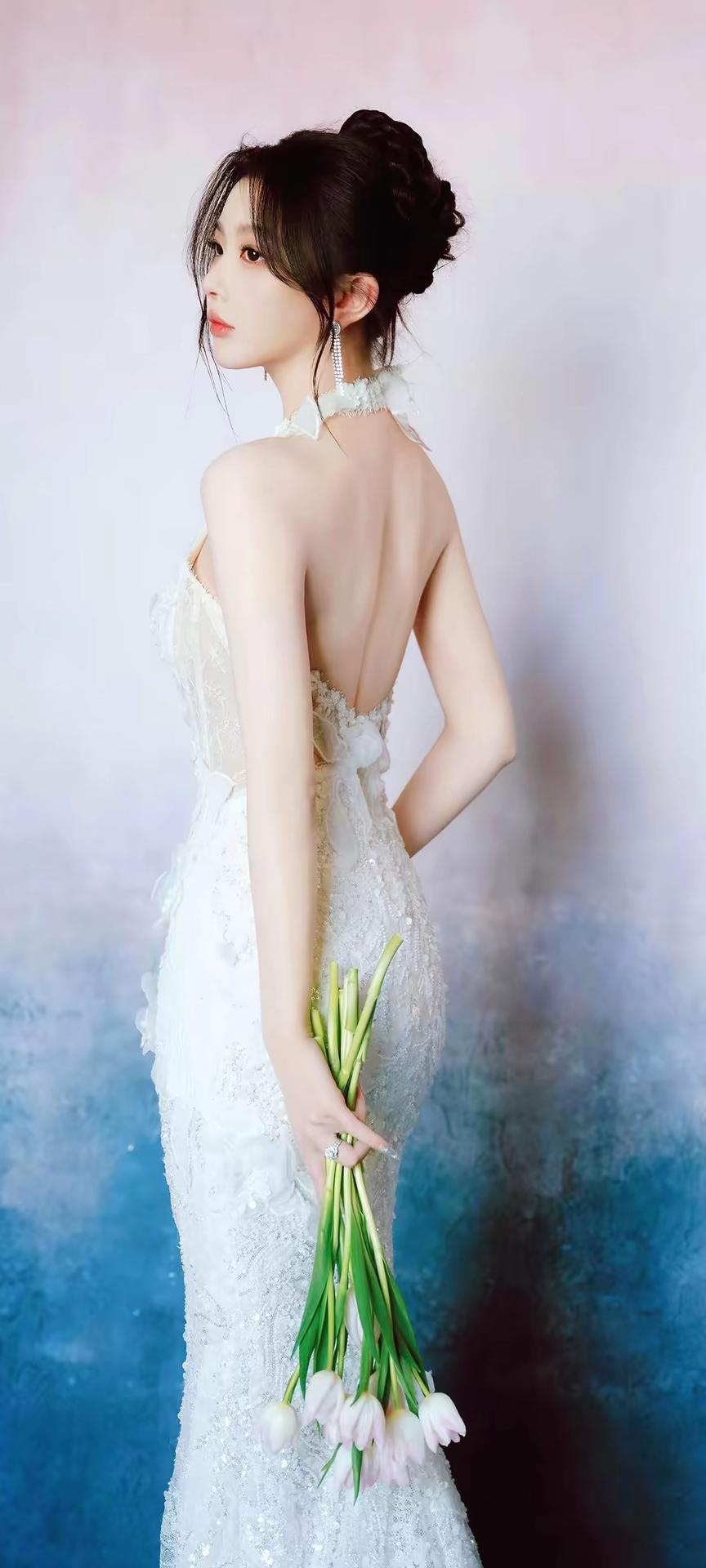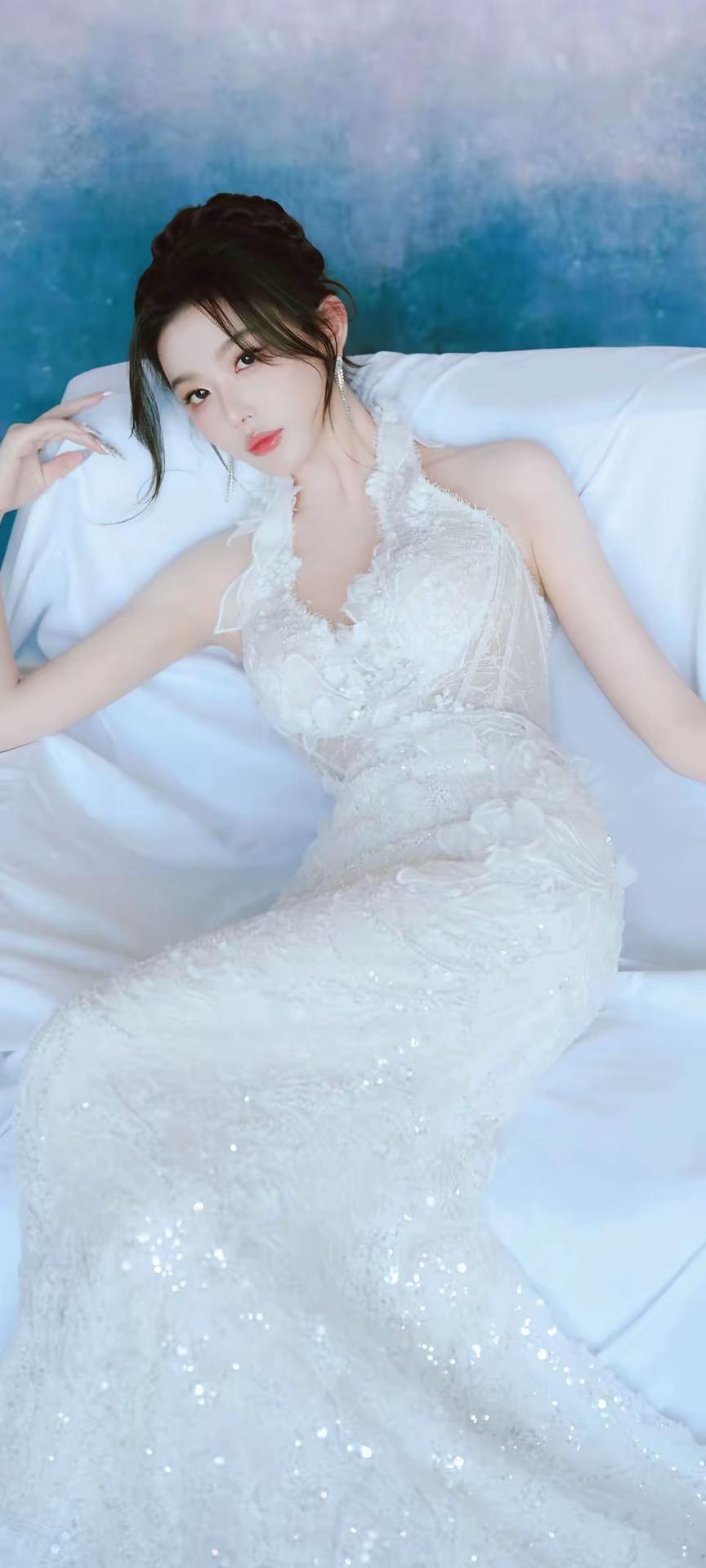 画面整体氛围 这组照片以渐变粉蓝梦幻背景为基调,搭配纯白婚纱与精致造型,营造出浪漫优雅的婚纱写真氛围,温柔又充满仪式感,宛如坠入云端的梦境。 👰 人物与造型 发型:乌黑长发被精心盘成复古高髻,几缕碎发自然垂落在脸颊两侧,既修饰脸型又增添了灵动柔美的气息。 妆容:清透底妆衬得肌肤白皙透亮,眼尾微扬的眼线与粉调眼影温柔灵动,唇妆是水润的蜜桃色,整体妆容精致又不失少女感。 配饰:长款流苏水钻耳饰垂坠耳畔,指尖佩戴的钻石戒指与透明碎钻美甲相互呼应,细节处尽显精致华贵。 👗 服饰与姿态 婚纱:一袭挂脖鱼尾白纱是视觉焦点,立体蕾丝花朵与亮片刺绣遍布裙身,挂脖设计露出优美肩颈线条,露背剪裁勾勒出蝴蝶骨,鱼尾裙摆贴合身形,行走间摇曳生姿,仙气十足。 姿态:她时而托腮凝望,眼神清澈含光;时而侧身倚坐,慵懒又优雅;时而提裙回眸,身姿曼妙;时而手捧花束,温柔缱绻,每一个角度都将婚纱的精致与女性的柔美展现得淋漓尽致。 🌸 道具与细节 花束:白色紫罗兰与粉郁金香的花束作为点缀,为画面增添了自然清新的诗意,与纯白婚纱相得益彰,更显浪漫氛围。 光影:柔和的光线均匀洒在身上,让婚纱的亮片与蕾丝纹理更具层次感,在渐变背景的衬托下,整体画面朦胧又梦幻。 整体而言,这组照片将婚纱的圣洁优雅与少女的灵动柔美完美融合,每一张都像一幅精致的梦境画卷,尽显高级又温柔的美感。