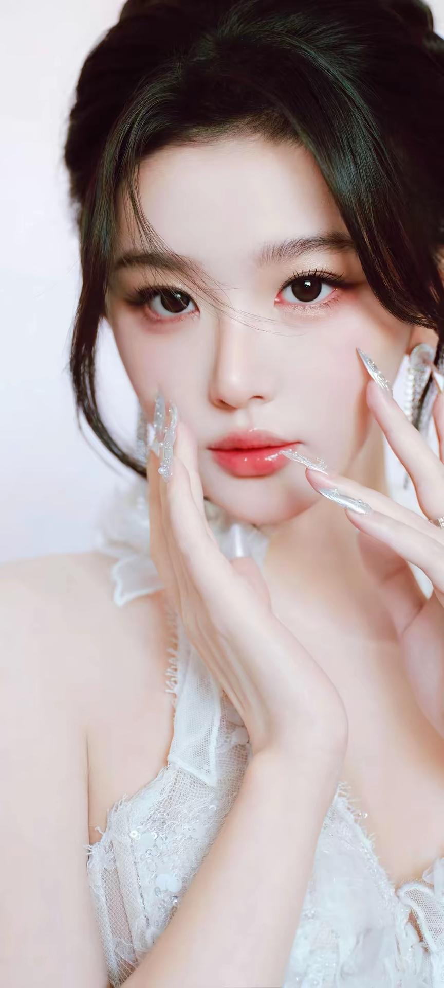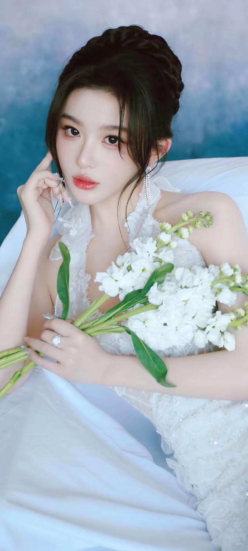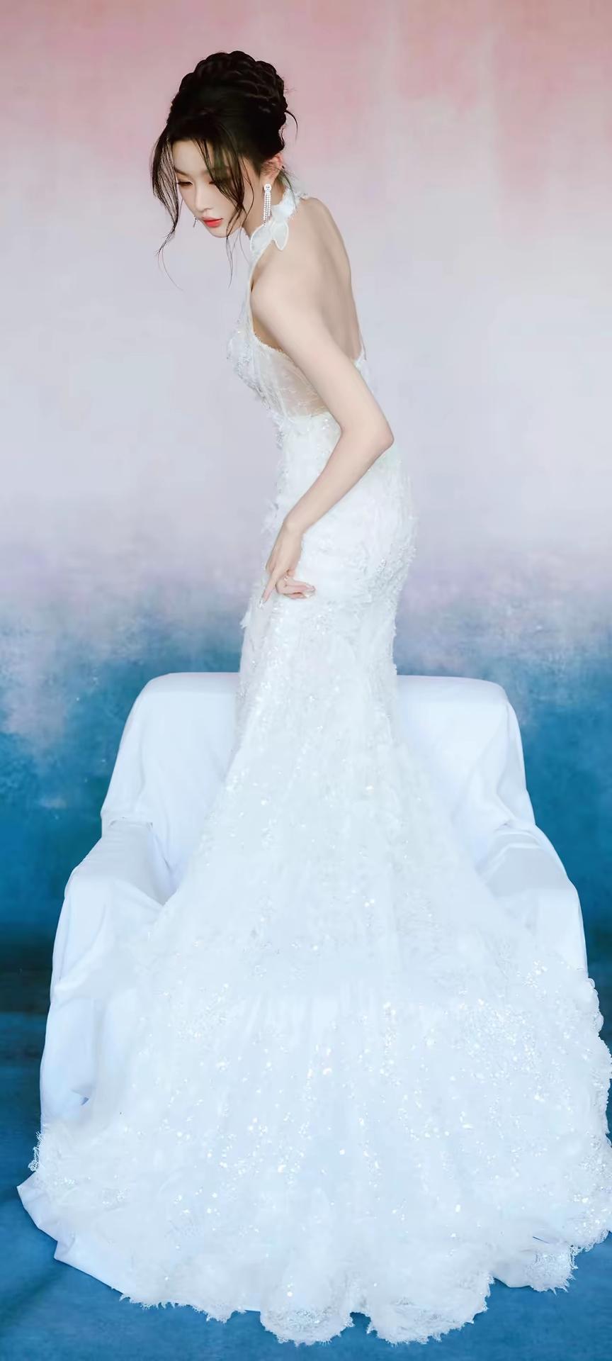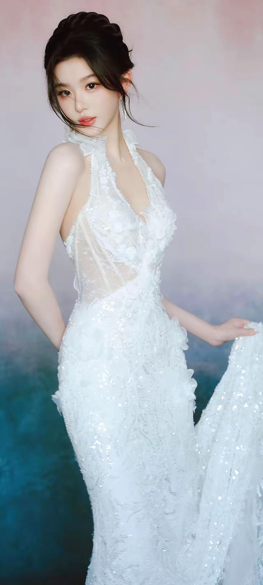 画面整体氛围 这组照片以渐变粉蓝梦幻背景为基调,搭配纯白婚纱与精致造型,营造出浪漫优雅的婚纱写真氛围,温柔又充满仪式感,宛如坠入云端的梦境。 👰 人物与造型 发型:乌黑长发被精心盘成复古高髻,几缕碎发自然垂落在脸颊两侧,既修饰脸型又增添了灵动柔美的气息。 妆容:清透底妆衬得肌肤白皙透亮,眼尾微扬的眼线与粉调眼影温柔灵动,唇妆是水润的蜜桃色,整体妆容精致又不失少女感。 配饰:长款流苏水钻耳饰垂坠耳畔,指尖佩戴的钻石戒指与透明碎钻美甲相互呼应,细节处尽显精致华贵。 👗 服饰与姿态 婚纱:一袭挂脖鱼尾白纱是视觉焦点,立体蕾丝花朵与亮片刺绣遍布裙身,挂脖设计露出优美肩颈线条,露背剪裁勾勒出蝴蝶骨,鱼尾裙摆贴合身形,行走间摇曳生姿,仙气十足。 姿态:她时而托腮凝望,眼神清澈含光;时而侧身倚坐,慵懒又优雅;时而提裙回眸,身姿曼妙;时而手捧花束,温柔缱绻,每一个角度都将婚纱的精致与女性的柔美展现得淋漓尽致。 🌸 道具与细节 花束:白色紫罗兰与粉郁金香的花束作为点缀,为画面增添了自然清新的诗意,与纯白婚纱相得益彰,更显浪漫氛围。 光影:柔和的光线均匀洒在身上,让婚纱的亮片与蕾丝纹理更具层次感,在渐变背景的衬托下,整体画面朦胧又梦幻。 整体而言,这组照片将婚纱的圣洁优雅与少女的灵动柔美完美融合,每一张都像一幅精致的梦境画卷,尽显高级又温柔的美感。