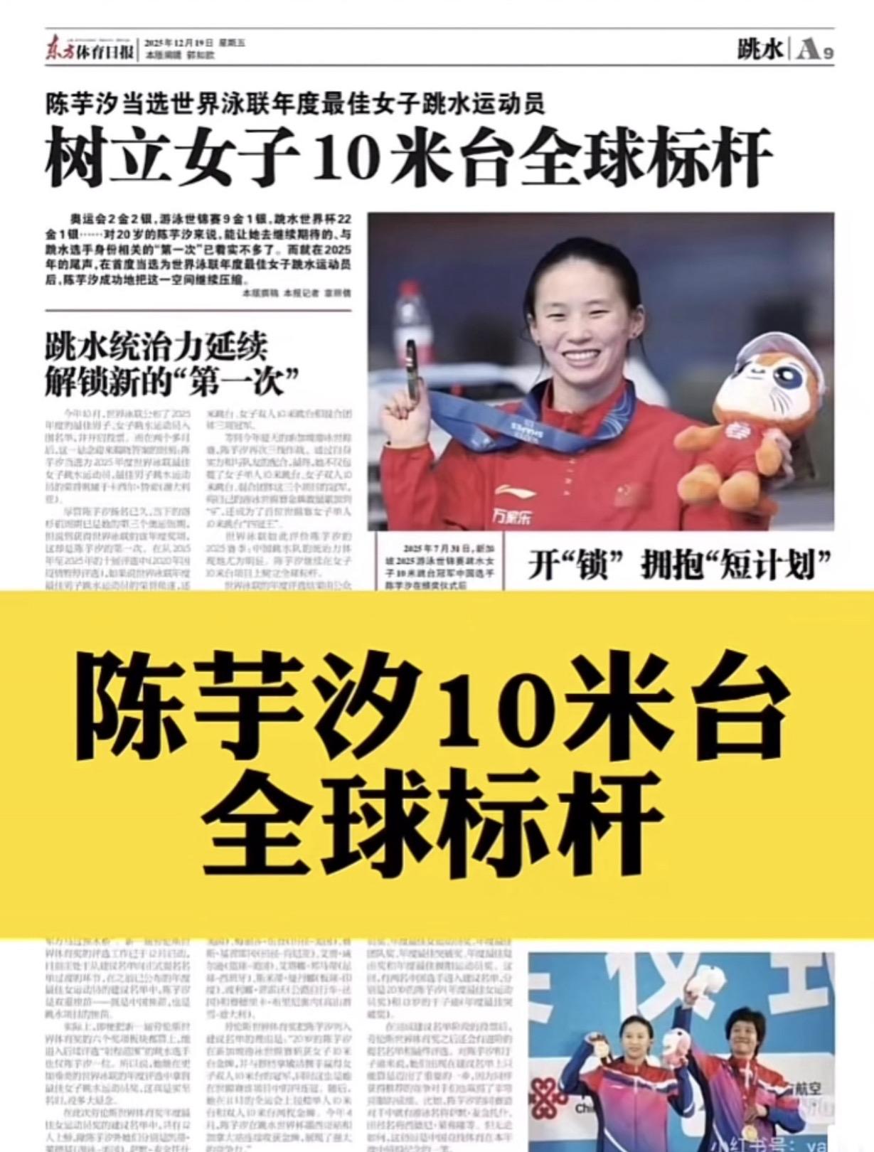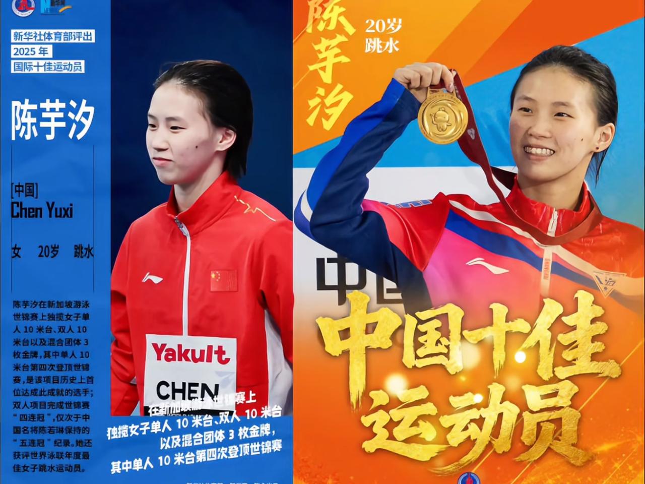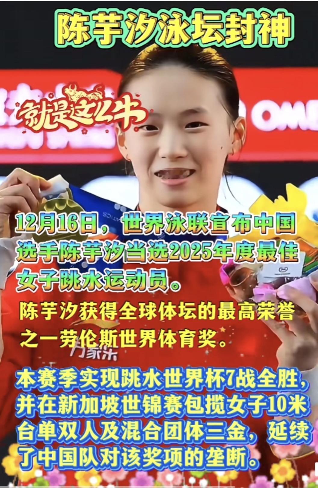 陈芋汐,世界跳水一姐一一 用事实说话 这个称号不是虚名, 而是由一系列沉甸甸的实绩铸成的。 一、官方认证 2025年世界泳联 年度最佳女子跳水运动员一一 这是国际泳联盖章的"全球第一"。 不是粉丝投票,不是媒体评选, 是这个世界最高跳水管理机构, 亲手把"年度最佳"颁给她。 二、历史突破 她是中国🇨🇳跳水史上, 唯一超过20岁仍能跳出 400+分的女子10米台运动员。 伏明霞没做到,陈若琳没做到, 她做到了。 世界泳联把她树为“女子10米台标杆”,不是因为天赋, 是因为她做到了别人做不到的事。 三、断层统治 2025年全运会,412.30分夺冠, 领先第二名近30分。 国内赛场, 她是唯一能稳定突破400分的人。 国际赛场,世锦赛四冠王、 世界杯总决赛四连冠、世界杯七金、 年度14冠—她用一整年的横扫, 伏明霞、陈若琳都未做到。 36枚国际金牌,世界泳联官网认证数据, 中国跳台历史第一。 证明什么叫“统治力”。 四、全球认可 劳伦斯世界体育奖提名, 唯一入围的中国🇨🇳女运动员。 (提名即认可!中国🇨🇳的骄傲!) 国际十佳运动员, 唯一入选的中国跳水选手。 世界泳联官方解说称她"跳水女王"一一这不是自封,是世界喊出来的。 五、精神品格 周继红说:“她的品质让我特别敬佩,永远在她脸上看不到情绪。” 四年网暴,她沉默;无数荣誉,她平静。 沉得住气,扛得住事, 这才是"一姐"该有的样子。 所以,陈芋汐是不是世界跳水一姐? 不是粉丝说的,是成绩说的。 不是媒体封的,是历史写的。 不是她自己要的,是世界泳联亲手颁的。 她用6年时间, 写完了别人一辈写不完的答卷。 从"想逃"到巅峰, 从"归零"到再攀一一 她用2025年的完美答卷向世界证明: 就是这个时代女子跳台的绝对一姐。