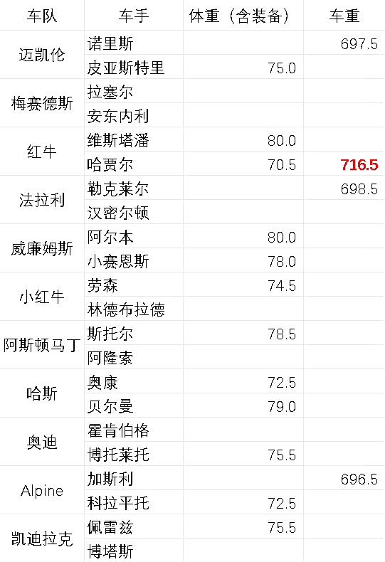 红牛真就成了红猪!根据F1中国大奖赛的数据,红牛F1赛车的重量比Alpine、法拉利、梅奔、迈凯伦重了19-20公斤。 车手方面潘子阿尔本均80.0kg(含头盔等装备),最令人意外的是奥康,185的身高连装备居然只有72.5kg。