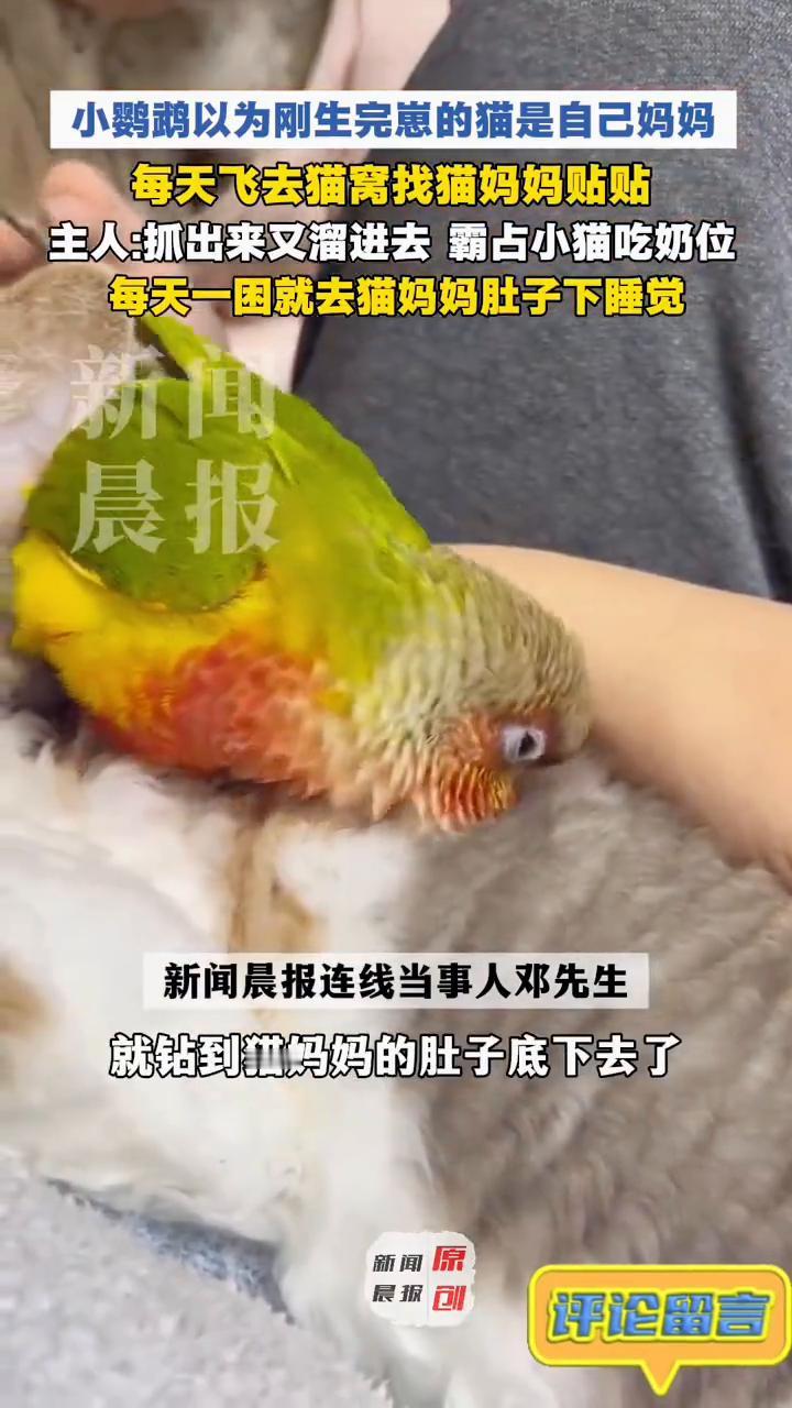 鹦鹉:你就是我选的恒温新妈妈。 小鹦鹉以为刚生完崽的猫是自己妈妈,每天飞去猫窝找猫妈妈贴贴。主人:抓出来又溜进去霸占小猫吃奶位。 我们家这只猫刚生完宝宝,有一天在检查小猫身体的时候,因为柜子门打开了,鹦鹉平时在家里面放养的,它就直接飞到柜子里面,然后就钻到了猫妈妈的肚子里下去了,猫妈妈并没有任何的排斥。鹦鹉3个月大,偶尔也还会去猫那边,就跟小猫互相挤。