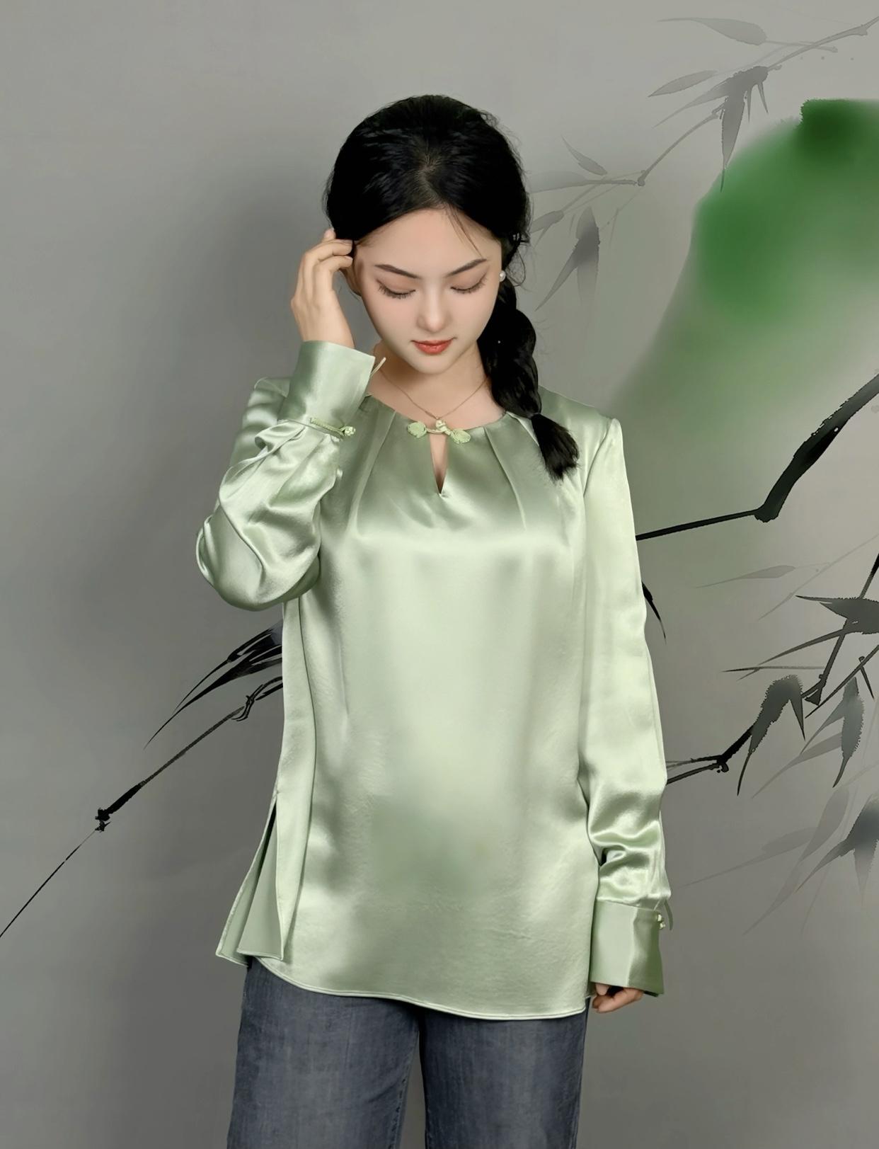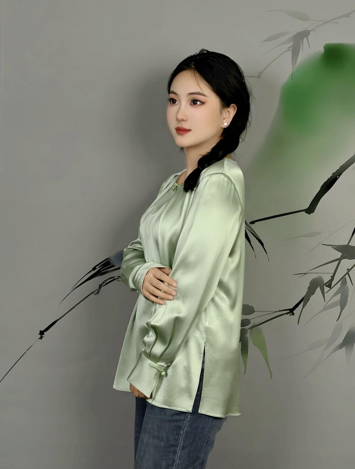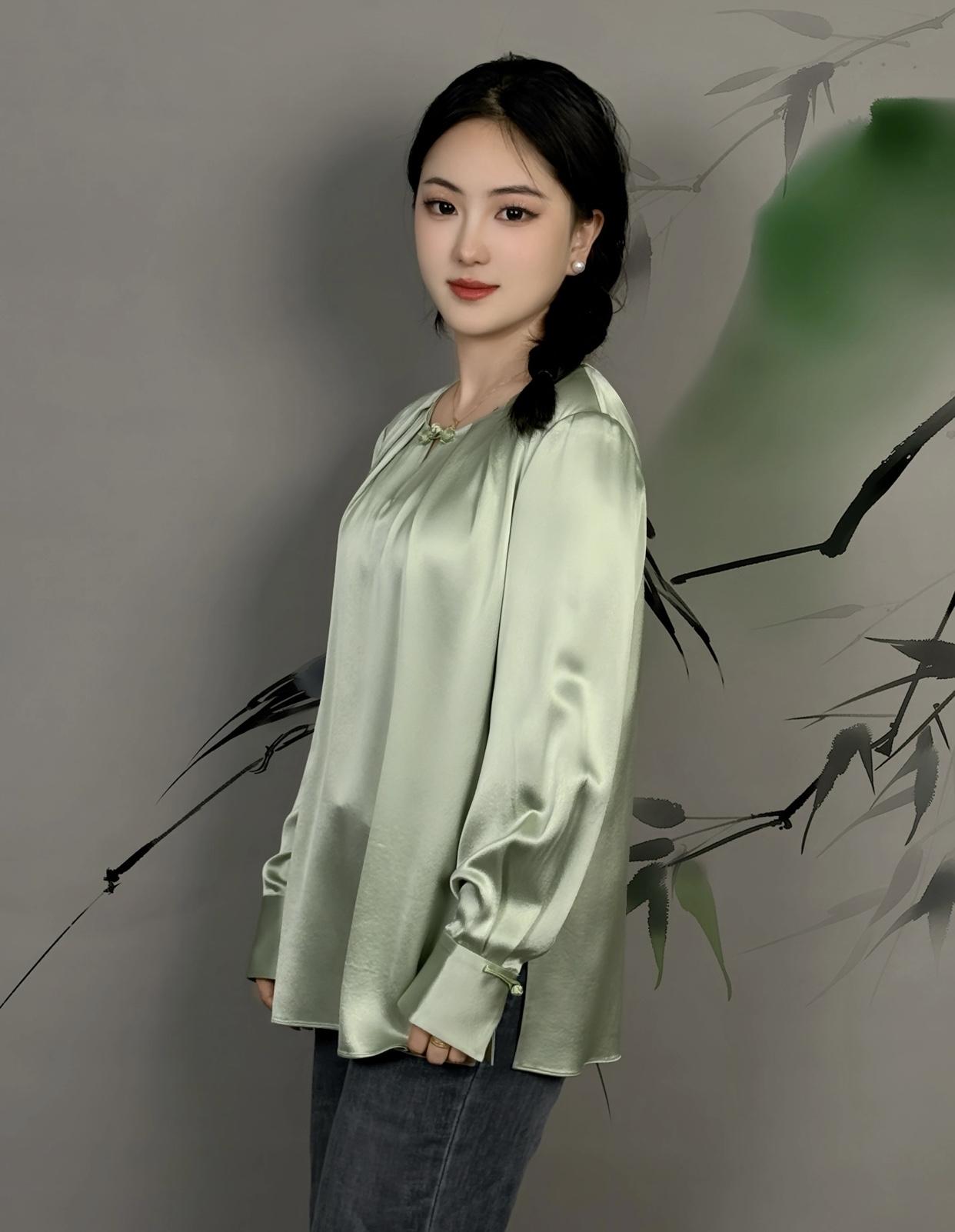 美女的美丽瞬间分享优雅气质,浅绿丝质衬衫,竹影背景,自然清新。