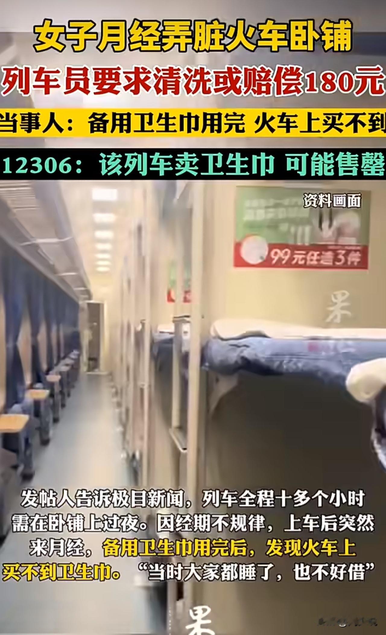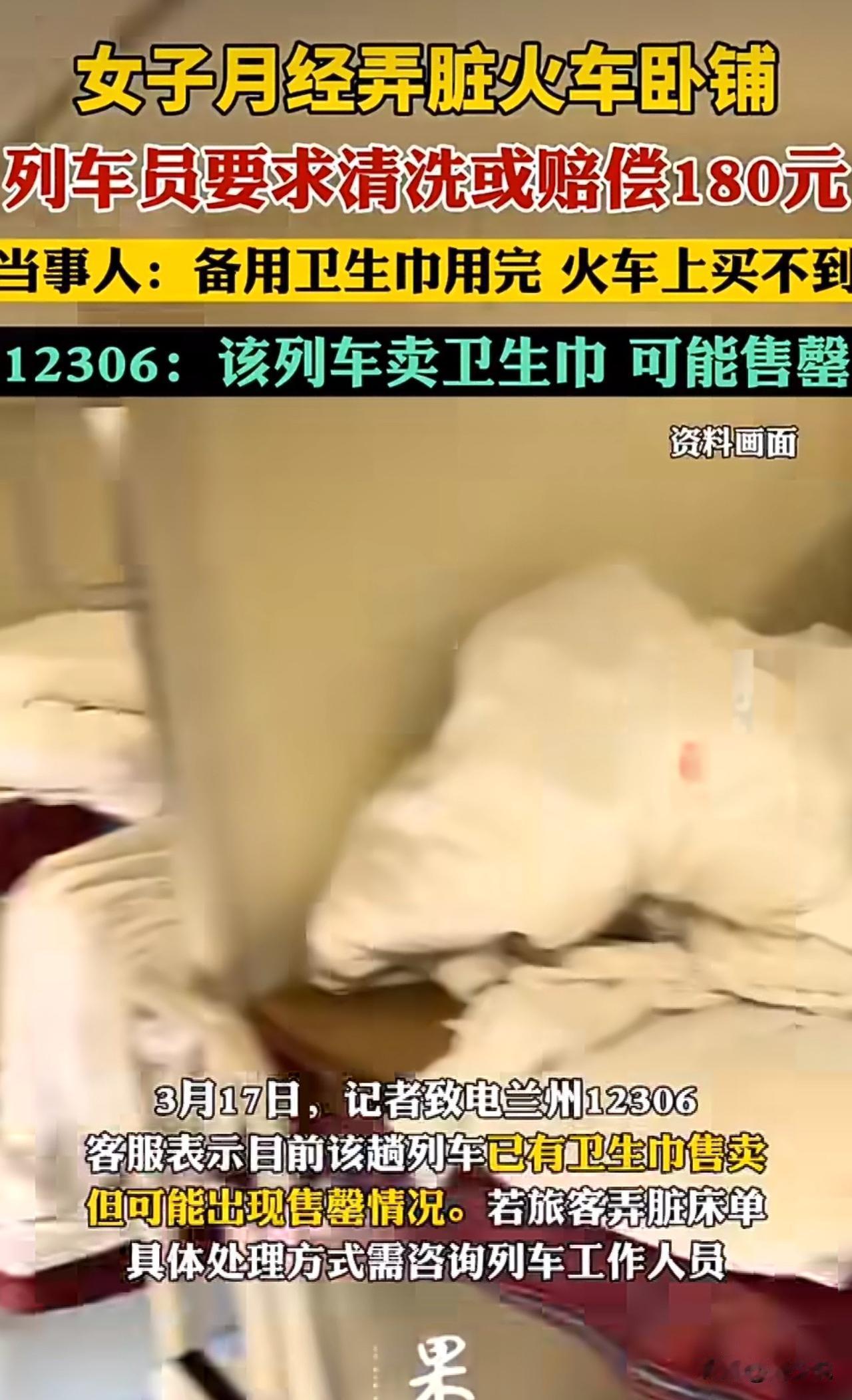 “全网吵翻!”近日,一则“女子月经弄脏火车卧铺被索赔180元”的消息冲上热搜,引发无数网友热议。 事发兰州铁路局K228次列车,这位女子因经期突然到访、车上又买不到卫生巾,不慎弄脏卧铺床单,列车员给出两个选择:要么自己洗干净,要么赔偿180元。窘迫之下,她只能亲手清洗床单,后半程一路站到下车。 此事被曝光后,瞬间引发全网热议。有网友当即表示:“我也遇到过类似情况,跟列车员好好沟通后,对方直接换了新床单,没让赔也没让洗。” 还有人说:“180元实在太高了,正常清洗根本花不了这么多钱。” 针对此前情况,12306客服回应,目前该趟列车已上架卫生巾,但难免出现售罄;床单弄脏后的处理,多由现场工作人员酌情决定。 在周少看来,这件事远不止“赔不赔钱”这么简单。这位女子并非故意损坏物品,只是突发生理状况,列车方按“污损赔偿”处理,未免缺少人情味。 票价里本就包含卧具清洁费用,可清洗的污渍,不该让乘客额外买单。更值得思考的是,卫生巾和纸巾、热水一样,都是女性出行刚需,长途列车的补给,还能再细致一些。 公共服务的温度,往往藏在这些容易被忽略的细节里。少一点生硬规定,多一点共情与灵活,也许就能避免很多不必要的尴尬与争执。就目前这种要求,显然会造成舆论压力。#寻美三湘# #周少说教育# #寻美湖南#