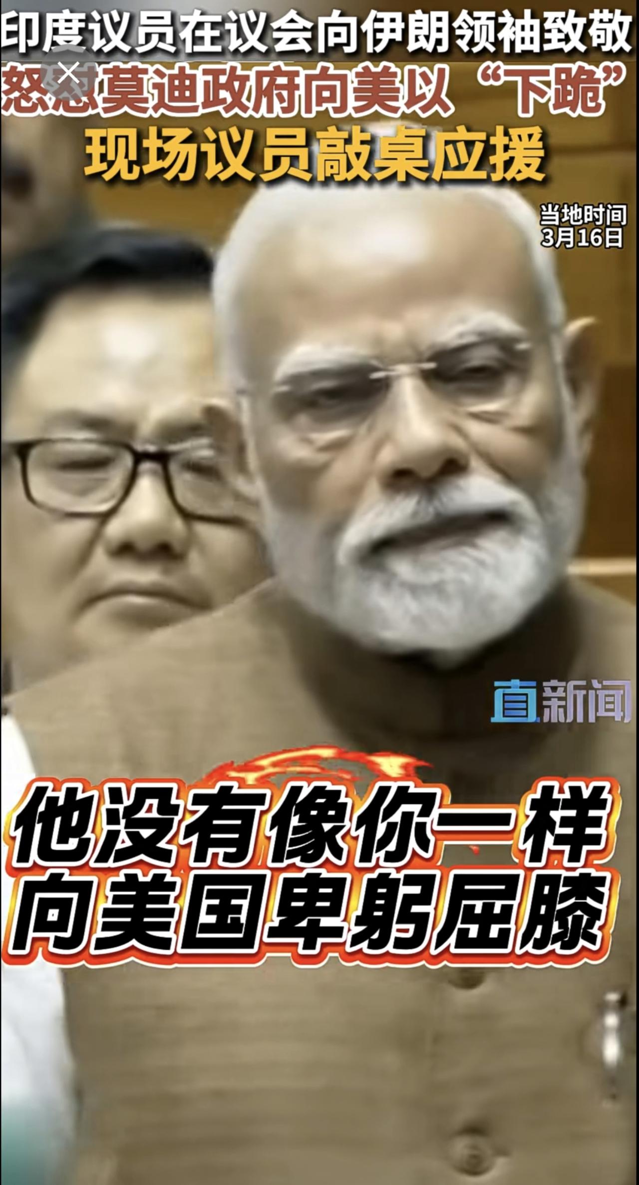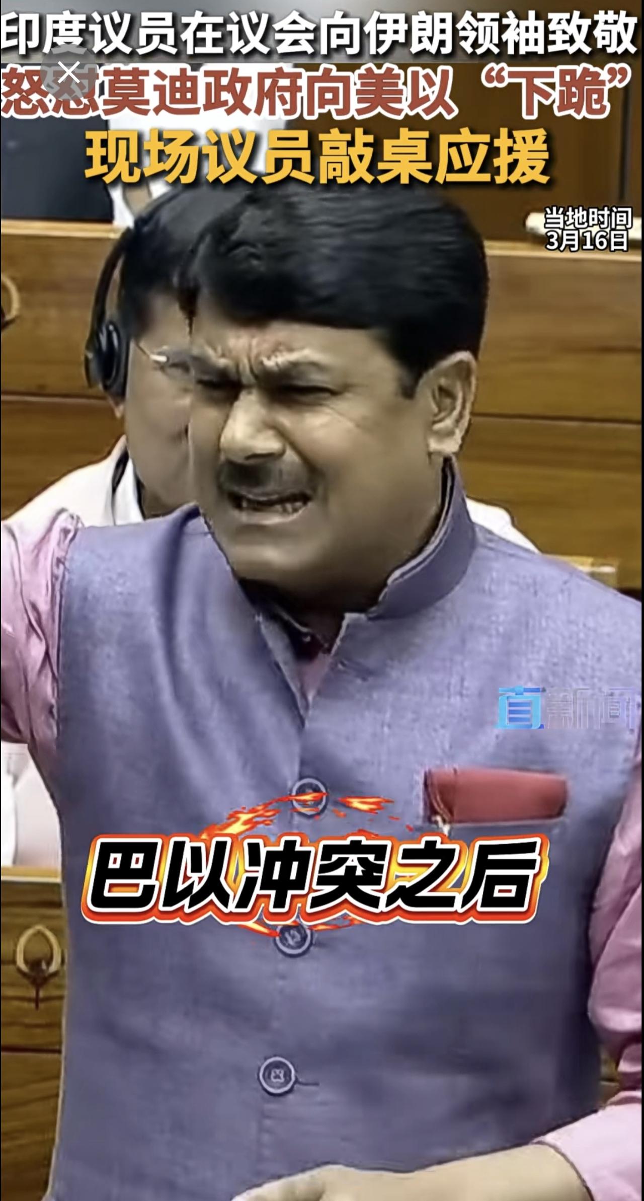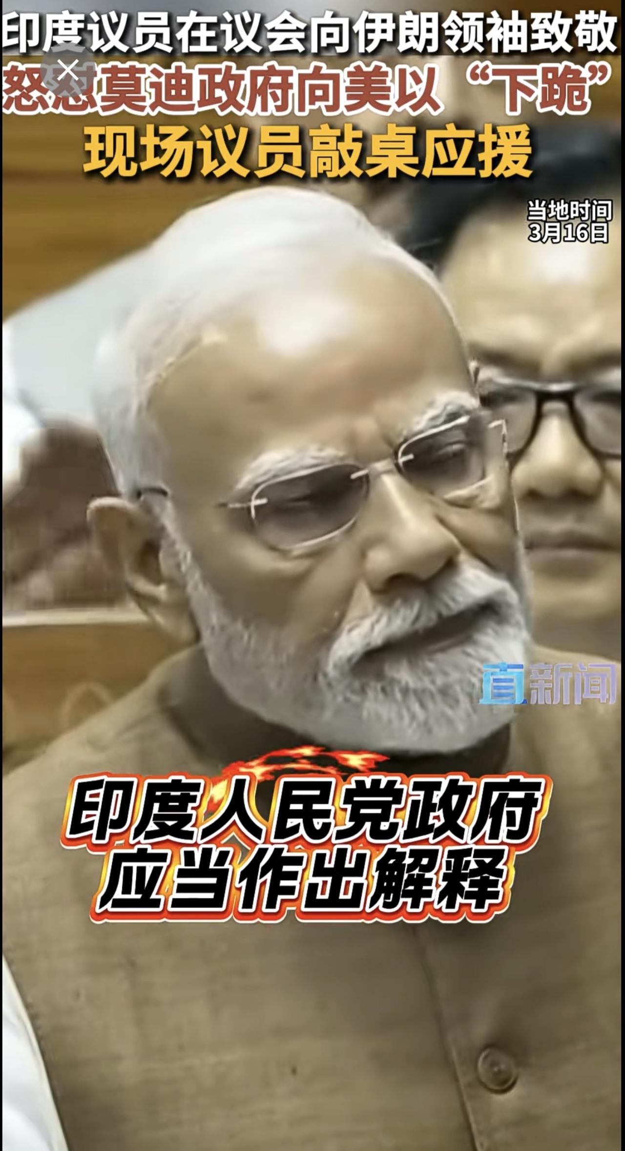 当地时间3月16日,印度议员在议会公开向伊朗最高领袖哈梅内伊致敬。