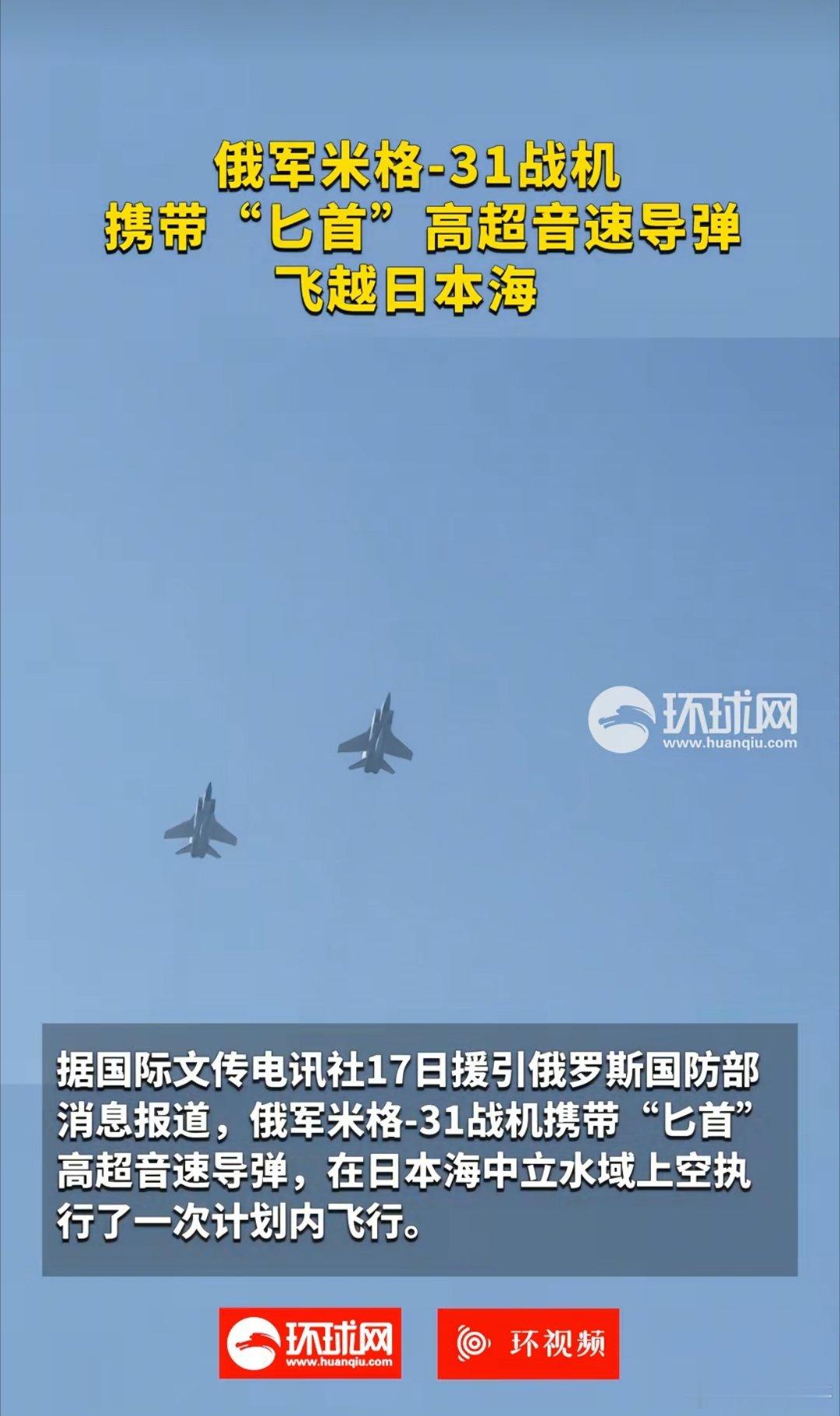 快讯!俄罗斯国防部:俄军米格-31战机携带“匕首”高超音速导弹,在日本海中立水域上空执行了一次计划内飞行。 俄米格31携高超音速导弹飞越日本海
