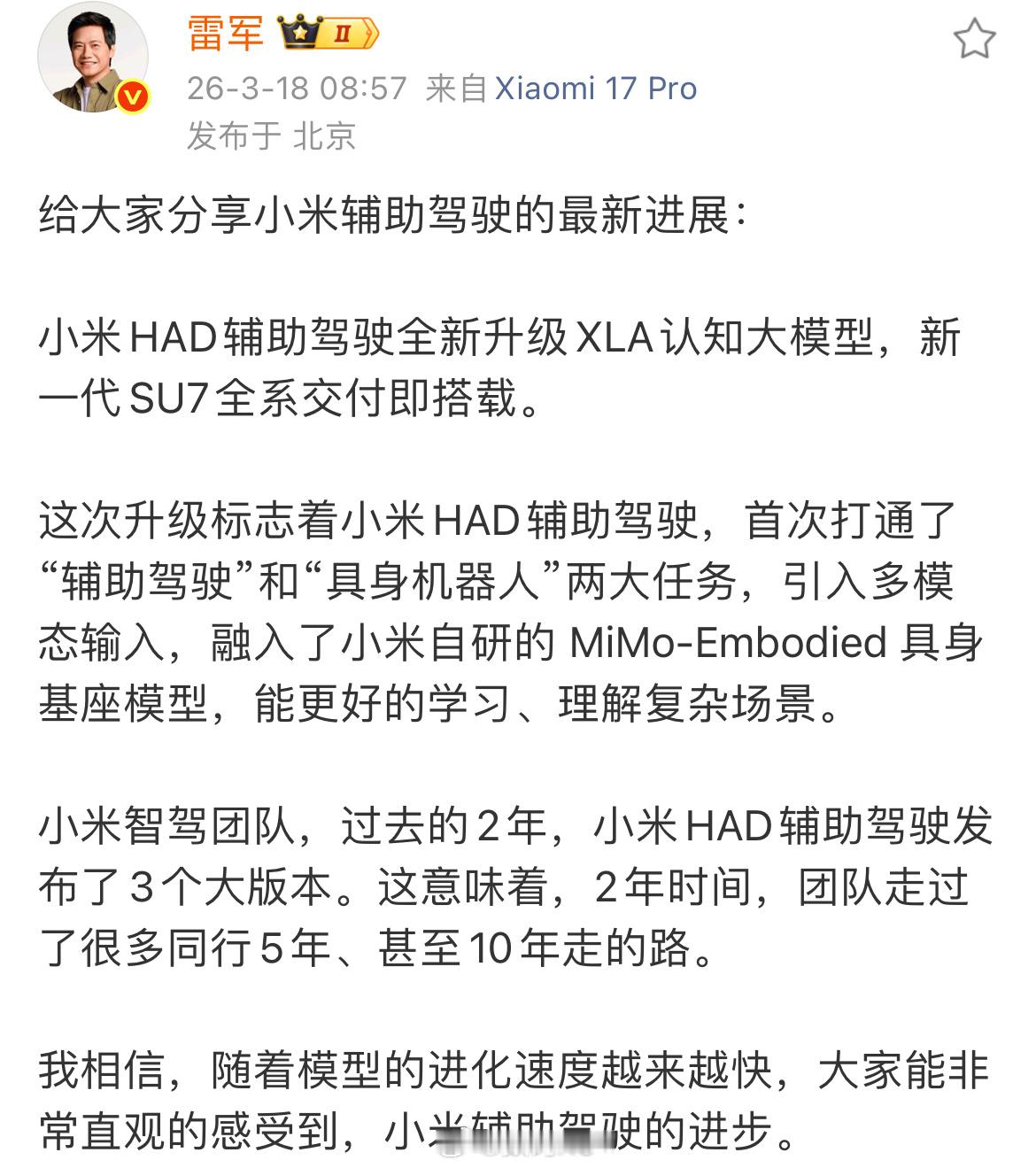 新一代小米su7全系标配小米HAD辅助驾驶,全新升级XLA认知大模型,新一代SU7全系交付即搭载。简单一句话就是像真人一样会思考开车,实现会思考、会推理的智能驾驶。而且还是小米自研的 MiM1o-Embodied 具身基座模型,这你受得了吗?辅助驾驶这块如今各家进步都很大,只能说智驾没有护城河的含金量还在升高。