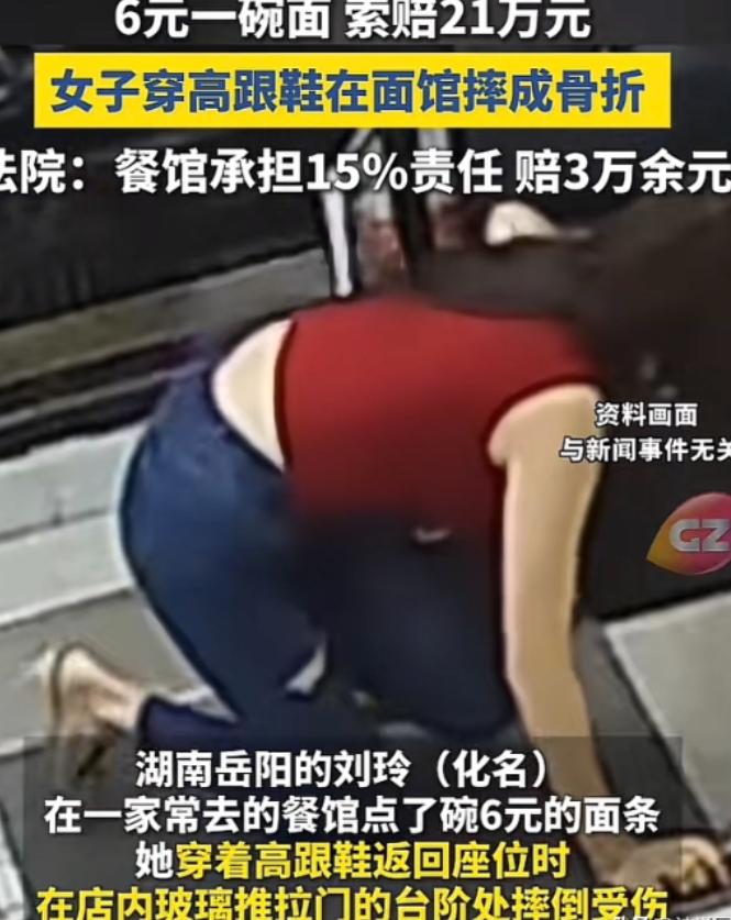 “锅从天降!”湖南,一女子在餐馆,花6块点了碗面,岂料在起身时,高跟鞋踢到门台阶摔倒,造成左腿骨折住院,事后,女子认为是餐馆没做好安全措施,要求对方赔偿21万,而法院判决令人意外! 湖南岳阳有一家街坊小店,那天三十多岁的刘晓梅独自走进店里,跟老板点了一碗热干面,吃完之后起身准备离开。 没成想,她的走到门口的台阶时,脚上穿的高跟鞋鞋和台阶发生剐蹭,整个人失去平衡,狠狠摔在了地上。 摔倒之后,刘晓梅当场就疼得站不起来,脸色苍白,嘴里不停喊着腿疼,餐馆老板见状,赶紧上前查看,还连忙帮忙叫了救护车,把她送到了附近的医院。 经过医院的详细检查,刘晓梅被确诊为左腿髌骨骨折,必须马上接受手术治疗,后续还要经过很长一段时间的康复休养,前前后后花了不少医疗费。 出院之后,刘晓梅做了专业的伤情鉴定,结果是十级伤残,医生建议她伤休180天,其中前90天需要有人护理,还要补充60天营养。 看着自己的伤情,又算了算医疗费、护理费、误工费还有精神损失费,刘晓梅觉得这笔损失不该自己承担,于是就找到了餐馆老板,提出了21万元的赔偿要求。 她索赔的理由是认为餐馆没有做好安全保障措施,门口的台阶不仅有一定坡度,还有几处瓷砖开裂,既没有做足够的防滑处理,也没有张贴任何安全提醒标识,存在明显的安全隐患,才导致自己摔倒受伤。 可餐馆老板却觉得很委屈,也坚决拒绝赔偿这么多钱。 老板说自己的小店经营多年,平时客人来来往往,从来没出过这样的安全事故,当天其他客人经过台阶时,也都好好的,没有出现摔倒的情况,说明台阶本身没有大的安全问题。 而且他强调,刘晓梅当天穿的是高跟鞋,本身走路就容易不稳,她自己没有留意脚下的台阶,疏忽大意才是摔倒的主要原因,不能把所有责任都推到自己身上。 更让老板无奈的是,他的小店一年也挣不了几万块,一碗热干面的利润还不到一块钱,21万元的赔偿,他根本赔不起,一旦赔偿,经营多年的小店可能就彻底垮了。 双方就赔偿的事情,谈了一次又一次,始终谈不拢,刘晓梅没办法,只能一纸诉状,把这家餐馆告上了法院,要求法院判令餐馆承担全部责任,赔偿自己所有损失共计21万元。 法院受理案件后,并没有只听双方的一面之词,而是第一时间到事发餐馆进行了现场勘查,仔细核实了台阶的高度、坡度,还有地面瓷砖的破损情况。 同时,法院还调取了医院的诊疗记录、双方的陈述,以及事发时的监控录像,还传唤了当天在场的证人,全面还原了整个事发经过。 证人证实,当天在餐馆就餐时,行走没有任何不适,也没有看到台阶上有油渍、水渍等易滑物,其他客人也都没有出现摔倒的情况。 结合这些证据,法院最终做出了判决,刘晓梅自行承担85%的责任,餐馆承担15%的责任,赔偿她3万余元。 很多人不解,为什么法院会这样判,餐馆到底有没有责任,为什么只承担一部分。 其实从法律上来说,餐馆作为经营场所,确实有义务对进入店内的消费者尽到安全保障义务,这是《民法典》里明确规定的。 法院经过勘查发现,餐馆的台阶确实有一定坡度,地面还有瓷砖开裂的情况,虽然做了简单的防滑处理,但没有张贴明显的安全提醒,在安全保障上存在疏忽,这就是餐馆需要承担部分责任的原因。 但反过来,刘晓梅作为成年人,具有完全民事行为能力,她自己也有注意自身安全的义务。 另外,法院也考虑到,餐馆的安全保障义务是“合理限度”内的,不是说只要消费者在餐馆受伤,餐馆就必须全额赔偿,还要结合双方的过错程度来判定。 而且餐馆经营规模小、利润微薄,法院也兼顾了餐馆的负担能力,所以最终酌情判定餐馆承担15%的次要责任。 判决出来后,刘晓梅没想到自己要承担绝大部分责任,拿到的赔偿也远低于自己的预期。 而餐馆老板虽然还是要赔钱,但3万多块钱不至于让他的小店倒闭,也算是松了一口气。 说到底,这场纠纷里,没有绝对的赢家,刘晓梅受了伤、花了钱,餐馆也付出了赔偿代价。 这也告诉我们,消费者在公共场所,一定要注意自身安全,尤其是穿着高跟鞋等不方便行走的鞋子时,更要多加留意。 经营场所也一定要尽到合理的安全保障义务,及时消除安全隐患、张贴安全提醒,避免类似的纠纷发生。