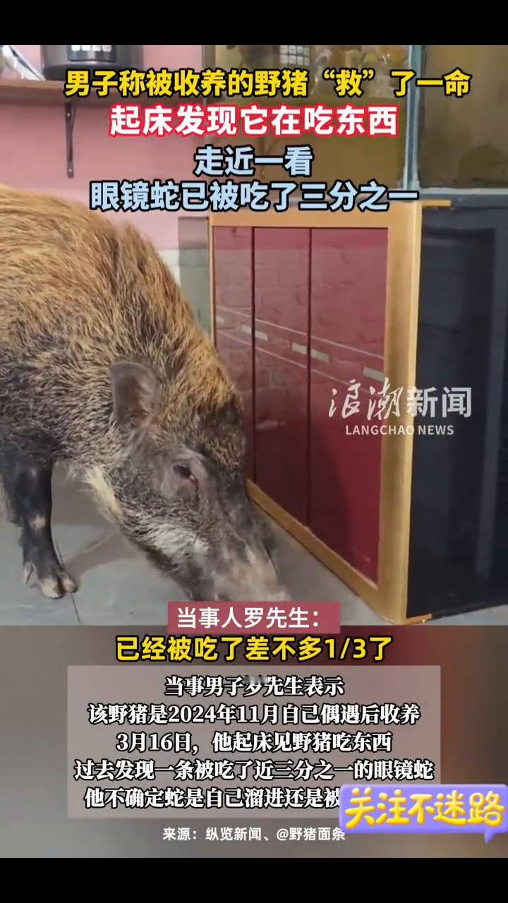 男子称被收养的野猪"救"了一命,起床发现它在吃东西,走近一看眼镜蛇已被吃了三分之一。 浪湖新闻。 3月16日,据媒体报道,广州一男子发布视频称疑似被收养的野猪救了一命。当事人罗先生:起床看到它在那吃东西,过去一看是一条眼镜蛇,已经被吃了差不多1/3了。 当事男子罗先生表示,该野猪是2024年11月自己偶遇后收养。3月16日,他起床见野猪吃东西,过去发现一条被吃了近三分之一的眼镜蛇,他不确定蛇是自己溜进还是被。 关注不迷路。
