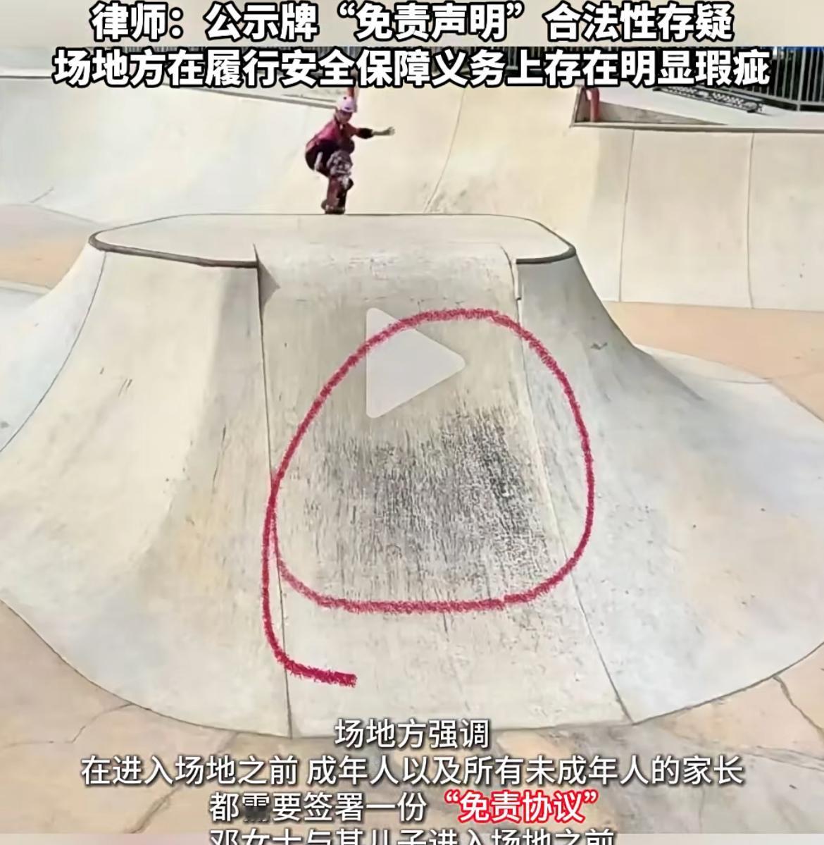广州一 9 岁儿童玩滑板摔伤,其母亲质疑场地有问题,监管不到位。场地方则称他们和家长签署了免责声明,玩滑板场内摔伤或造成他人受伤的一律自行负责,和场地无关。虽然这个场地是收费的,但是玩滑板是绝对的高危运动,受伤在所难免,作为家长应该对此风险有充分的评估和认知。不要因为出了问题就想找场地上方负责,如果都要找他负责,这个场地肯定开不下去。