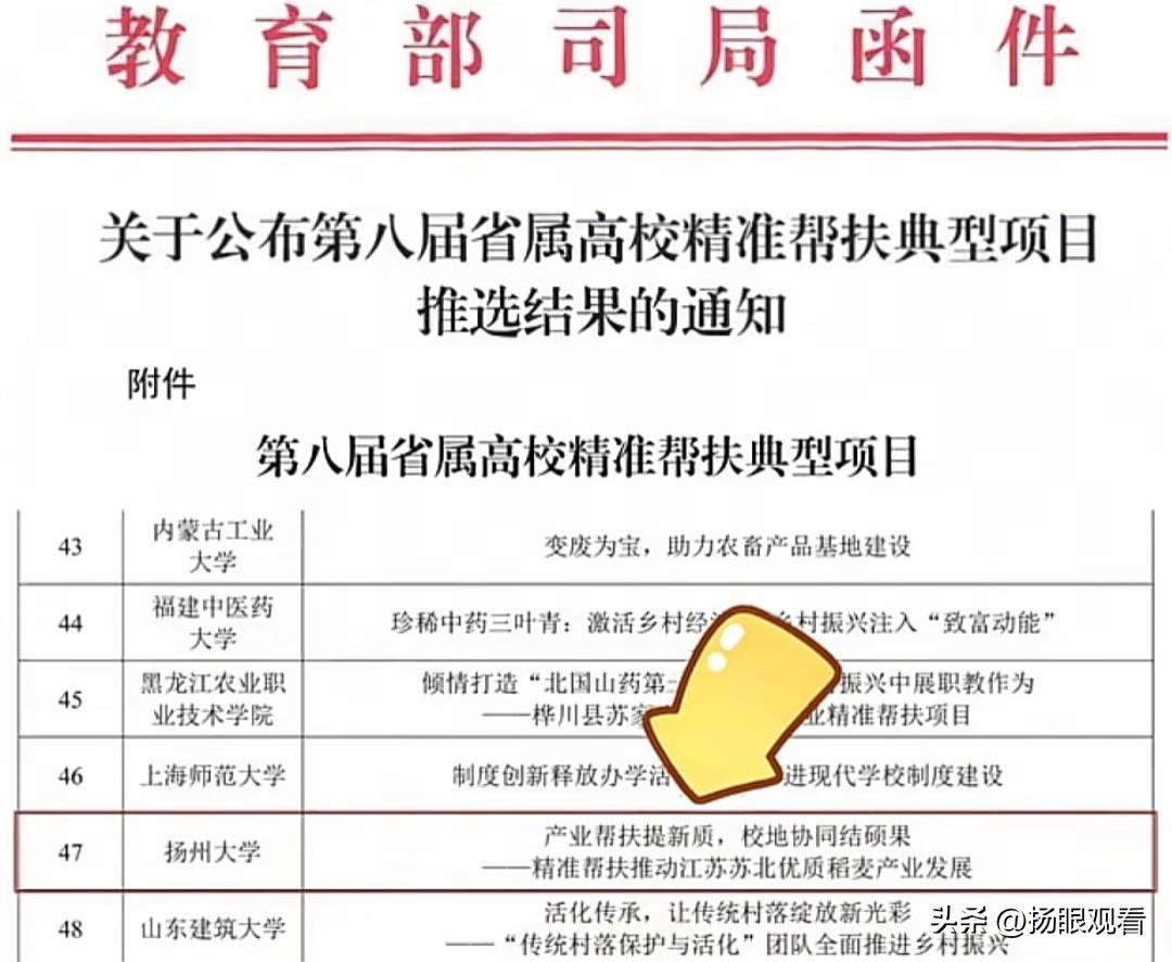 太牛了!扬州大学喜提国家级荣誉🎉扬州大学又双叒叕获奖了👏 我刚刷到教育部公布的第八届省属高校精准帮扶典型项目 咱们扬大农学院成功入选!全国仅66个,含金量直接拉满💯 项目是《产业帮扶提新质 校地协同结硕果——精准帮扶推动江苏苏北优质稻麦产业发展》,说真的,这才是高校真正的“硬核实力”! 作为省属高校,扬大农学真的一直在默默搞大事🌾 扎根苏北稻麦主产区,把实验室直接搬去田间地头 帮农户育良种、推新技术、建科技小院 实实在在让优质稻麦提质增产,帮乡亲们赚钱致富 守护“江苏粮仓”不是口号 是农学院老师天天泡田里的汗水 是一代代扬大人的农学担当✨ 以前总觉得高校帮扶离我们很远 现在才发现,扬大真的把帮扶做到了泥土里 把论文写在了大地上! 热烈祝贺扬州大学! 为咱们有情怀、有实力的扬大疯狂打call📣