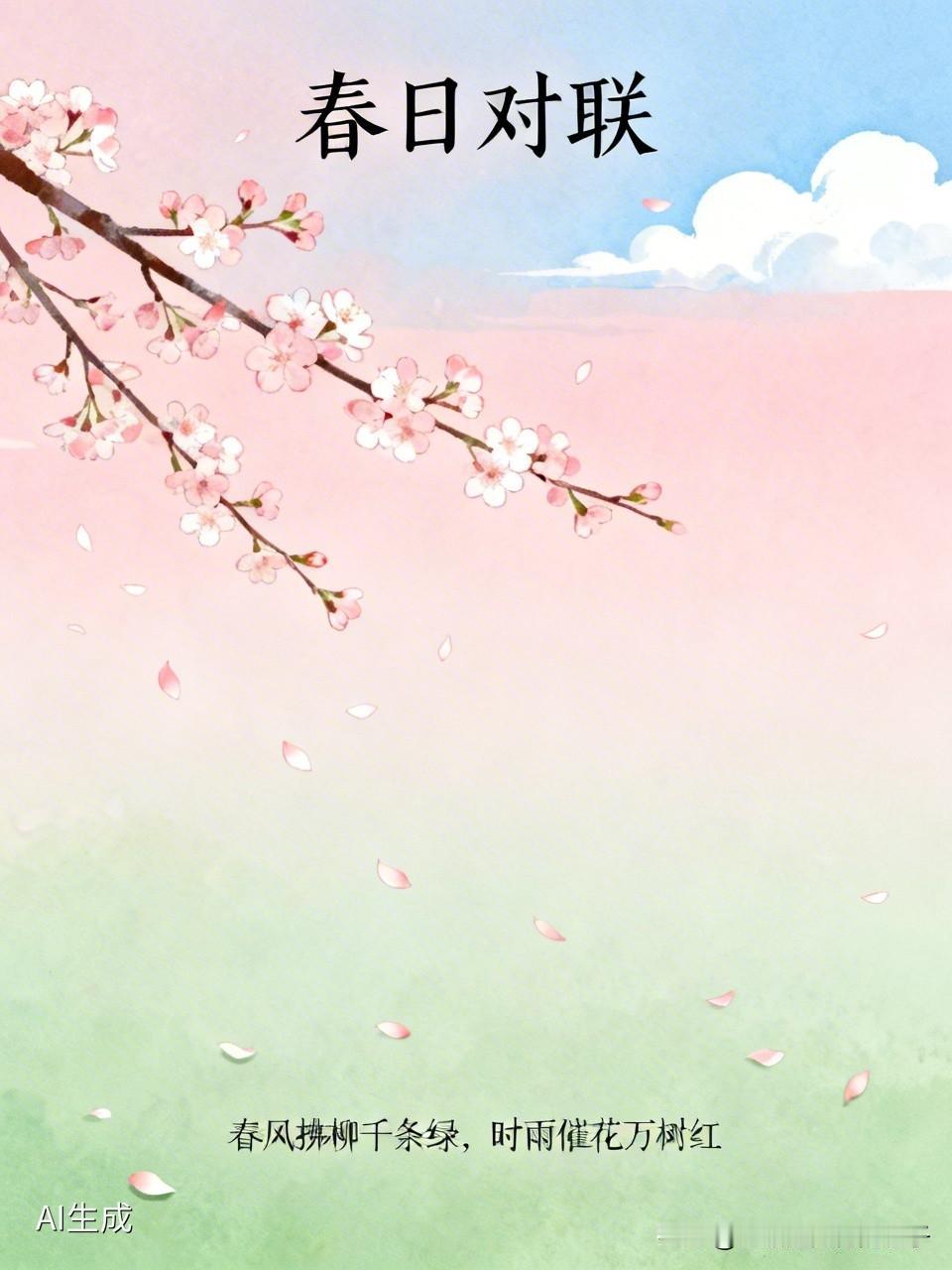 写一副春日对联 春日对联,得有春天的生机勃勃。我来写一副:上联“春风拂柳千枝绿”,下联“旭日映花万朵红”,横批“春满人间”。 春天的风轻轻拂过,柳树抽出嫩绿的新芽,枝条随风摇曳,所以是“春风拂柳千枝绿”。旭日东升,阳光洒在花朵上,万紫千红,“旭日映花万朵红”描绘出了春日繁花似锦的景象。“春满人间”则概括了整个春天温暖、美好的氛围,感觉把春天的活力都写进对联里啦。