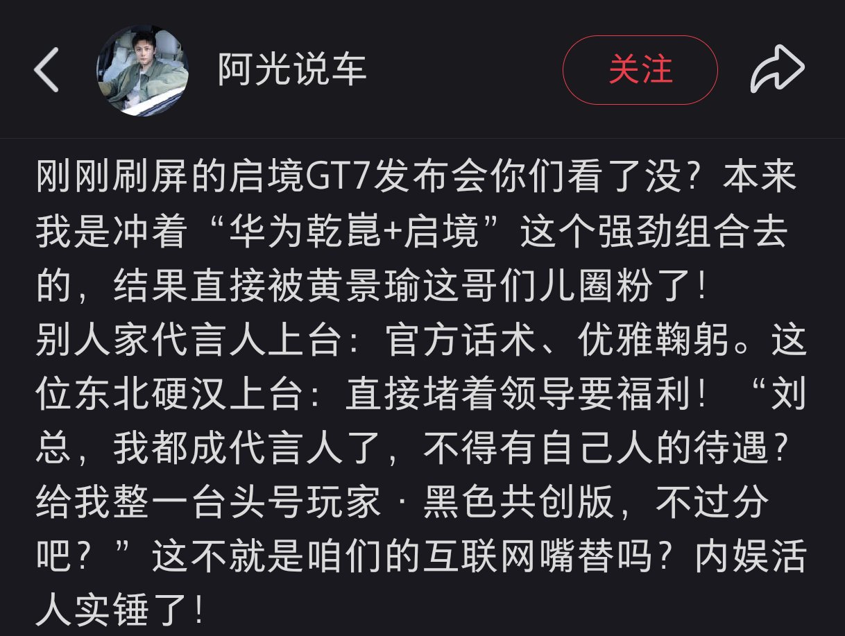 黄景瑜︱启境汽车全球首发︱嘉宾评价我是冲着“华为乾崑+启境”这个强劲组合去的,结果直接被黄景瑜这哥们儿圈粉了!别人家代言人上台:官方话术、优雅鞠躬。这位东北硬汉上台:直接堵着领导要福利!“刘总,我都成代言人了,不得有自己人的待遇?给我整一台头号玩家·黑色共创版,不过分吧?”这不就是咱们的互联网嘴替吗?内娱活人实锤了! ”