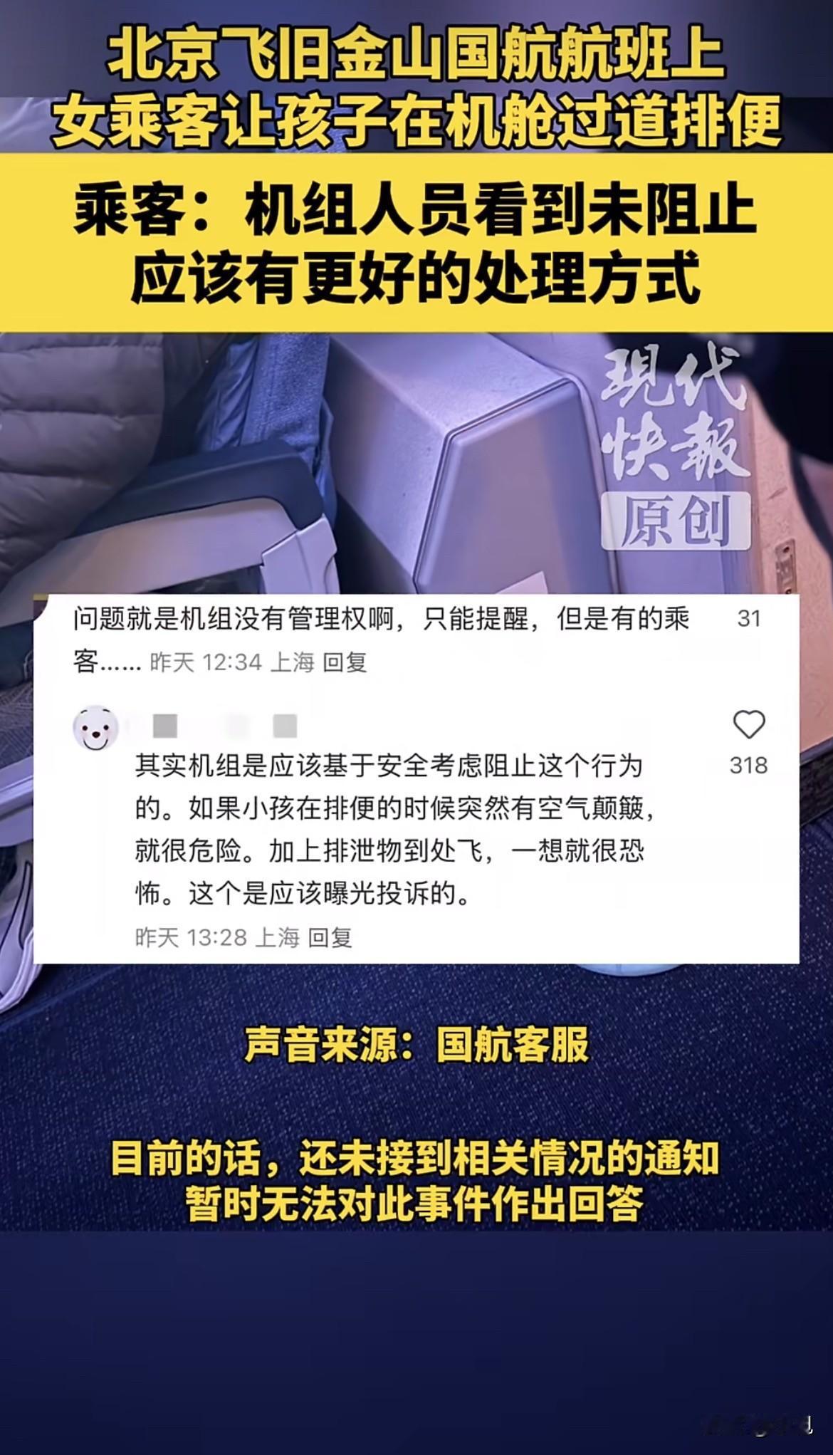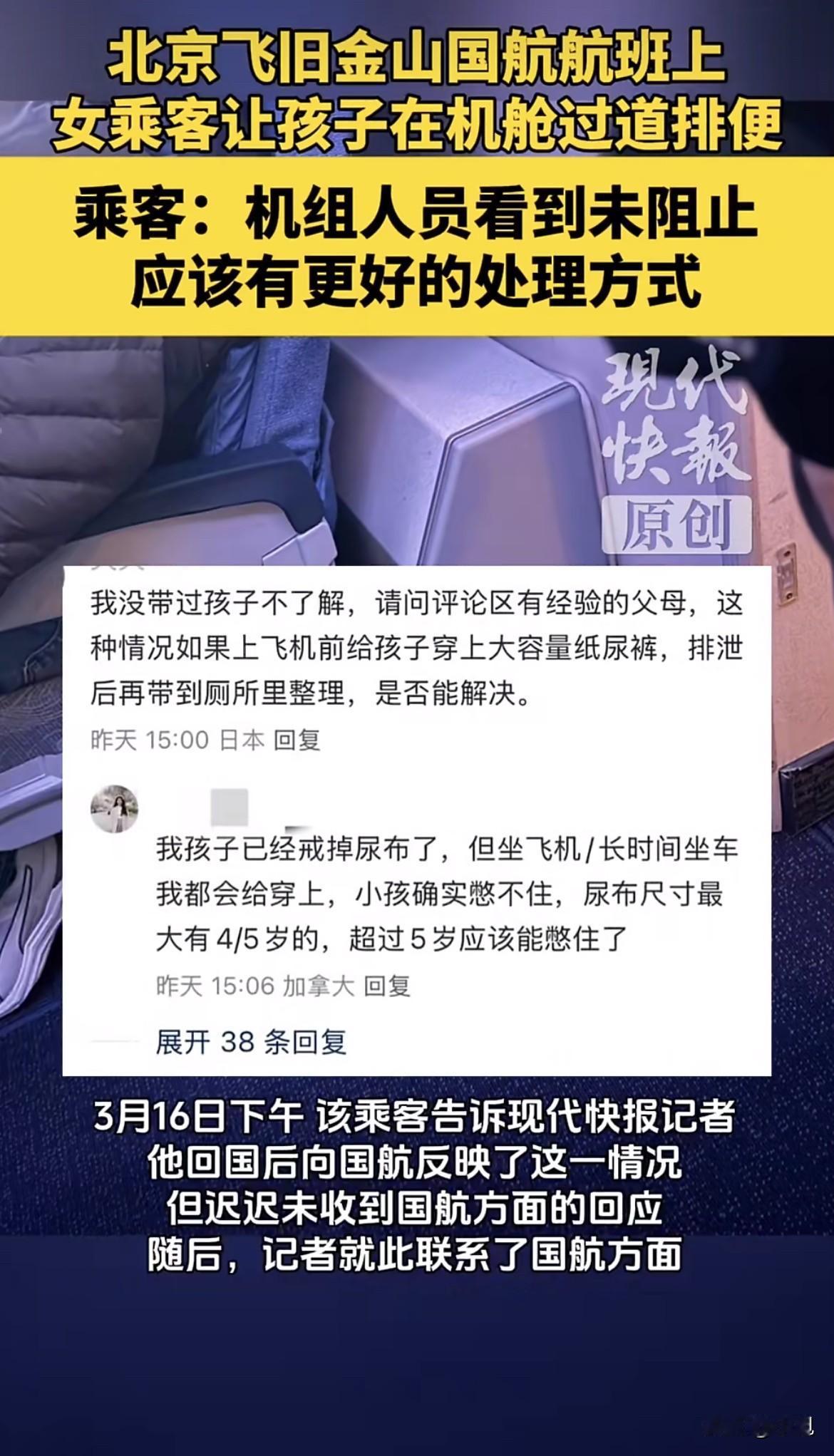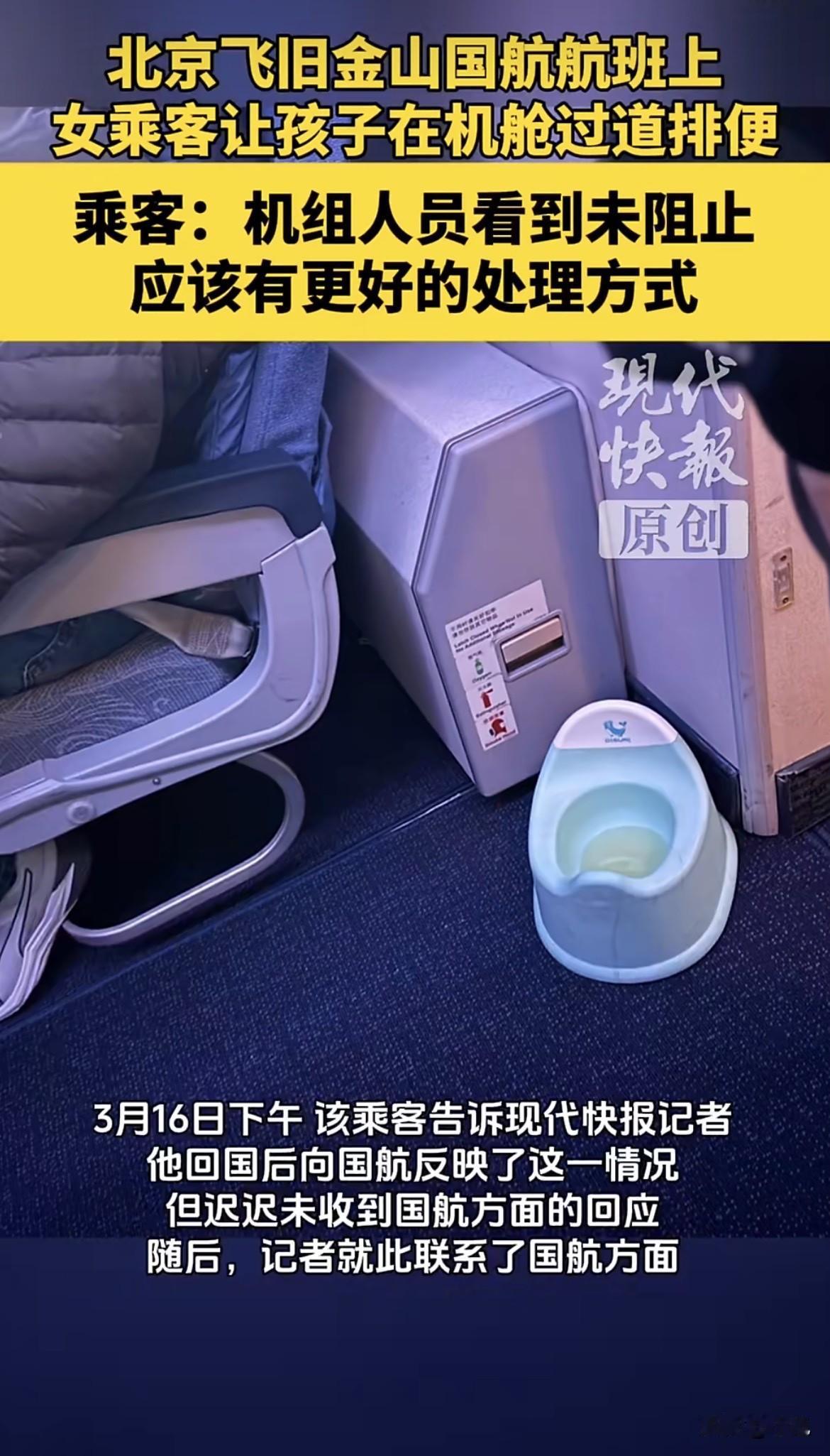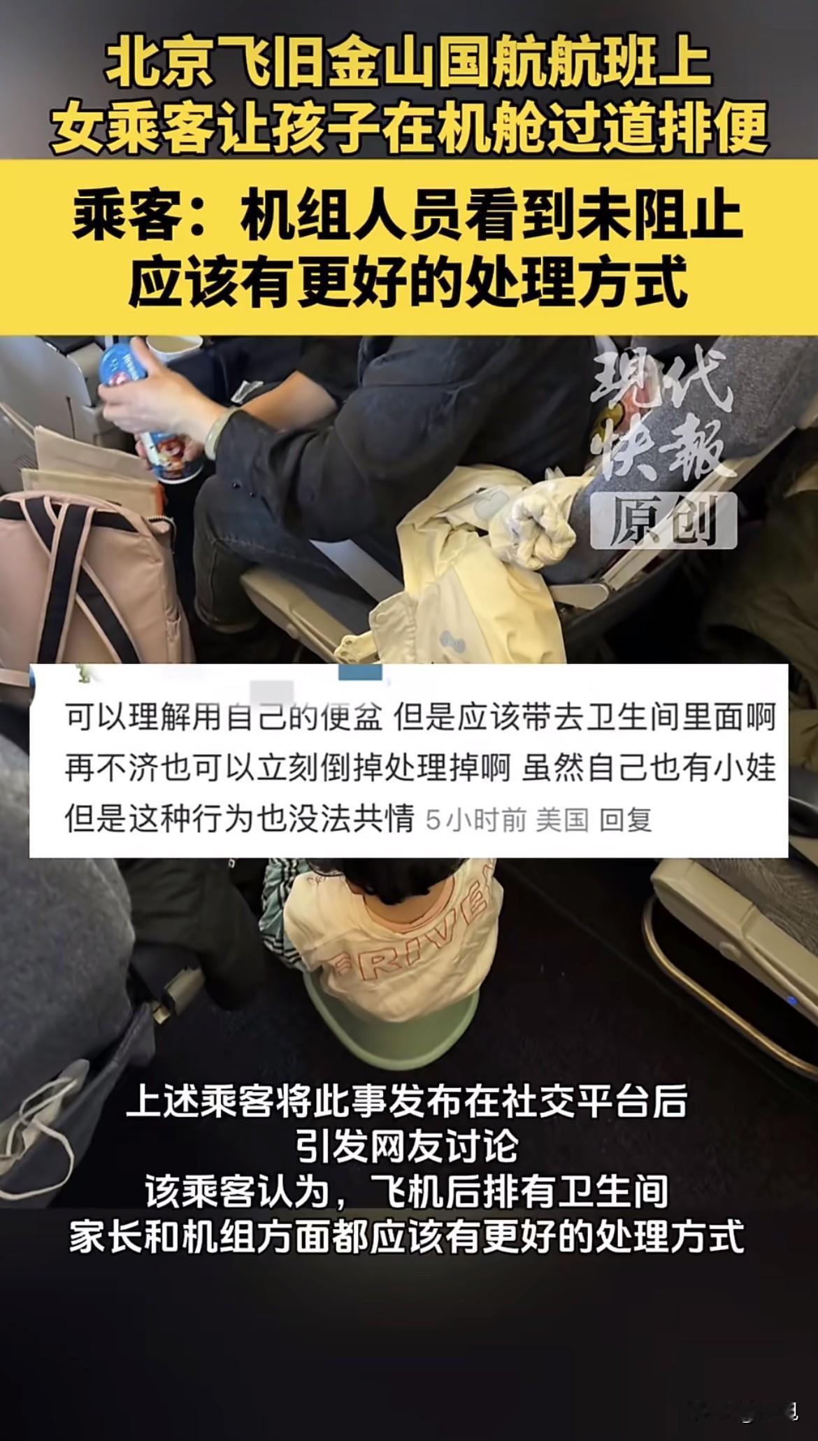 3月7号,国航CA985,北京飞旧金山。 飞机平飞以后,机舱过道中间,一个两三岁的孩子蹲在那儿,面前放着个塑料小马桶,正在排便。 旁边座位上,应该是孩子妈妈,就在那儿守着。 马桶里接着尿,味儿在密闭的机舱里散着,躲都躲不开。 同机的张先生后来跟记者说,他当时看了半天,最想不通的不是这个当妈的,而是机组人员。 乘务员就在过道里来回走,一趟一趟的,都看见了,但没一个人上去说句话,没一个人管。 飞机后排就有卫生间,走几步就到。 哪怕孩子认自己的小马桶,当妈的拿着马桶,带孩子进厕所里关上门解决,也就一分钟的事。 为什么非要在过道上? 张先生说,那个味儿一直到下飞机他都还记得。 他回国以后给国航打电话投诉,想知道机组当时为什么不管。 结果电话打过去,没人给回复。记者去问,客服说没接到通知,让发邮件等着。 这事儿发到网上以后,评论区吵得厉害。 有人说两三岁的孩子,又不是婴儿,早该训练如厕了,当妈的这心也太大。 有人提了个更实在的,飞机上万一有个气流颠簸,孩子蹲在过道中间,大人扶都来不及扶,真要出事儿算谁的? 安全这根弦,在飞机上不是闹着玩儿的。 也有当妈的出来说话,说带孩子出门太难了,两三岁说拉就拉,根本拦不住,有时候真是没办法。 这话听着心酸,但仔细想想,拦不住孩子,大人能拦住自己。 拿着小马桶去厕所,几步路的事,怎么就迈不开这个腿? 还有人说,可能是孩子认马桶,死活不用外面的,当妈的拗不过。 这个说法倒是值得琢磨。 两三岁的孩子,正是秩序敏感期,认自己的东西,认固定的流程,换了地方拉不出来,哭闹起来更麻烦。 当妈的可能是怕孩子在飞机上哭,影响更多人,才想出这么个折中的办法。 但这个"折中",折的是别人的感受。 过道是公共区域,几百号人挤在密闭空间里飞十几个小时,那个味儿散不掉,别人难受不难受? 机组人员不说话,才是最让人琢磨不透的。 是不想管,还是不敢管,还是觉得这事儿不归自己管? 飞机上乘务员权力不小,真有安全隐患或者影响其他乘客的事儿,他们完全有理由出面。 可偏偏这回,没人出头。 有人猜,可能是怕管多了惹麻烦,万一跟乘客吵起来,投诉到公司,吃不了兜着走。 也有人说,机组见的事儿多了,这种不算最离谱的,多一事不如少一事。 多一事不如少一事——这句话放在地面上没什么,放在三万英尺高空的航班上,听着有点凉。 张先生投诉了好几天,国航一直没吭声。 记者去问,让发邮件等着。 等着等着,这事儿的热度就下去了,等没人提了,也就过去了。 可问题是,下次再有类似的事儿,机组是管还是不管? 当妈的带俩娃出门,难处谁都懂。 但懂归懂,公共场合的规矩还得守。 那个塑料小马桶摆在过道中间,不光占了一块地方,也把旁边人的感受放在了外面。 带过孩子的人都明白,孩子不是机器,没法按开关控制。但大人是。 大人手里握着那个开关,什么时候该进厕所,什么时候该顾着点别人,心里得有数。 现在这事儿卡在这儿,当妈的不出来说话,国航也不出来说话,就剩张先生一个人在那儿顶着。 你们坐飞机要是碰上了,是忍着,还是找空乘? 来源:现代快报