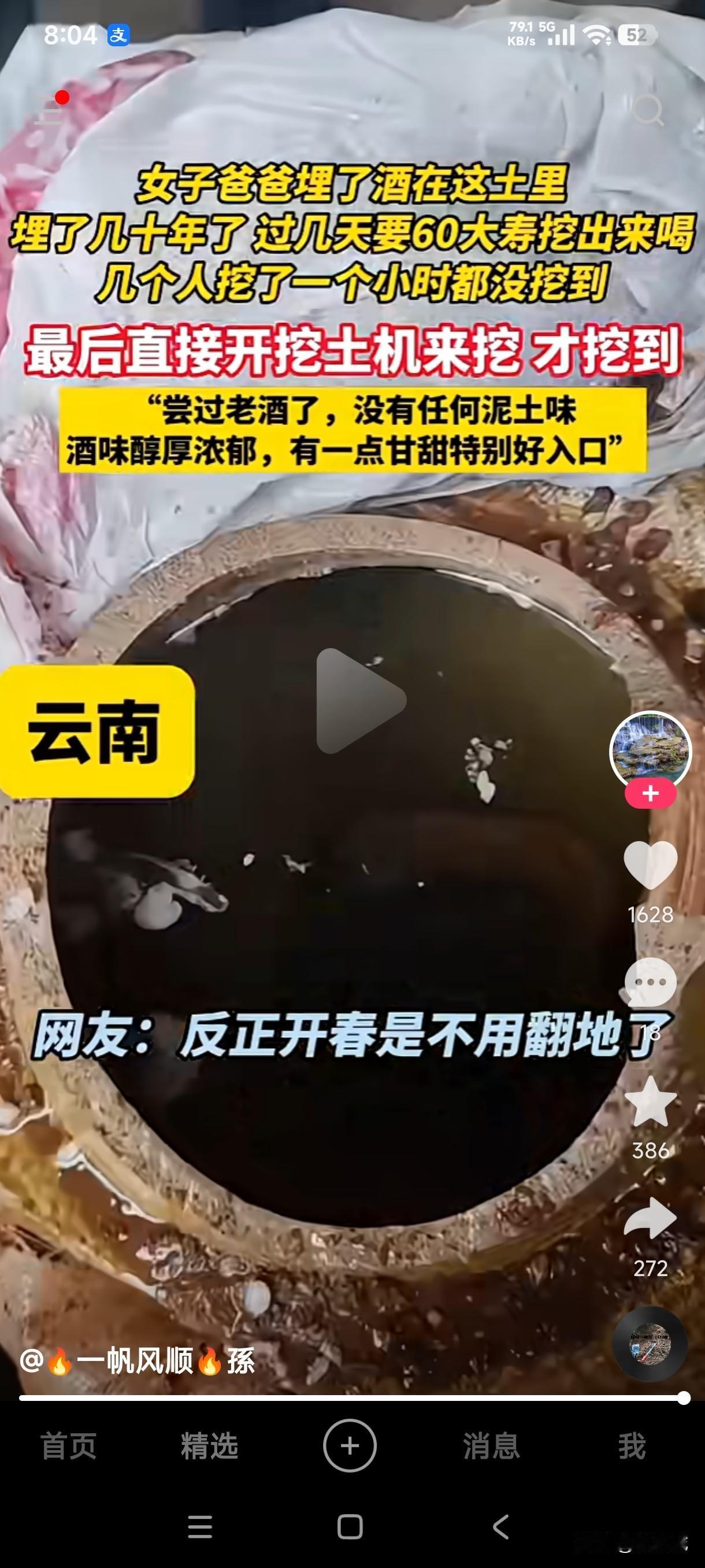 云南一女子称父亲过几天要过60大寿,准备把埋在土里几十年的酒拿出来喝,几个人用锄头挖了一个小时都没挖到,最后直接开挖土机才挖出来。 深埋地下几十年的酒真的有那么难挖到吗?当初埋的时候不就是在地下哪个位置吗?为什么过了几十年后挖的时候就找不到了?难不成地下的土质随着时间的沉淀和地理位置的因素在不断的发生变化,每时每刻都在发生移动,所以深埋地下几十年的酒没那么容易挖到? 几十年的老酒真的喝起来会有不一样的味道吗?深藏老酒是为了时隔多年喝起来口味甘甜,还是说埋在地下几十年的酒喝了能延年益寿容光焕发?挖个几十年的老酒居然连地都翻了,这老酒也挖到了,地也翻了,这算不算是两全其美了?
