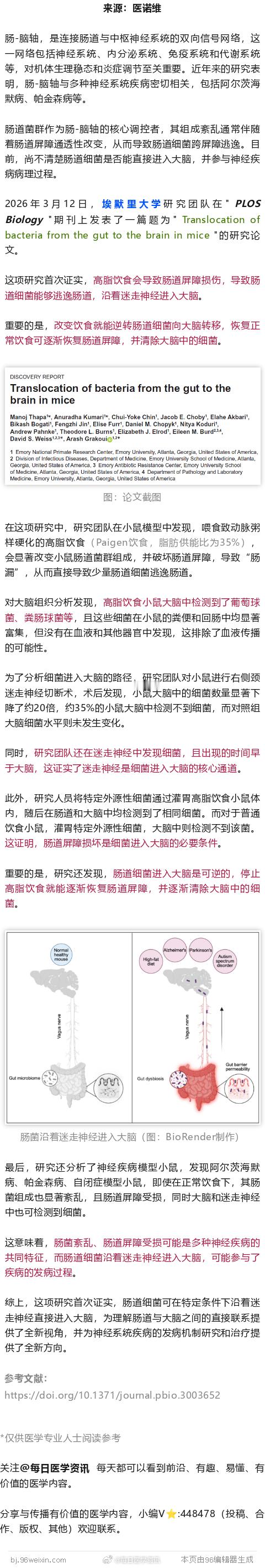 2026年3月12日,埃默里大学研究团队在" PLOS Biology "期刊上发表了一篇题为" Translocation of bacteria from the gut to the brain in mice "的研究论文。
