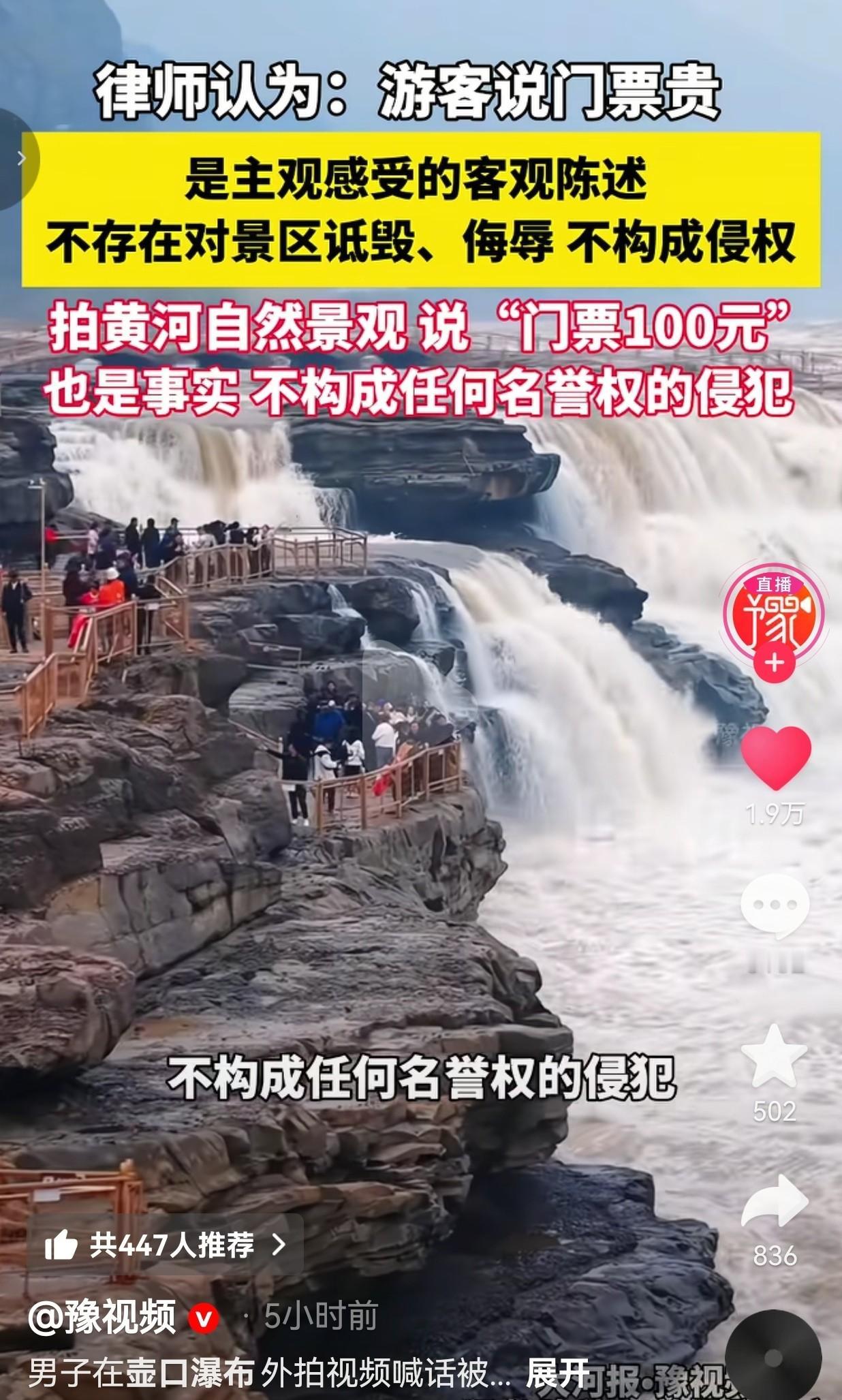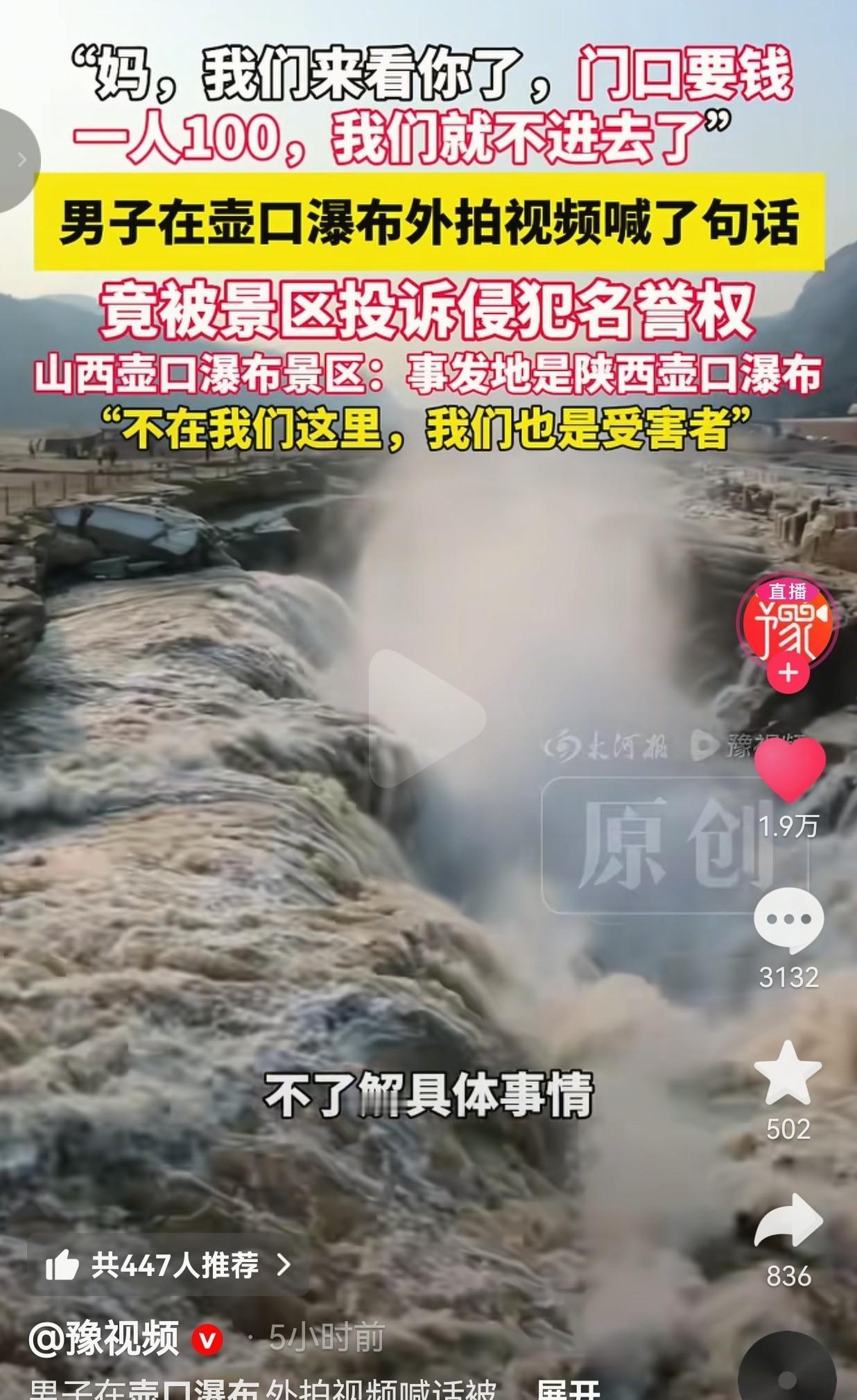 壶口瀑布喊妈被投诉, 景区急着甩锅, 游客到底说错啥了? 那天刷到一条短视频,一个女孩站在壶口边上笑着说:“妈,我们来看你了,门口要钱一人100,不进去了。”就这几句大实话,结果被人投诉下架了。 山西那边说事发地在陕西,陕西那边说“不太清楚”,两省景区互相推,谁也没去查视频里那块石头到底在哪。 门票其实120,含车票,但门口没写清楚,老人学生有优惠,可牌子藏在售票亭角落。 律师说了,讲价格、说贵、喊一声“妈”,都不违法。视频里没骂人,没造谣,连“壶口景区”四个字都没提全。 真要较真,那“喊妈”算侵权,黄河每年汛期喊“救命”是不是也得赔钱? 围挡确实高,把好视角全挡了,说是安全需要,可游客又不是来跳崖的。 本地人路过也要买票,拍张照还得踮脚。 这事闹这么大,不是因为话多,是因为没人愿意听一句真话。 一句真话,被当成刺。