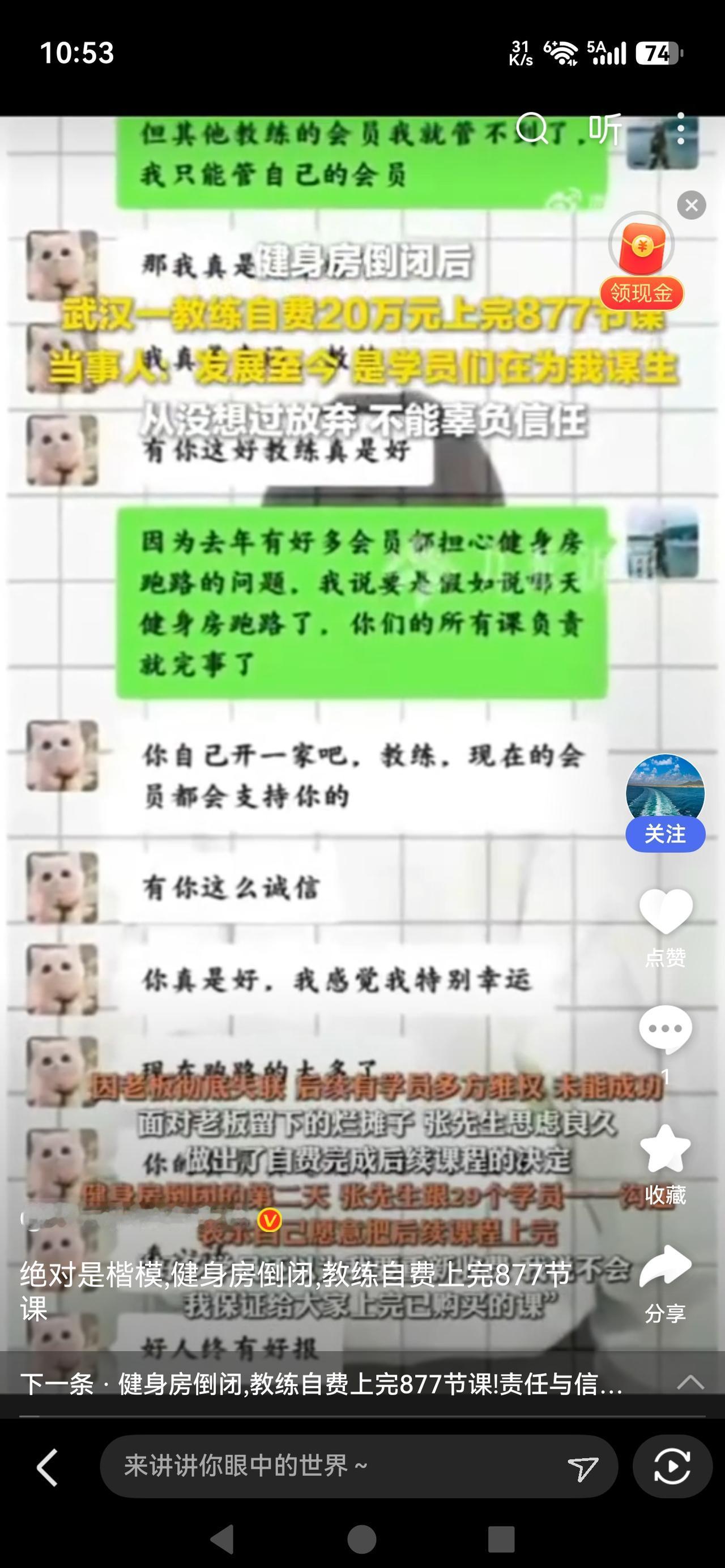 《老板跑路,教练自费20万坚守17个月!877节课的背后,是中国人最缺的“契约精神”》 武汉一家健身房倒闭,老板跑路,学员课时费打水漂,教练工资被拖欠。张教练自己4万多元工资未结,却扛起29名学员、共877节、价值26万元的课程。他自费租场地、买保险,甚至卖掉爱车,耗时17个月,自掏近20万,把所有课程全部上完,不额外收学员一分钱。 这年头,健身房跑路、预付费踩坑早已不是新闻。老板卷钱消失,员工工资白干,会员投诉无门,几乎是标准剧本。大家都习惯了“事不关己高高挂起”,能维权成功就算烧高香,没人会指望有人来兜底。 可这位教练,偏偏做了最“傻”的选择。他不欠谁的,却把别人的损失扛在自己肩上。一天最多上8节课,累到嗓子沙哑,躺在瑜伽垫上就能睡着。有人说他笨,有人笑他傻,可他只说一句:不能辜负信任。 这877节课,练的不是肌肉,是良心。在这个人人谈止损、讲利益的时代,他用最笨的方式,守住了最值钱的东西——诚信。钱没了可以再赚,信任塌了,一辈子都抬不起头。 他赢回的不只是学员的追随,更是普通人对善良与责任的信仰。真正的靠谱,从不是顺境时的热情,而是绝境时的担当。为这位中国好教练点赞,愿老实人不吃亏,守信者路更宽!热点话题 武汉教练自费20万上课 中国好教练
