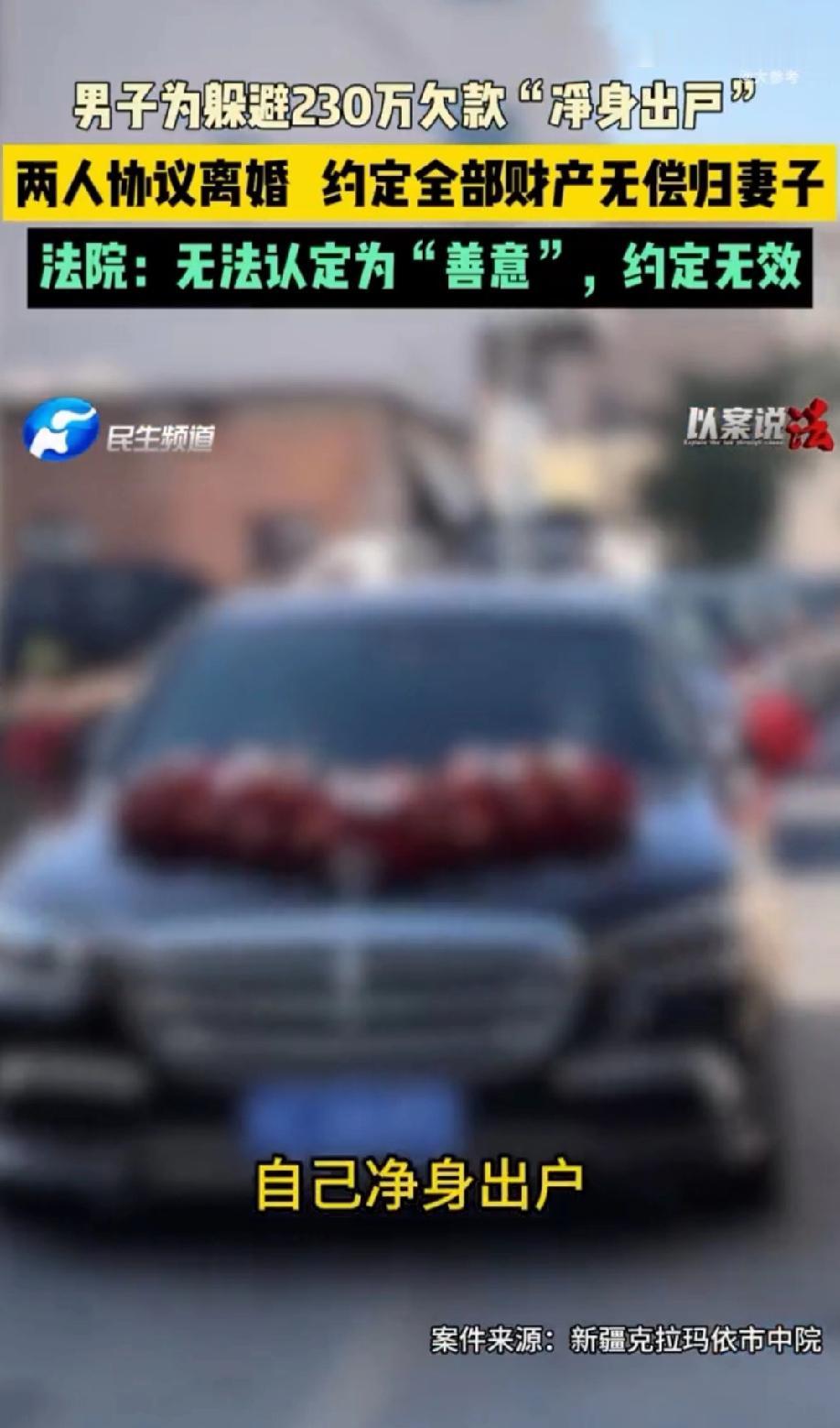 “老赖玩出了新高度!”新疆克拉玛依,男子借款230万后,到期赖着不还,债主没办法,只能把男子告上法院,债主赢了官司后,男子依旧不还钱,还想办法躲避债务。为了能够老赖到底,男子和妻子协议离婚,把名下所有的财产无偿赠与妻子,他选择净身出户,以为这样就拿他没办法,不料,法院出其不意,直接拆穿男子的骗局。 男子帅某某是个聪明的人,但他把聪明用错了地方,想透支信用换一笔230万的借款,没想到聪明反被聪明误。 几年前,帅某某因为做生意需要资金周转,找到了朋友张某,开口借了230万。 当时两人关系不错,张某想着帮朋友一把,也没多想就把钱借了出去,借款合同写得清清楚楚,还款日期也定好了,双方都签了字。 张某不知道,帅某某早就有了透支信用的打算,这笔钱他压根就没打算还,从一开始就是一场老赖的骗局。 到了还款的日子,帅某某像变了个人似的,张某上门催债,他不是推脱说生意不好,就是避而不见。 张某心里越来越没底,他给帅某某打电话,对方要么不接,要么接了就说两句“再等等”就挂断。 一次次的不还钱,让张某看清了帅某某,他开始后悔自己当初借钱时的爽快,仅剩的一点情谊也消磨殆尽。 无奈之下,张某只好把帅某某告上法庭。 证据确凿,事实清楚,这官司倒是很快就打赢了,法院也判决帅某某限期还钱。 张某拿着判决书,心想这下总该有个结果了吧。可他万万没想到,帅某某居然打起了更歪的主意。 帅某某回到家,翻来覆去睡不着。他知道法院判决下来了,钱是躲不掉了,可他又实在不想还。琢磨来琢磨去,他想到了一个“绝妙”的主意,假离婚。 他把这个想法跟妻子一说,妻子起初有些犹豫。 帅某某就劝妻子:咱们先把财产都转到你名下,我净身出户,这样债主就拿咱们没办法了。等这事过去了,咱们再复婚。 妻子虽然也觉得不地道,但终究拗不过帅某某,最终还是点了头。 两人很快办理了离婚手续,离婚协议上写得清清楚楚:家里的存款、房产、车子,全部无偿归妻子所有,帅某某一分钱不要,净身出户。 办完手续那天,帅某某长舒一口气,心想这下张某肯定拿他没辙了。 张某这边,等来等去等不到钱。到期后,他去法院申请强制执行,却发现帅某某名下已经什么都没有了。 张某觉得不对劲,一查才知道,帅某某刚离了婚,把所有财产都转给了前妻。 看到帅某某这么没有底线,想出这种损招不还钱,张某又一纸诉状把帅某某和他的前妻告上法庭,要求撤销他们离婚时的财产分割协议。 法庭上,帅某某还挺有理,狡辩说离婚是他的私事,财产怎么分是自己的自由。 法院经过审理,认为帅某某这是在债务已经产生、法院已经判决的情况下,恶意转移财产,目的是逃避债务。 他和妻子的财产分割协议,表面上是离婚,实际上是在帮帅某某躲债,损害了债权人张某的利益。 最终,法院依法判决,撤销帅某某和妻子在离婚协议中关于财产分割的约定。也就是说,那些转给前妻的财产,还是得拿出来还债。 帅某某本以为净身出户就能躲过一劫,没想到法院一眼就看穿了他的把戏。 法律是公平公正的,帅某某这种老赖玩得再高,也终究逃不过法网恢恢,想靠耍小聪明躲债,最后只能是搬起石头砸自己的脚。 《刑法》第三百一十三条规定:对人民法院的判决、裁定有能力执行而拒不执行,情节严重的,处三年以下有期徒刑、拘役或者罚金;情节特别严重的,处三年以上七年以下有期徒刑,并处罚金。 本案中,帅某某经法院判决偿还230万元债务,属于有能力执行。 但他为逃避履行,通过假离婚将房产、车辆、存款等财产无偿赠与前妻,恶意转移责任财产,导致判决无法执行,符合拒不执行且情节严重的构罪标准。 如果帅某某执意不还钱,想通过其他方法继续逃避债务,那必将受到刑事处罚,后果就不是还钱这么简单了。